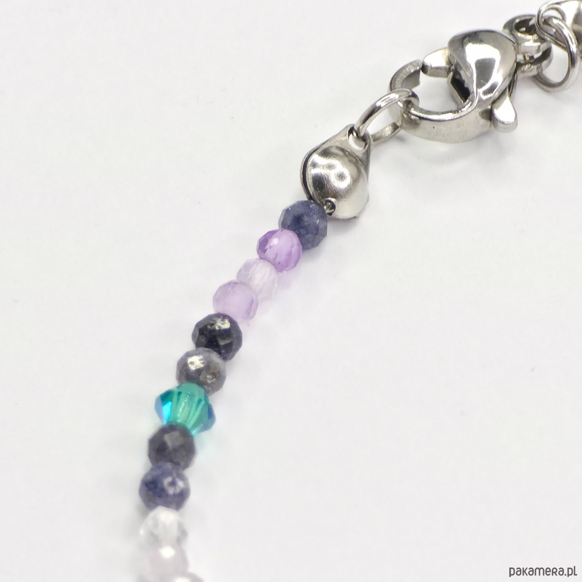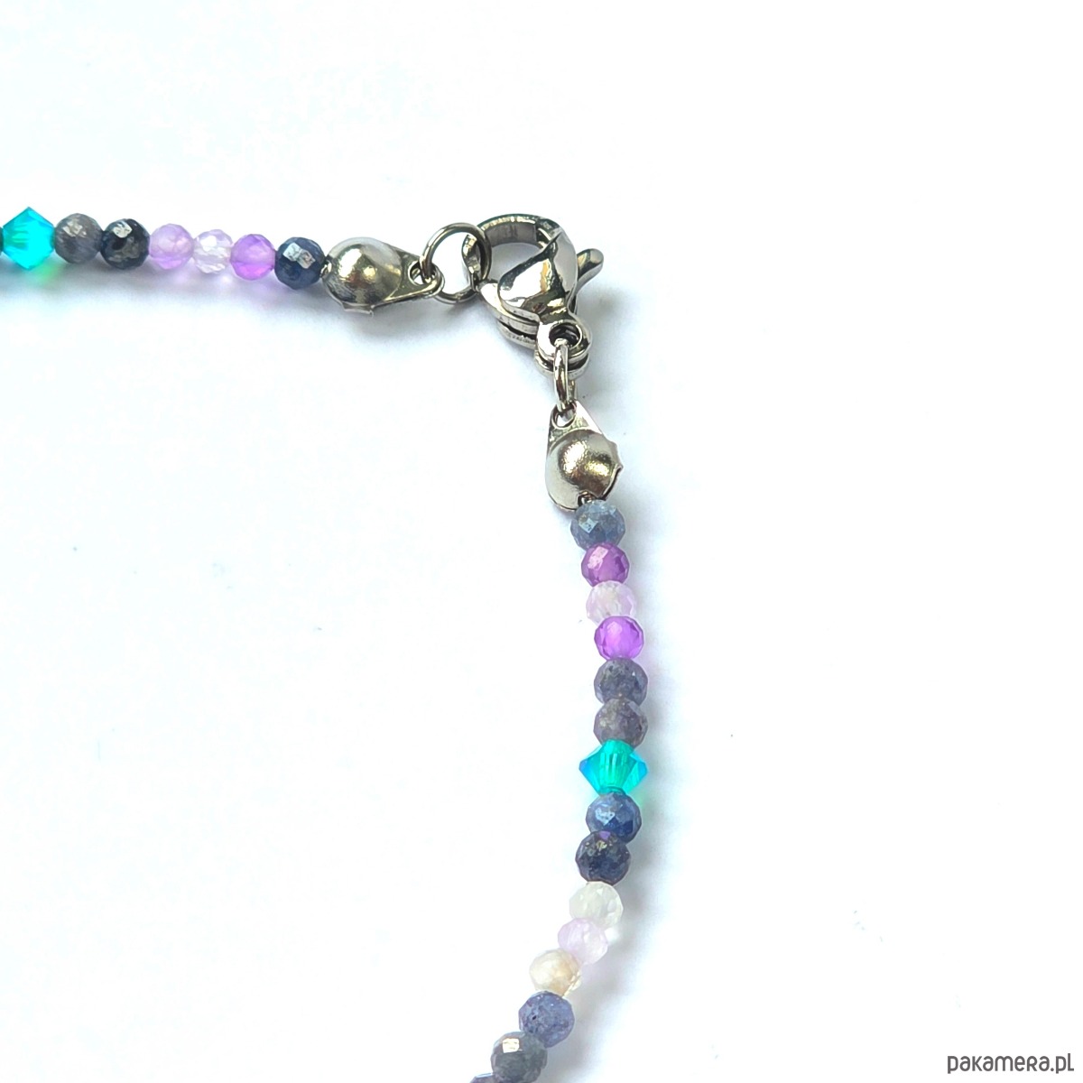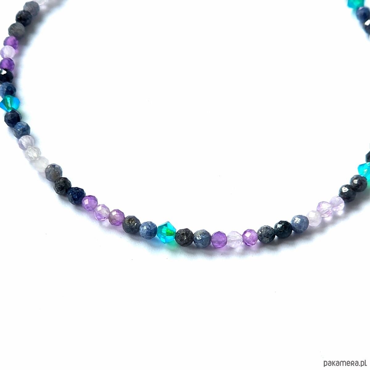 Materiały: Szafir, Ametyst, kryształki Bicone (szkło), stal chirurgiczna, żyłka wędkarska Fluorocarbon.