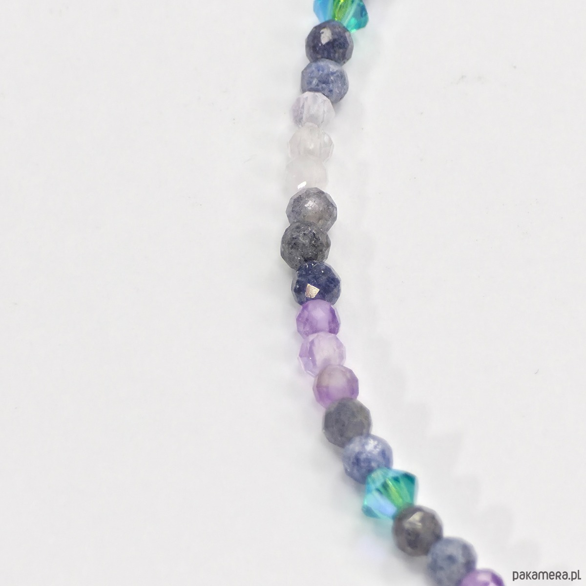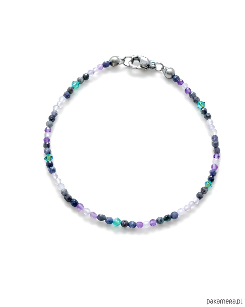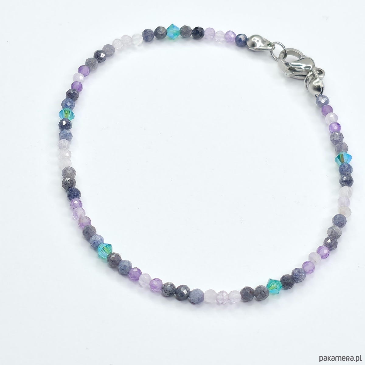 Materiały: Szafir, Ametyst, kryształki Bicone (szkło), stal chirurgiczna, żyłka wędkarska Fluorocarbon.