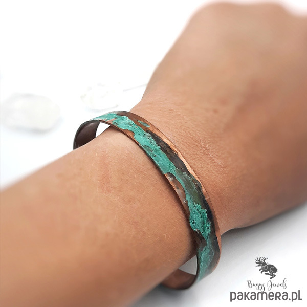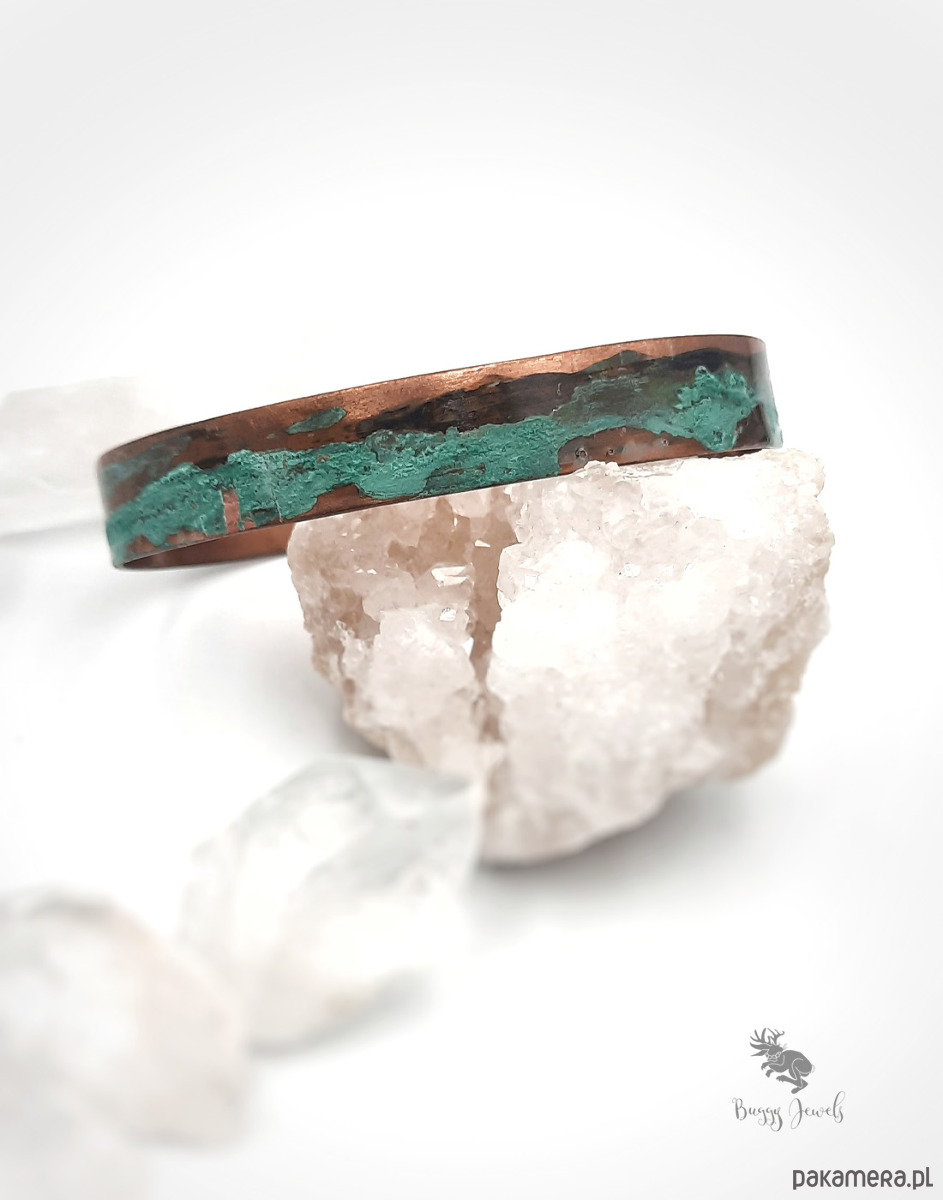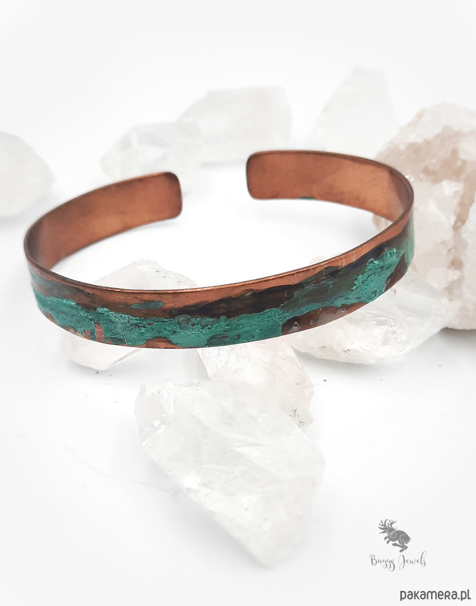Bransoletka rozginana wykonana z miedzi i dodatkowo patynowana. Pokryta bezbarwnym lakierem akrylowym.