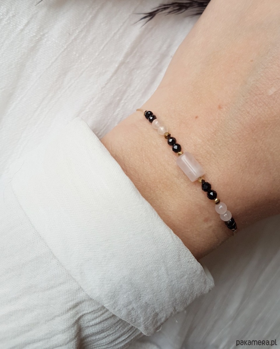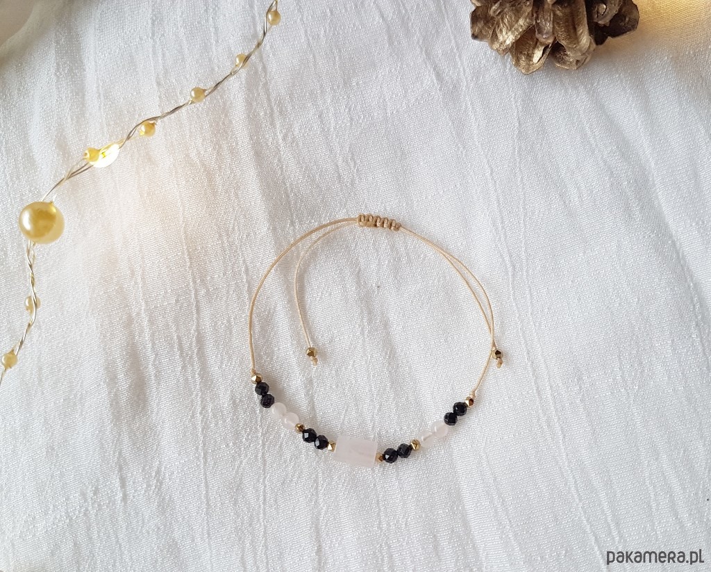Subtelna bransoletka ochronna z bryłką Kwarcu Różowego oraz Czarnym Turmalinem.
