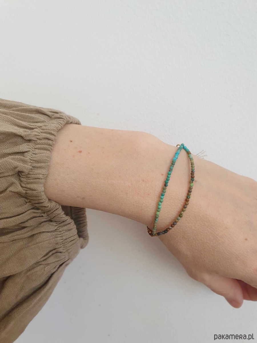 Minimalistyczna delikatna bransoletka z kolekcji BOHO. Tworzona ręcznie z kamieni naturalnych, elementów ze stali szlachetnej (antyalergicznej), turkusem, hematytem i lnianym chwostem.