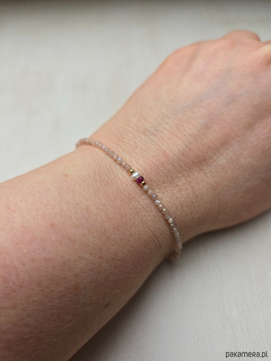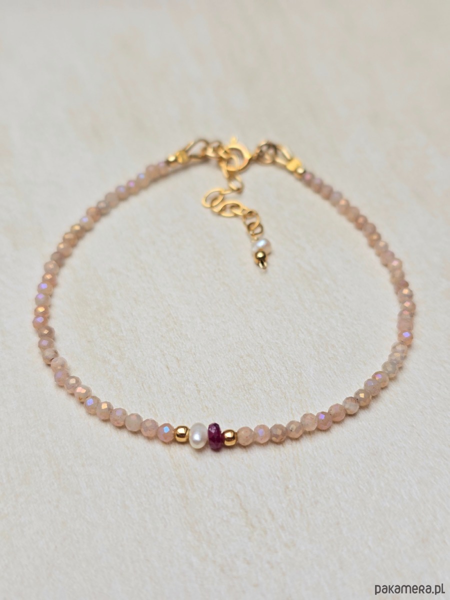Ultra delikatna, bransoletka z malutkich 2mm galwanizowanych kamieni słonecznych, z akcentem rubinu i perełki.