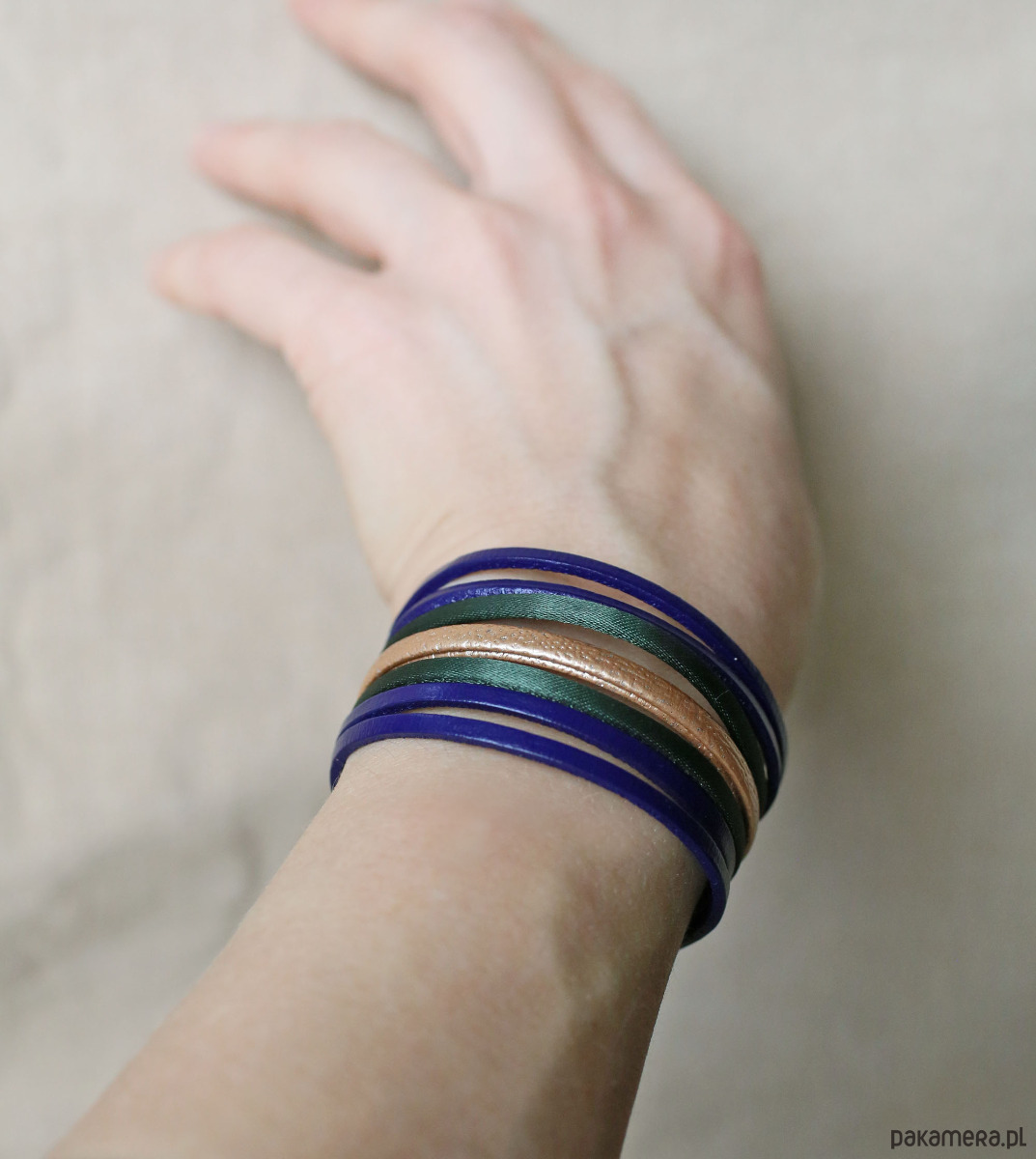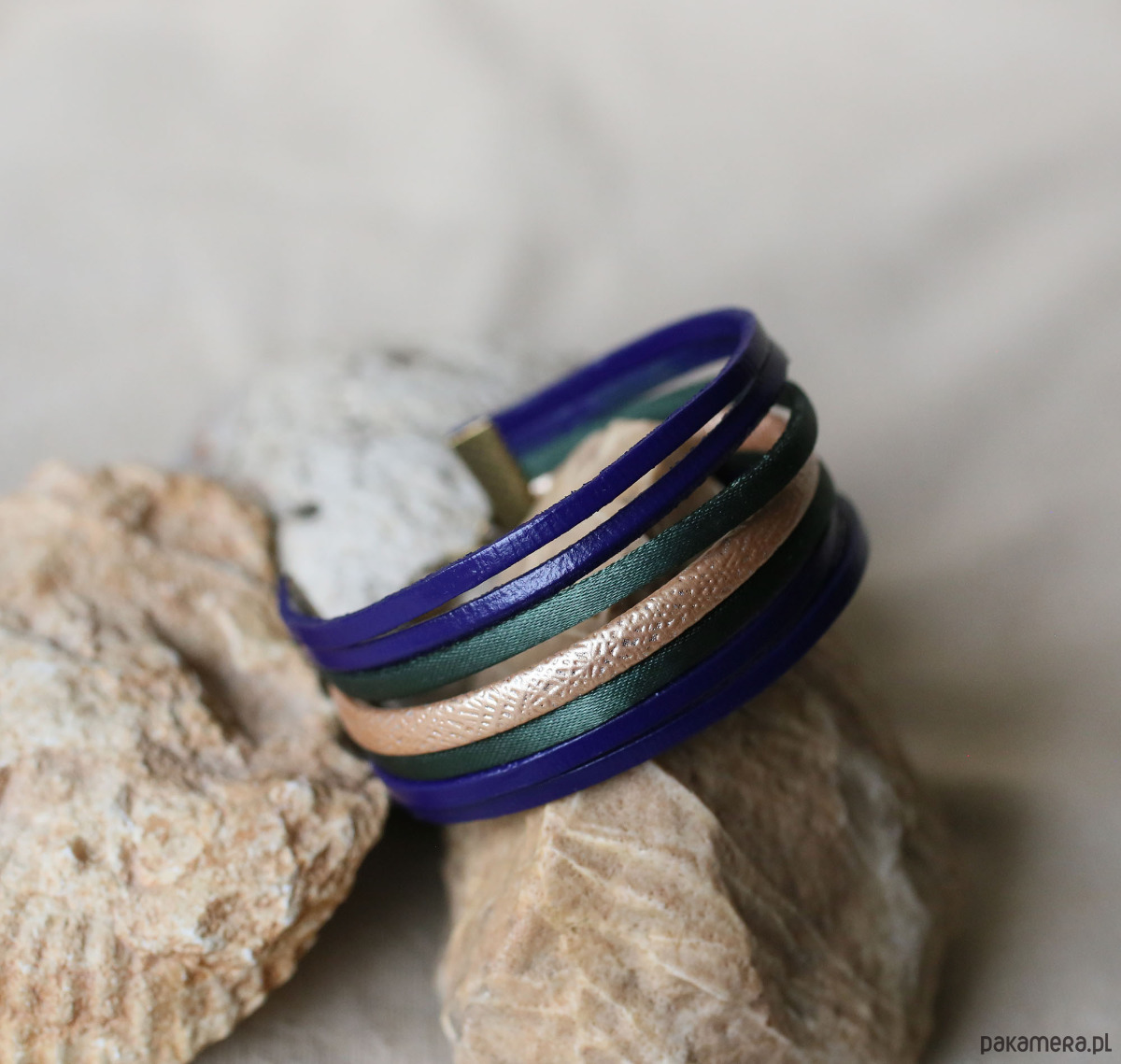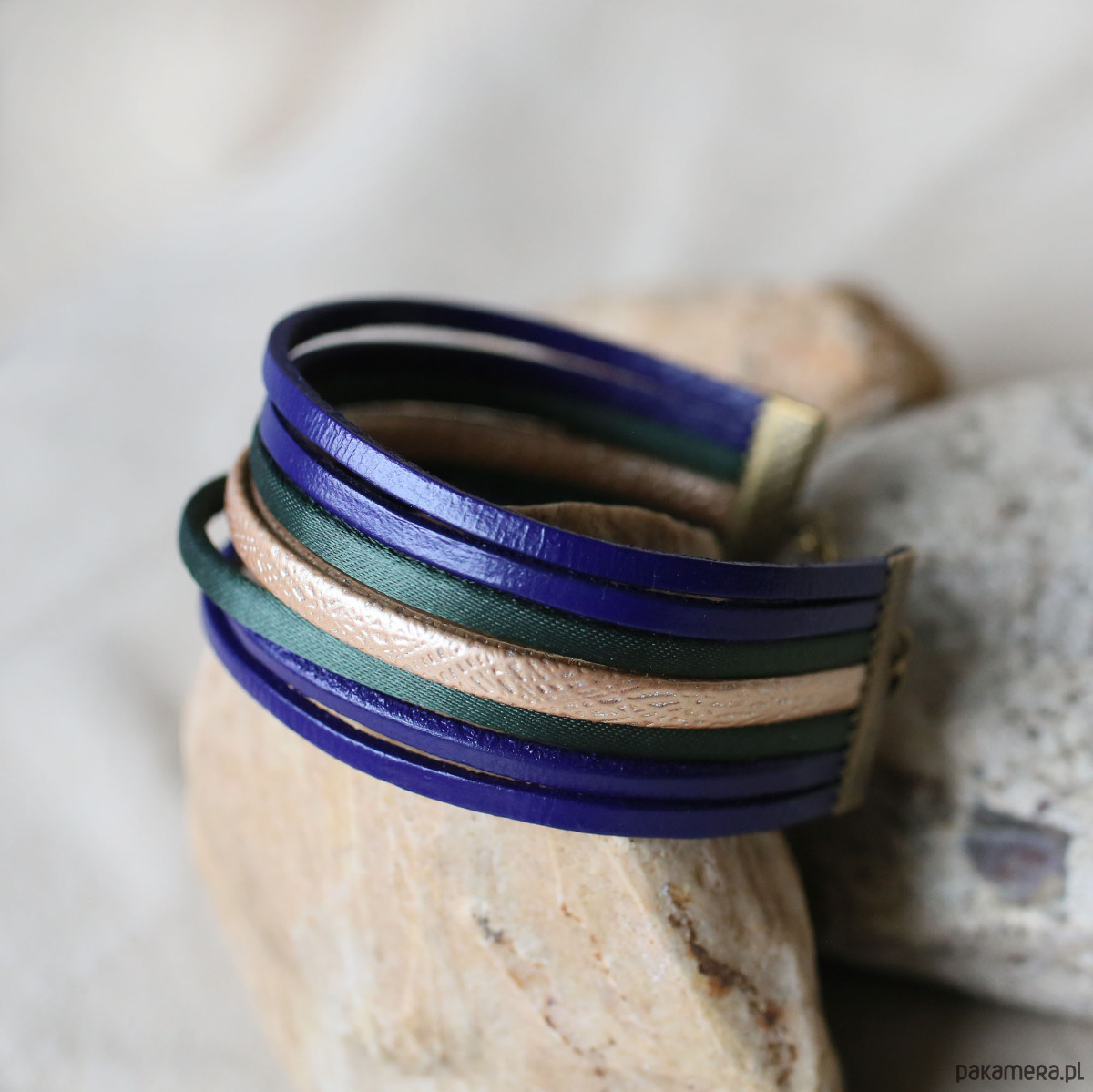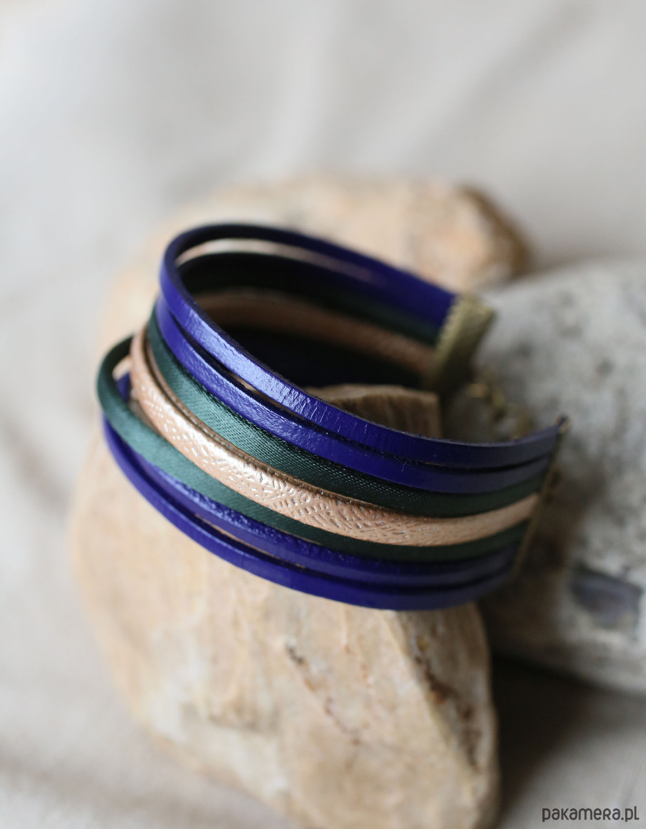 Bransoletka w stylu boho, wykonana z różnobarwnych rzemyków. Zapięcie metalowe, w kolorze brązu. Pasuje na nadgarstek o obwodzie 15-16 cm.