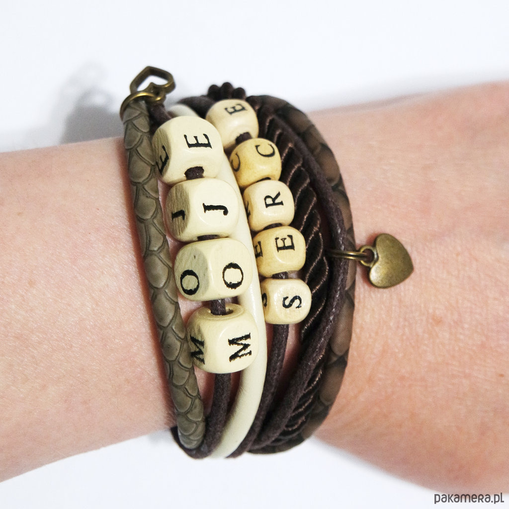 Bransoletka zrobiona jest z rzemieni ze skóry ekologicznej, sznurka oraz drewnianych koralików. Z napisem "Moje serce".