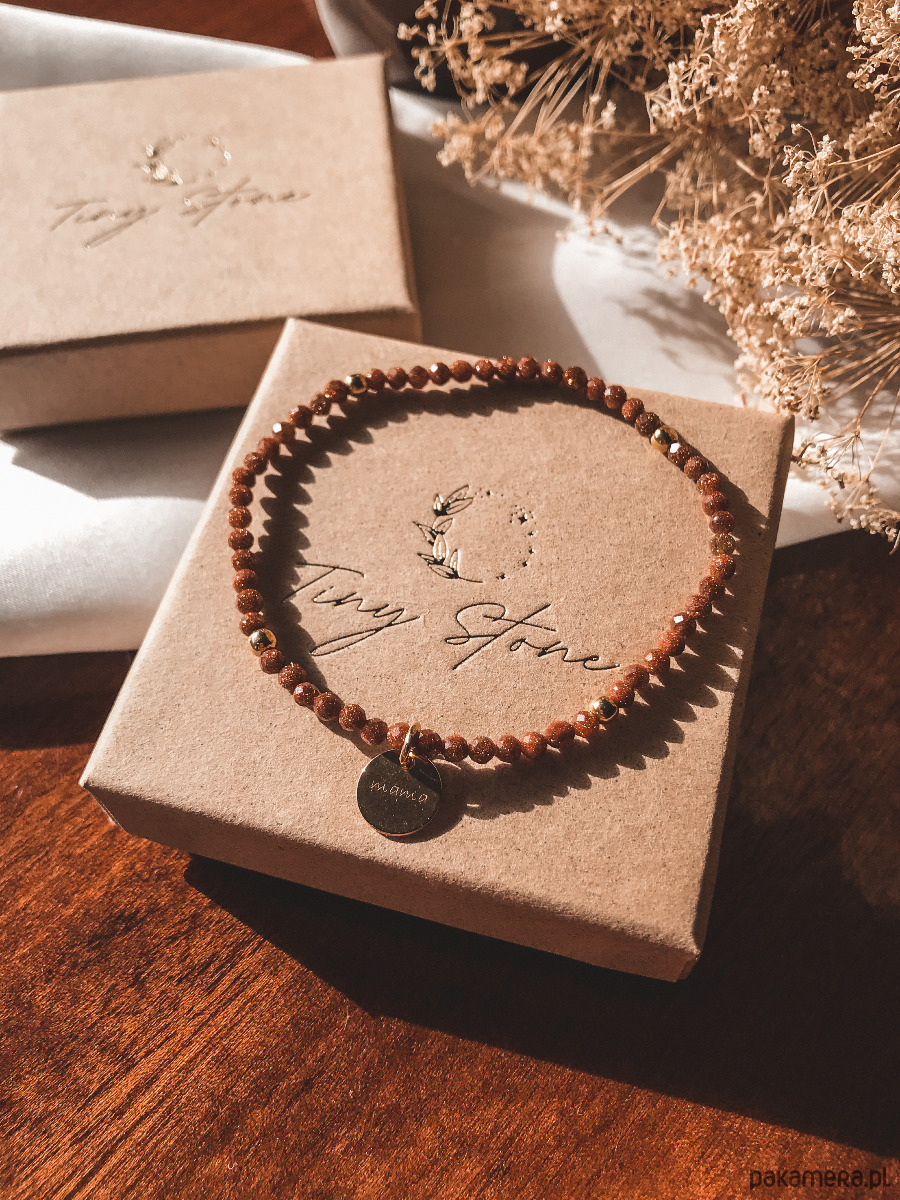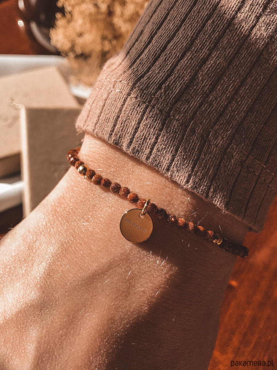 Bransoletka wykonana została na elastycznej gumce jubilerskiej z kamieni piasku pustyni oraz srebrnych koralików próby 925 pozłacanych 24K złotem. Do bransoletki dołączona jest zawieszka z napisem "Mama" wykonana ze srebra próby 925 pozłacanego 24k złotem. Wyjątkowy, brązowy kolor piasku pustyni w połączeniu z połyskującymi drobinkami wygląda bardzo elegancko i dostojnie. Pięknie prezentuje się w promieniach słońca.