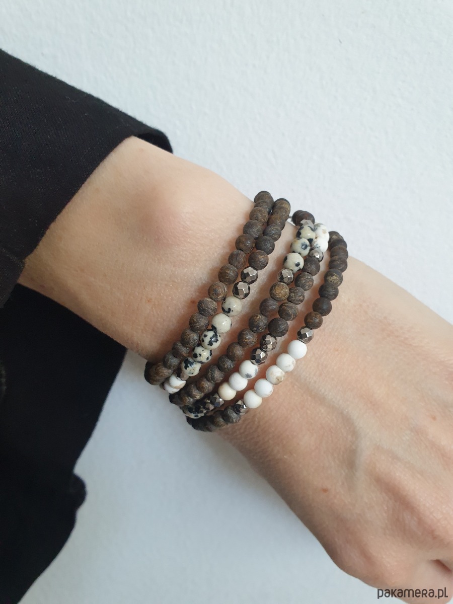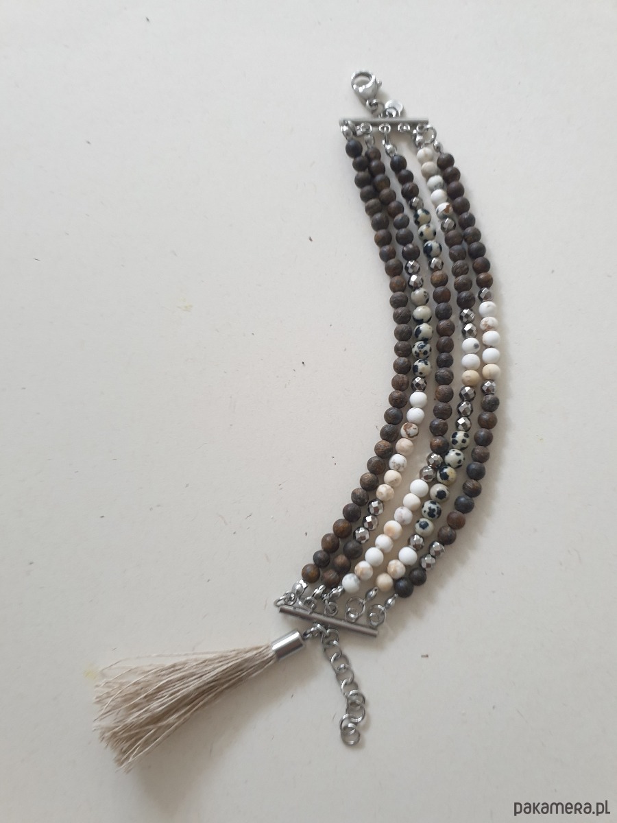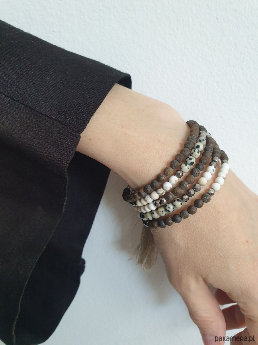 Bransoletka MOON jaspis dalmatyński, bronzyt, howlit, hematyt, lniany chwost