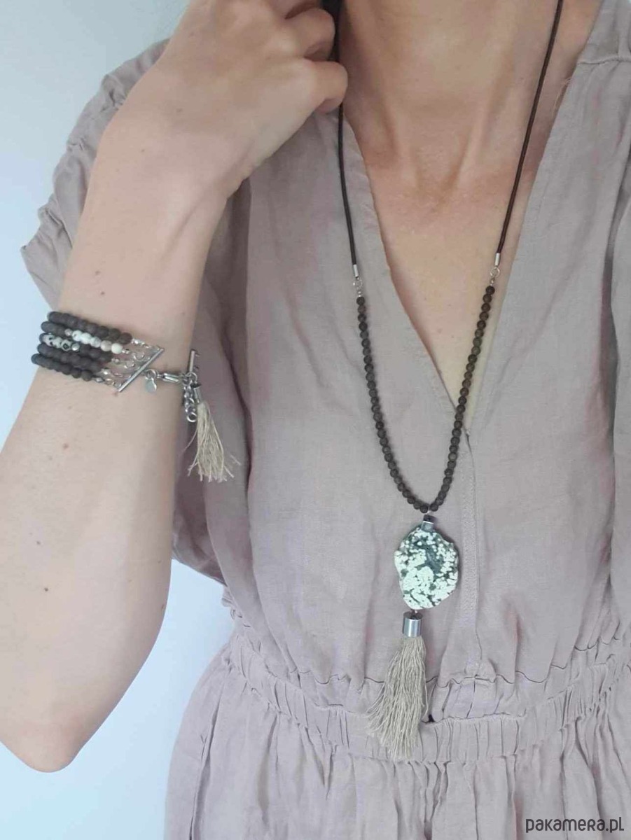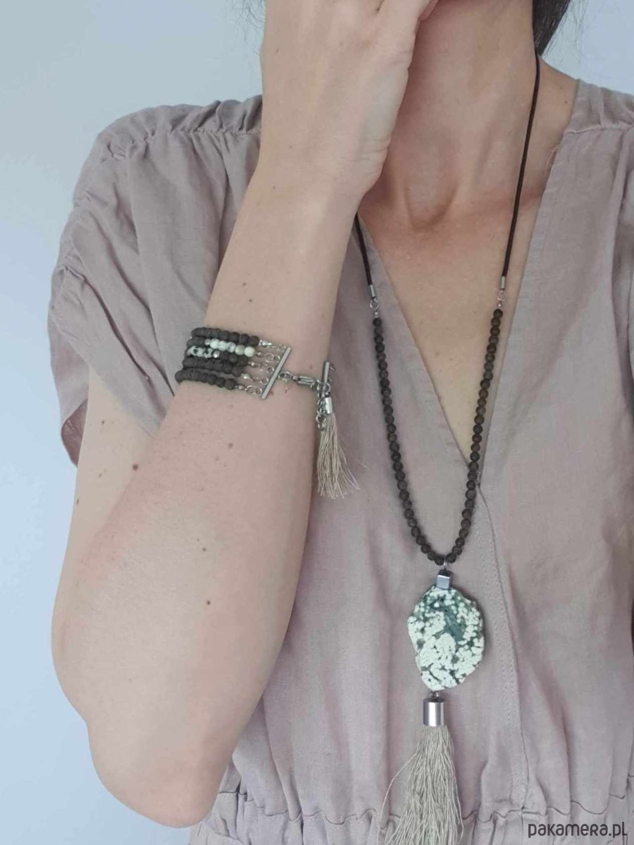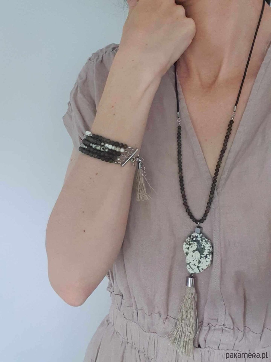 Bransoletka MOON jaspis dalmatyński, bronzyt, howlit, hematyt, lniany chwost