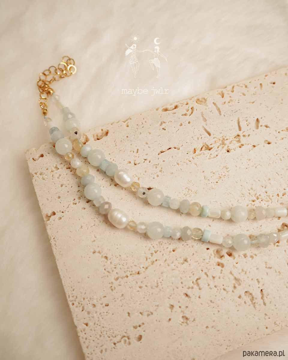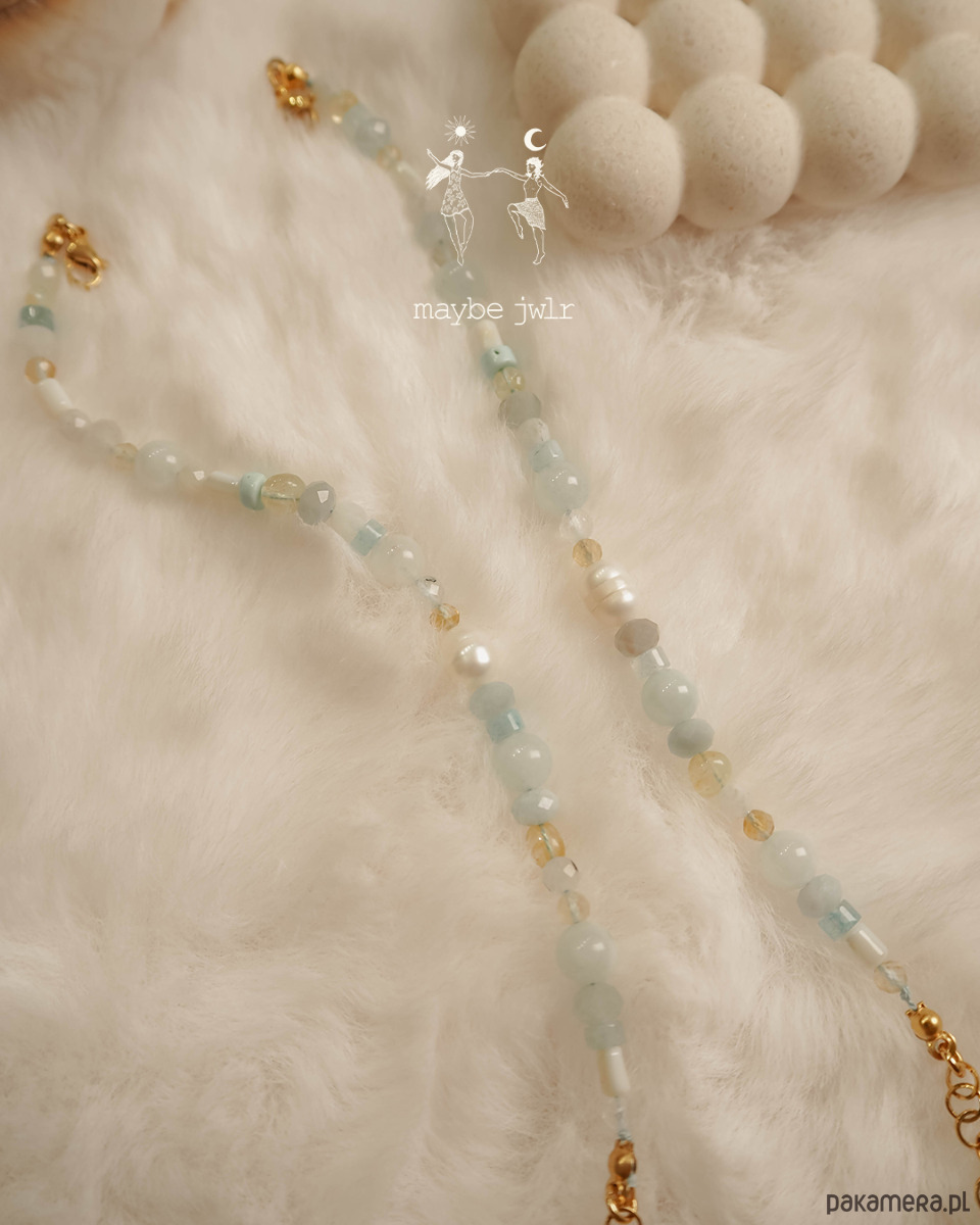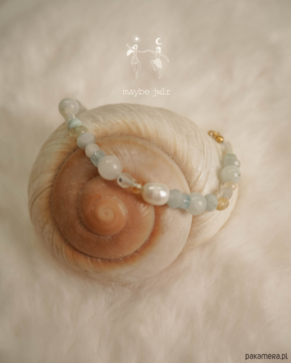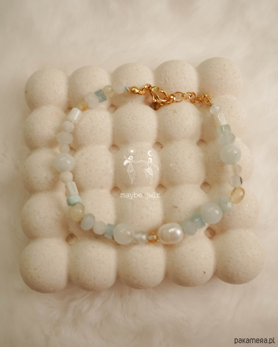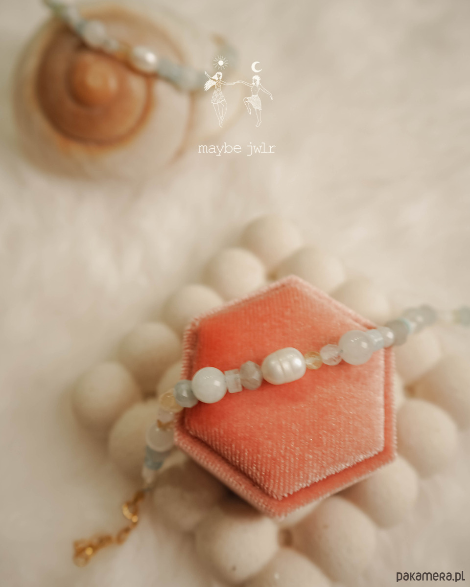 Bransoletka na rękę z kamieni naturalnych takich jak kamienie księżycowe, akwamaryny, jadeity, perły, cytryny.