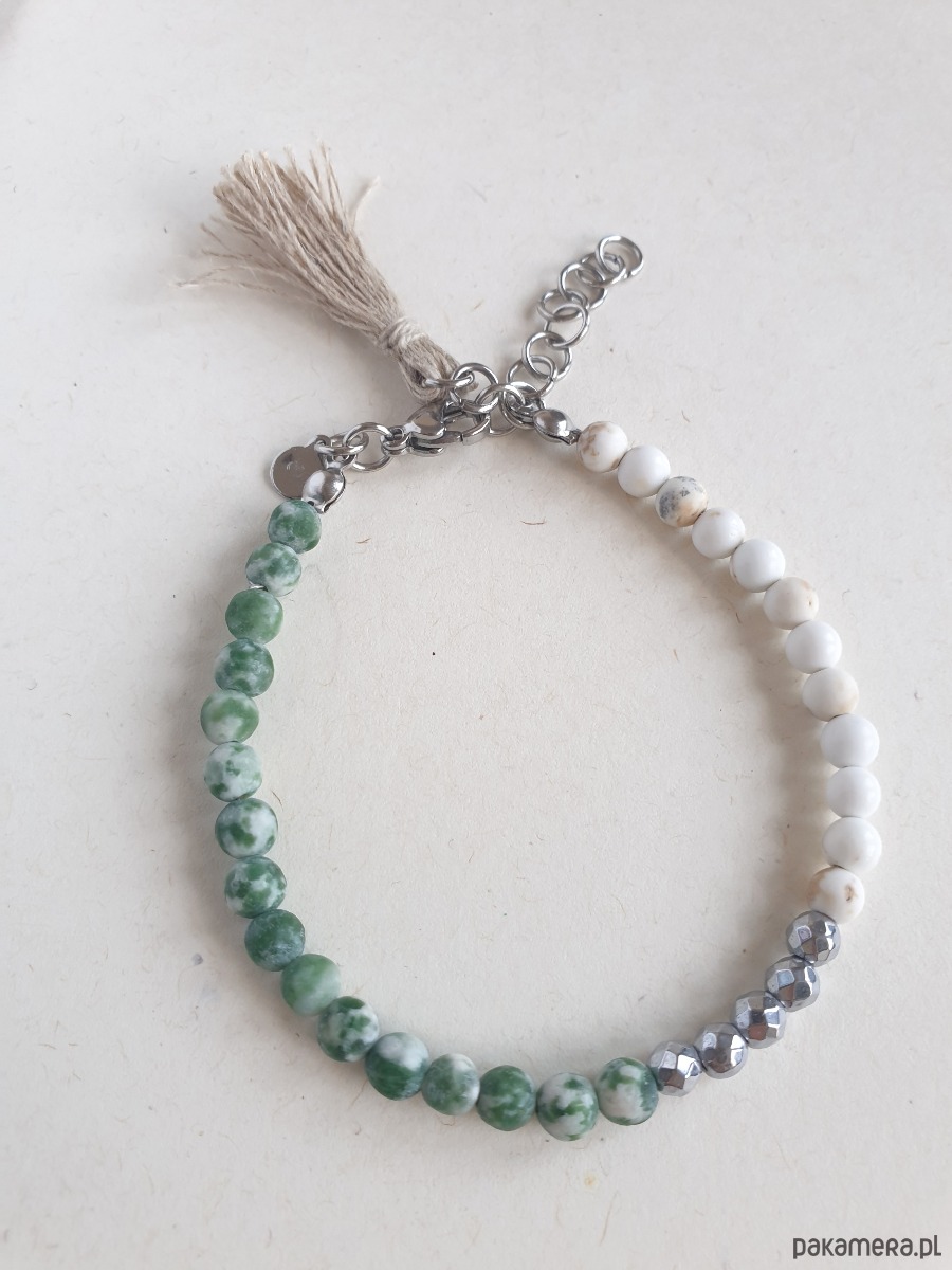 Minimalistyczna delikatna bransoletka MULTI MIDI. Tworzona ręcznie z kamieni naturalnych, elementów ze stali szlachetnej (antyalergicznej) i lnianego chwosta. W tej - kulka howlit kremowy, jaspis zielony, fasetowany hematyt.