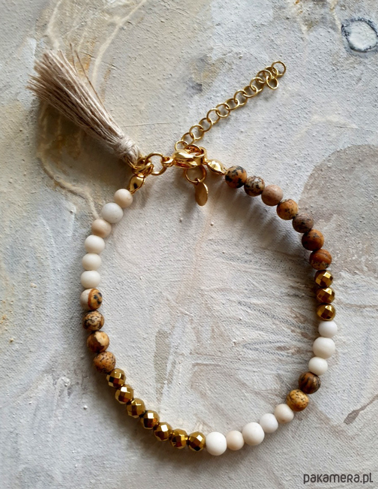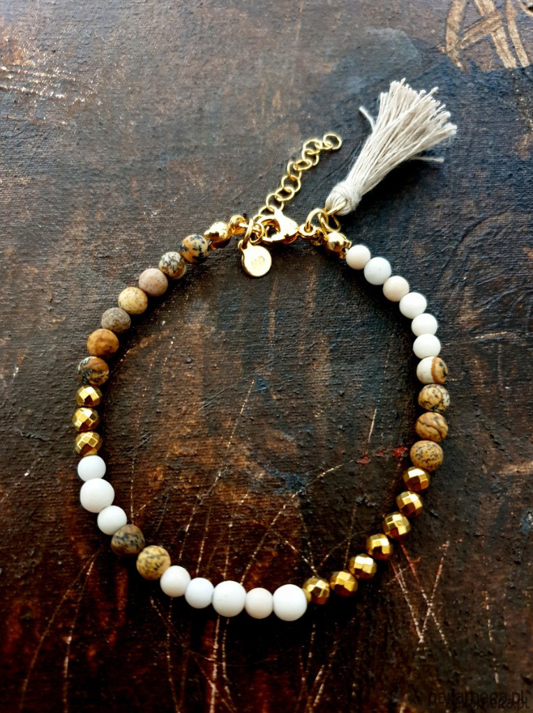 Minimalistyczna delikatna bransoletka MULTI MIDI. Tworzona ręcznie z kamieni naturalnych, elementów ze złoconej stali szlachetnej (antyalergicznej) i lnianego chwosta. W tej - matowa kulka jaspis obrazkowy, matowa kulka kamień rzeczny, fasetowany złoty hematyt.