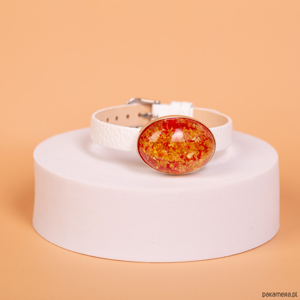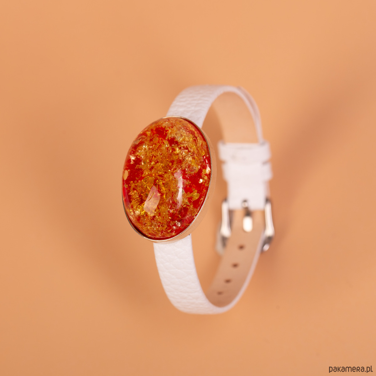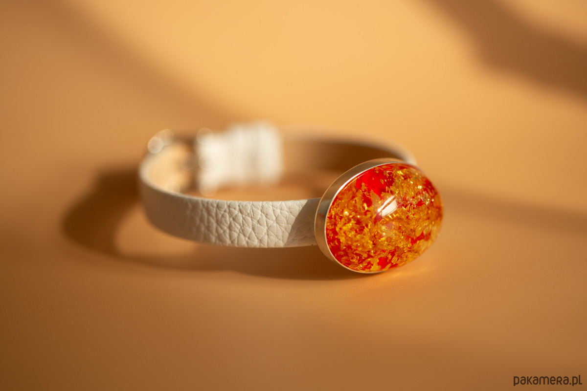 Oryginalna bransoletka z eleganckim białym paskiem, w której centralną ozdobę stanowi barwiony bursztyn oprawiony w srebro próby 925. Bursztyn o intensywnej, czerwono‑złotej barwie mieni się wewnętrznymi refleksami, nadając biżuterii wyjątkowego, świetlistego charakteru. Srebrny element został wykonany ręcznie, dzięki czemu idealnie dopasowuje się do owalnego kształtu bursztynu.