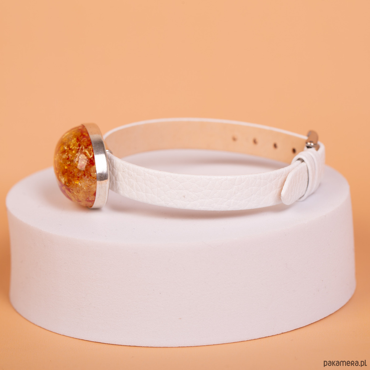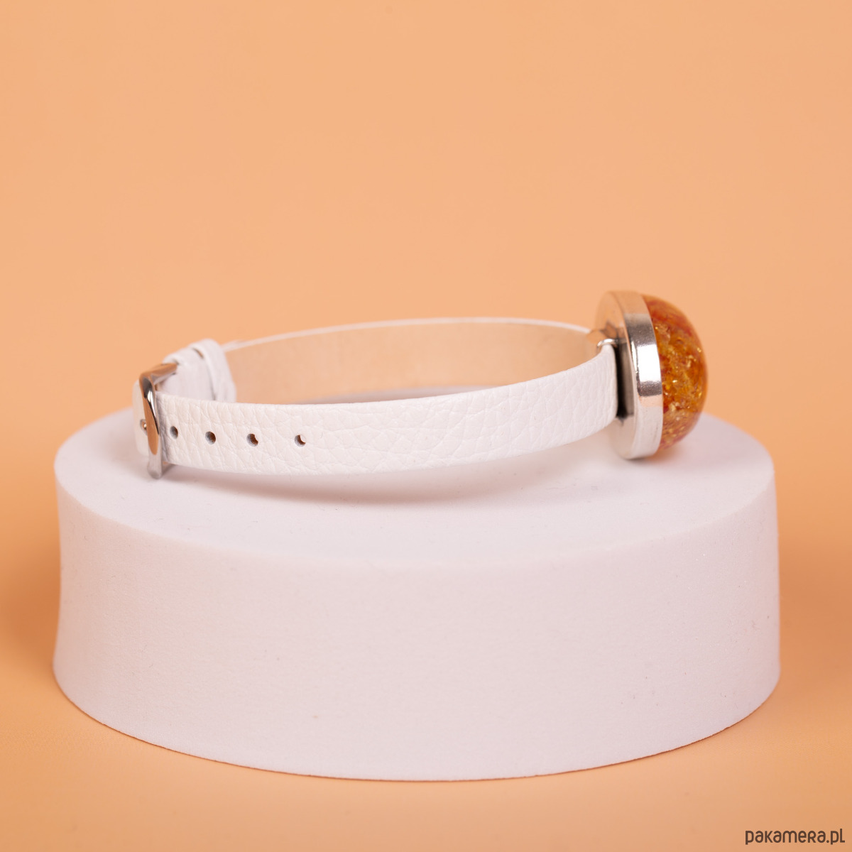 Bransoletka na białym pasku z bursztynem barwionym