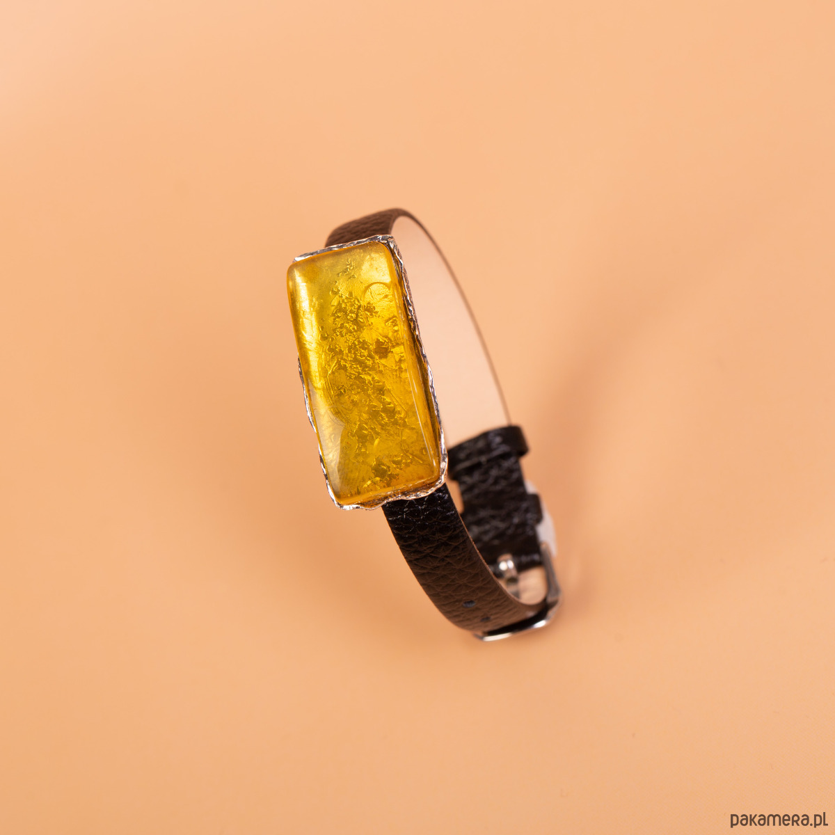 Elegancka bransoleta łącząca odcień czarnej skóry z naturalnym blaskiem bursztynu bałtyckiego. Centralnym punktem projektu jest prostokątna bryła bursztynu o głębokiej, miodowo-złotej barwie i wysokiej przejrzystości. Ta szlachetna, zastygła żywica została osadzona w ręcznie wykonanej oprawie ze srebra próby 925, która precyzyjnie go otula, podkreślając jego geometryczną formę.