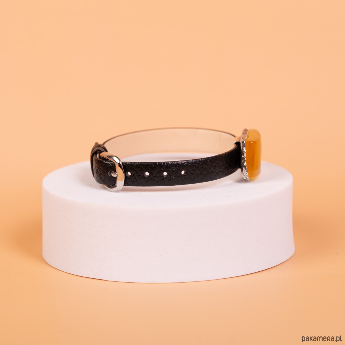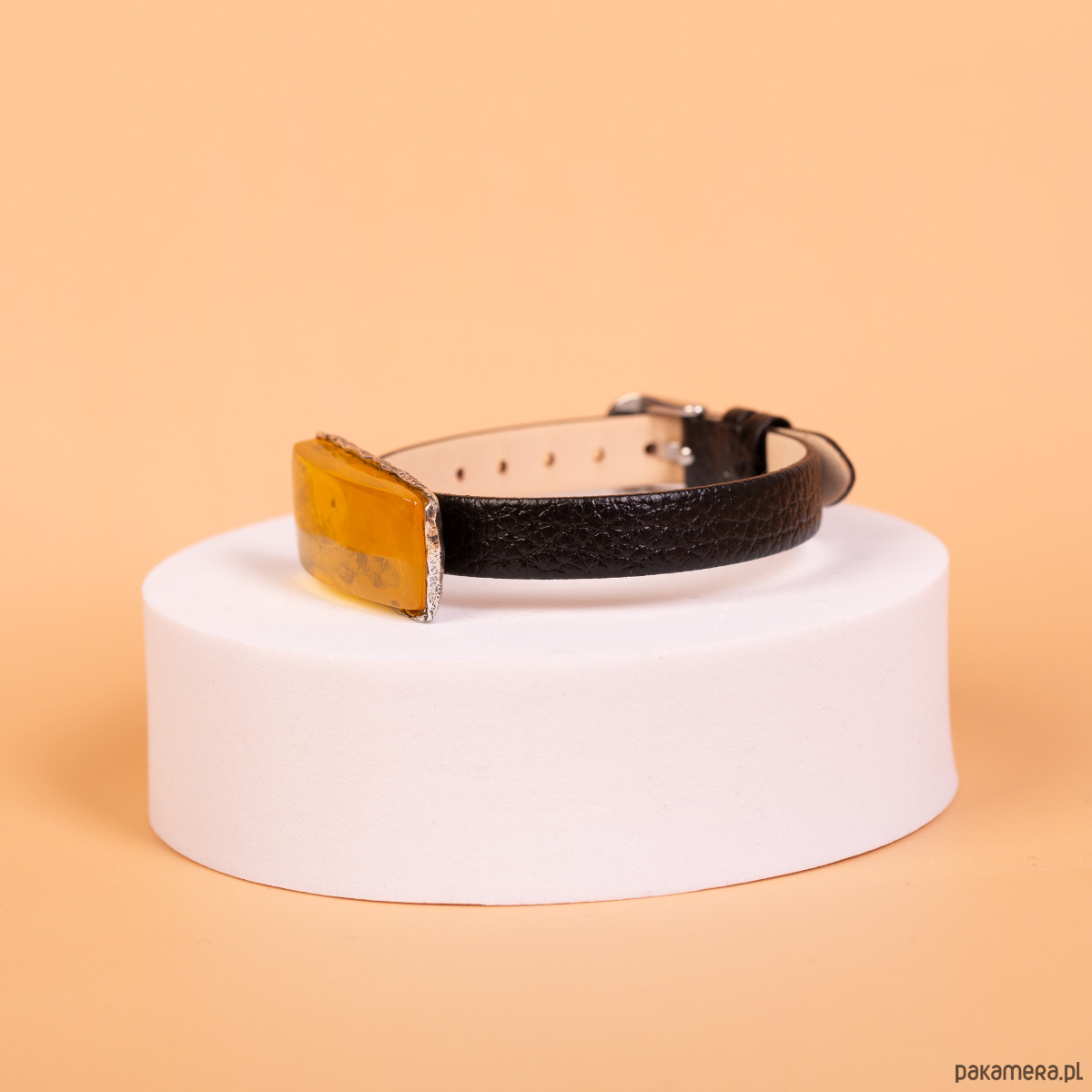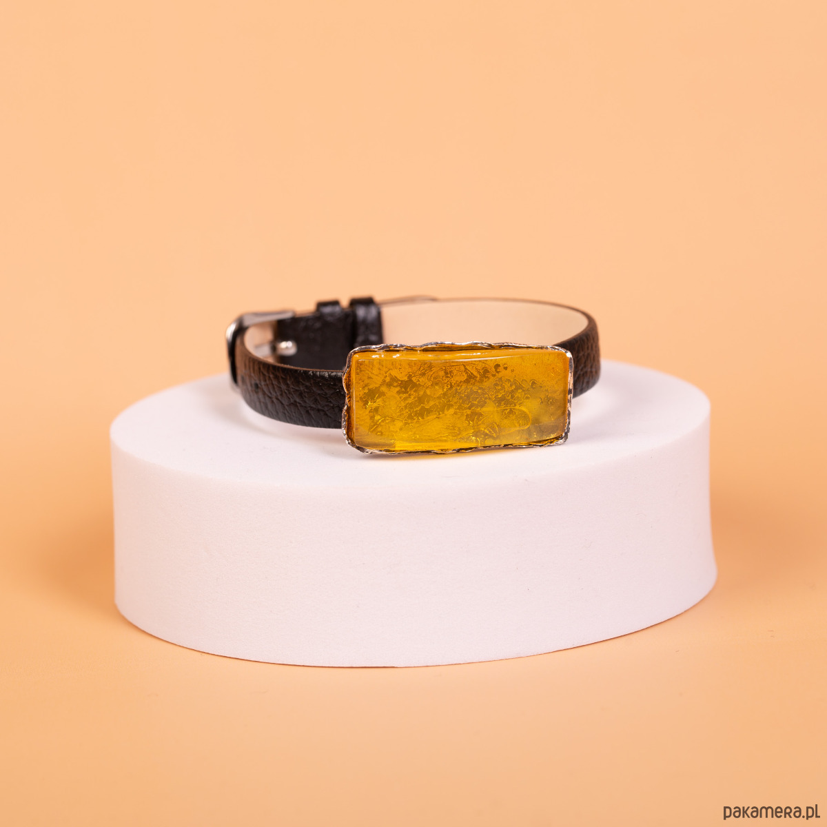 Forma i charakter: Bransoleta wyróżnia się nowoczesnym, minimalistycznym designem inspirowanym klasycznym paskiem zegarkowym. Połączenie fakturowanej skóry z lśniącym bursztynem tworzy harmonijną kompozycję. Metalowe elementy paska w kolorze srebra dodają biżuterii subtelnego luksusu i nowoczesnego sznytu. Dzięki zapięciu na klamerkę bransoleta oferuje szeroki zakres regulacji, co pozwala na idealne dopasowanie do nadgarstka.