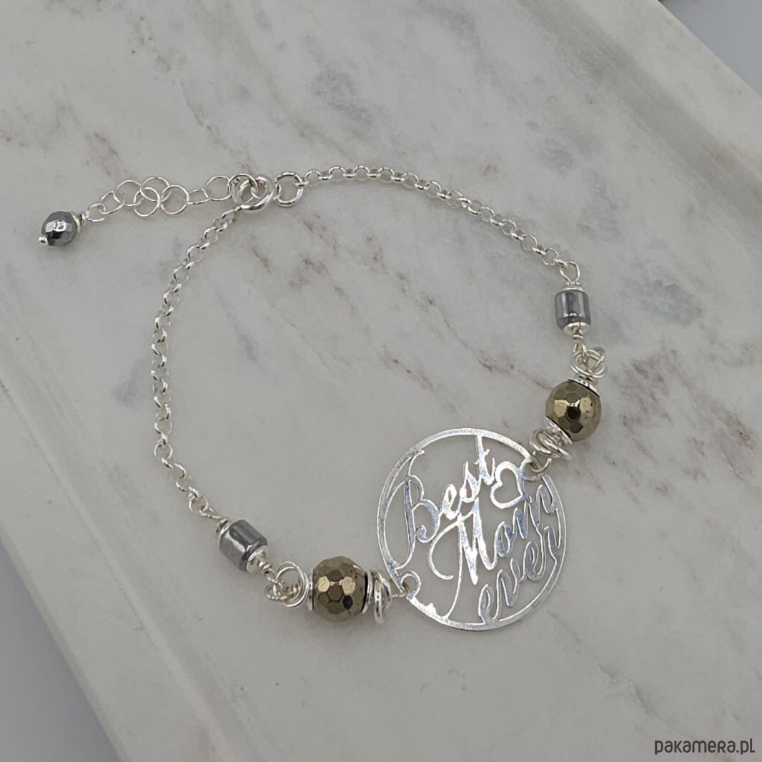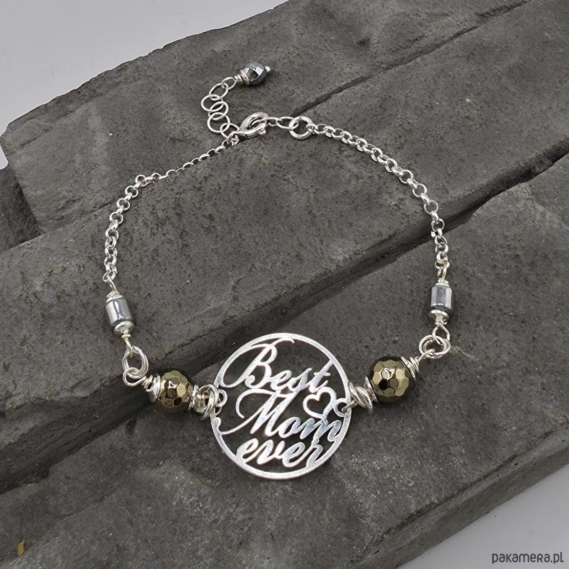 Kobieca, wyjątkowa bransoletka dla mamy 'best mom ever'. Wykonana w całości ze srebra próby 925 oraz złotych i srebrnych hematytów wielkości ok. 5 i 6 mm. Średnica blaszki z napisem to 2 cm . Całkowita długość bransoletki to ok. 16,5 cm plus 2,5 cm przedłużki. Na życzenie mogę ją zoksydować lub wykonać z innymi kamieniami. W mojej galerii jest dostępny podobny naszyjnik. Ozdobnie zapakowana.