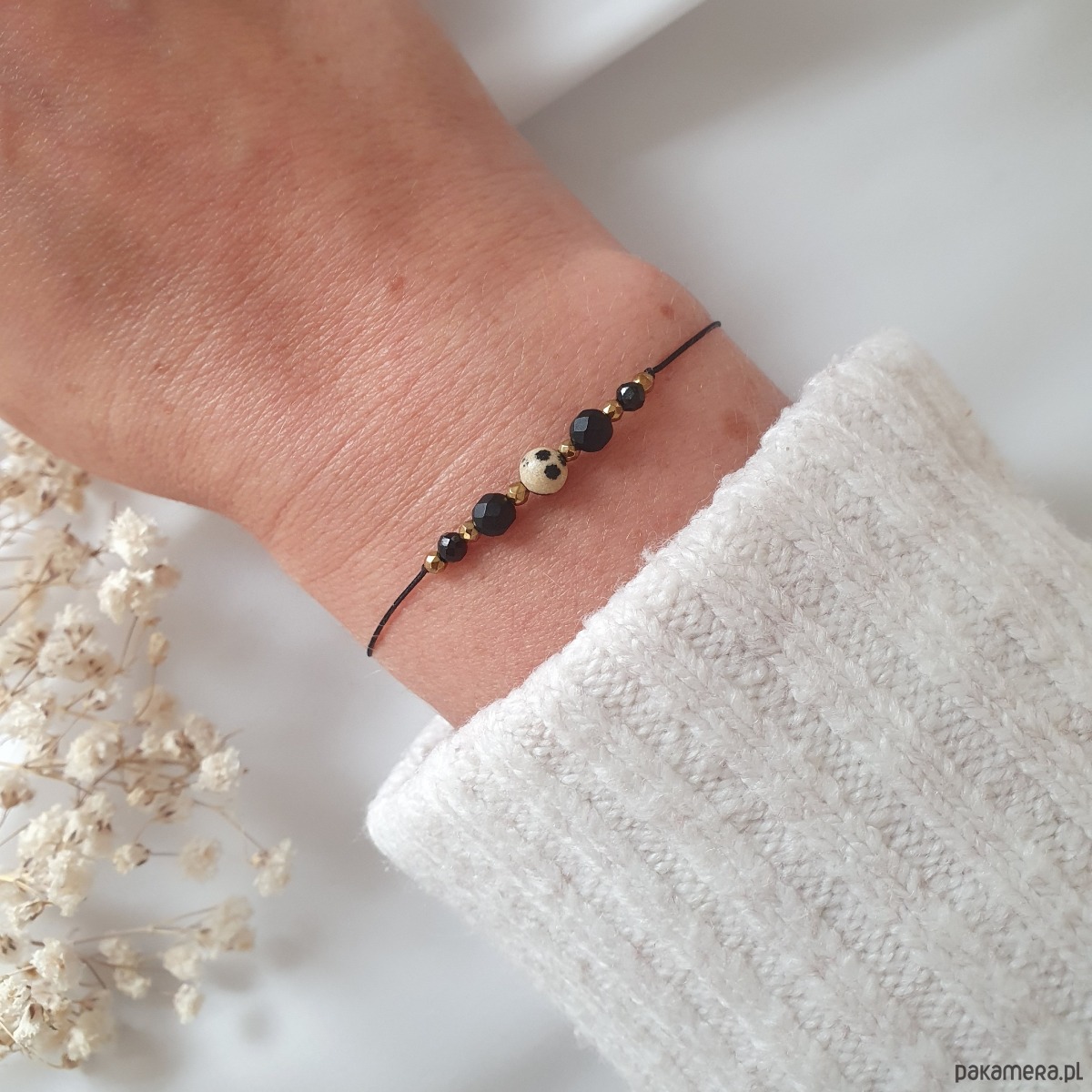 Bransoletka wykonana ręcznie na wytrzymałej nici jubilerskiej z kamieniami naturalnymi: JASPISEM, ONYKSEM, TURMALINEM I HEMATYTEM. Regulowane zapięcie pozwala na dowolne dopasowanie do nadgarstka.