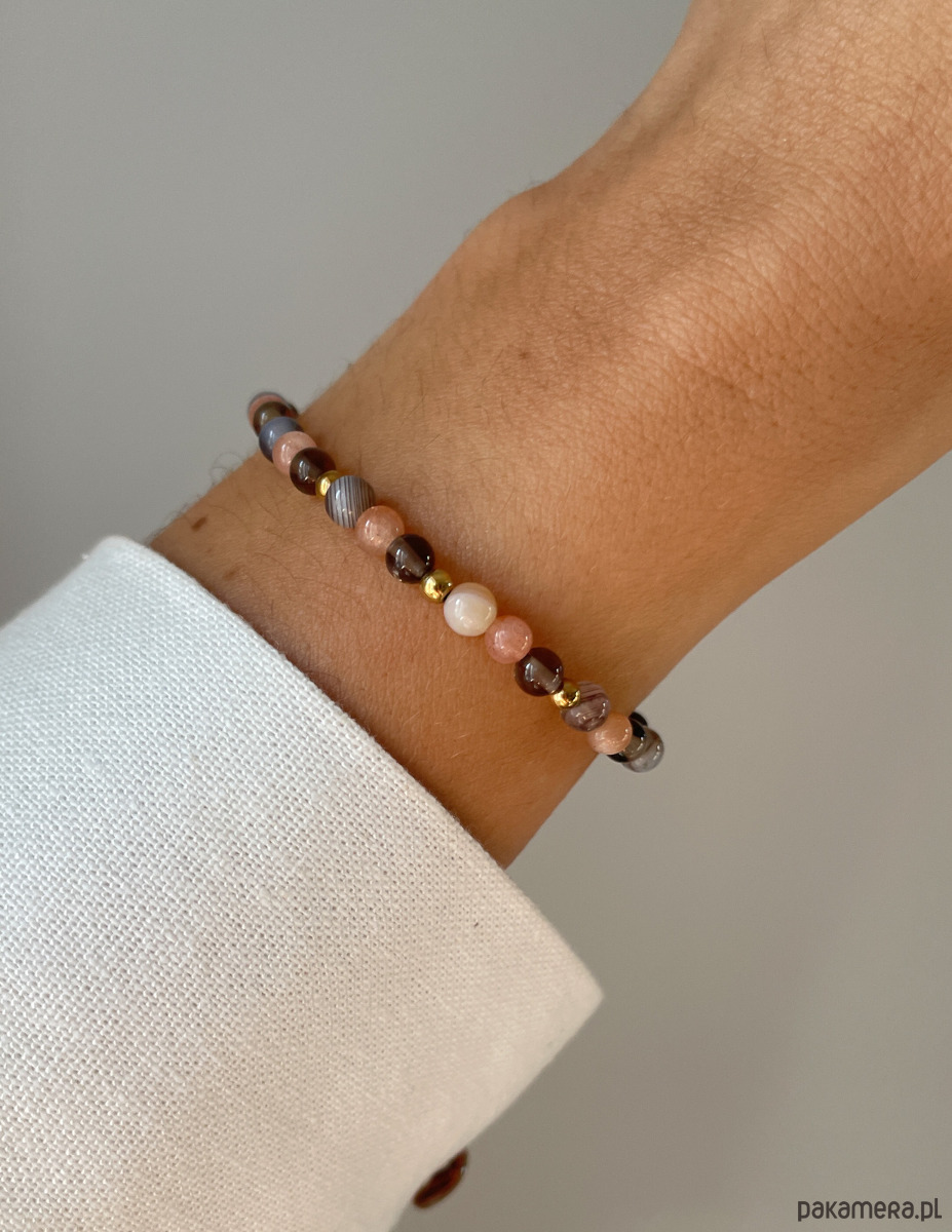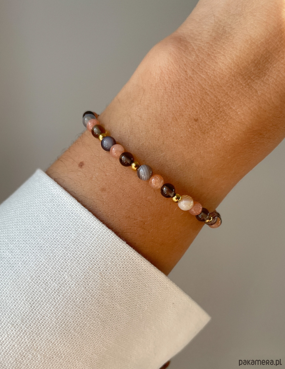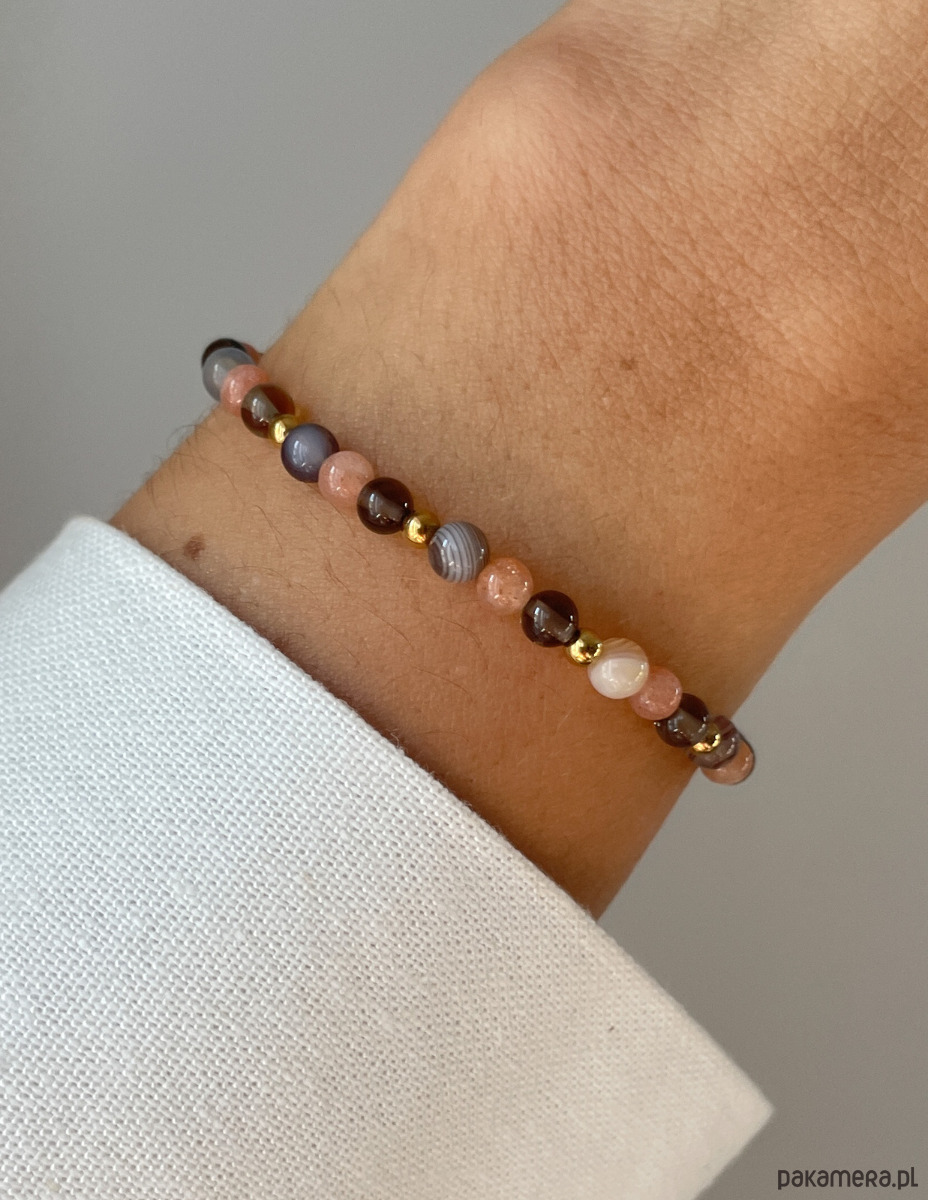 Bransoletka została wykonana na wytrzymałej, elastycznej żyłce jubilerskiej, co gwarantuje łatwość zakładania i idealne dopasowanie do nadgarstka. Naturalna kolorystyka Agatu Botswana, Kwarcu Dymnego oraz Kamienia Słonecznego została podkreślona złotymi kuleczkami Hematytu (ok. 2,5–3 mm), nadającymi całości biżuteryjnego, szlachetnego charakteru.