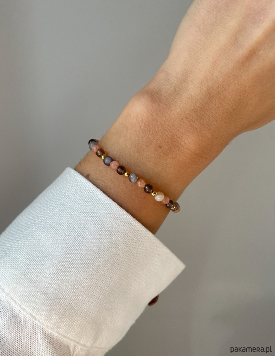 Ta bransoletka to harmonijna kompozycja utrzymana w kojących barwach ziemi i słońca. Połączenie odcieni cappuccino, dymnego brązu oraz delikatnej moreli tworzy niezwykle przytulny, a zarazem elegancki efekt. Gładkie kulki kamieni naturalnych o wielkości ok. 4 mm tworzą spójny rytm, który doskonale komponuje się z każdą codzienną stylizacją, dodając jej subtelnego blasku.