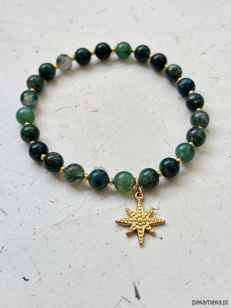 Bransoletka wykonana jest na gumce jubilerskiej z użyciem agatu i przekładek w kolorze złotym,a także zawieszki gwiazdki.
