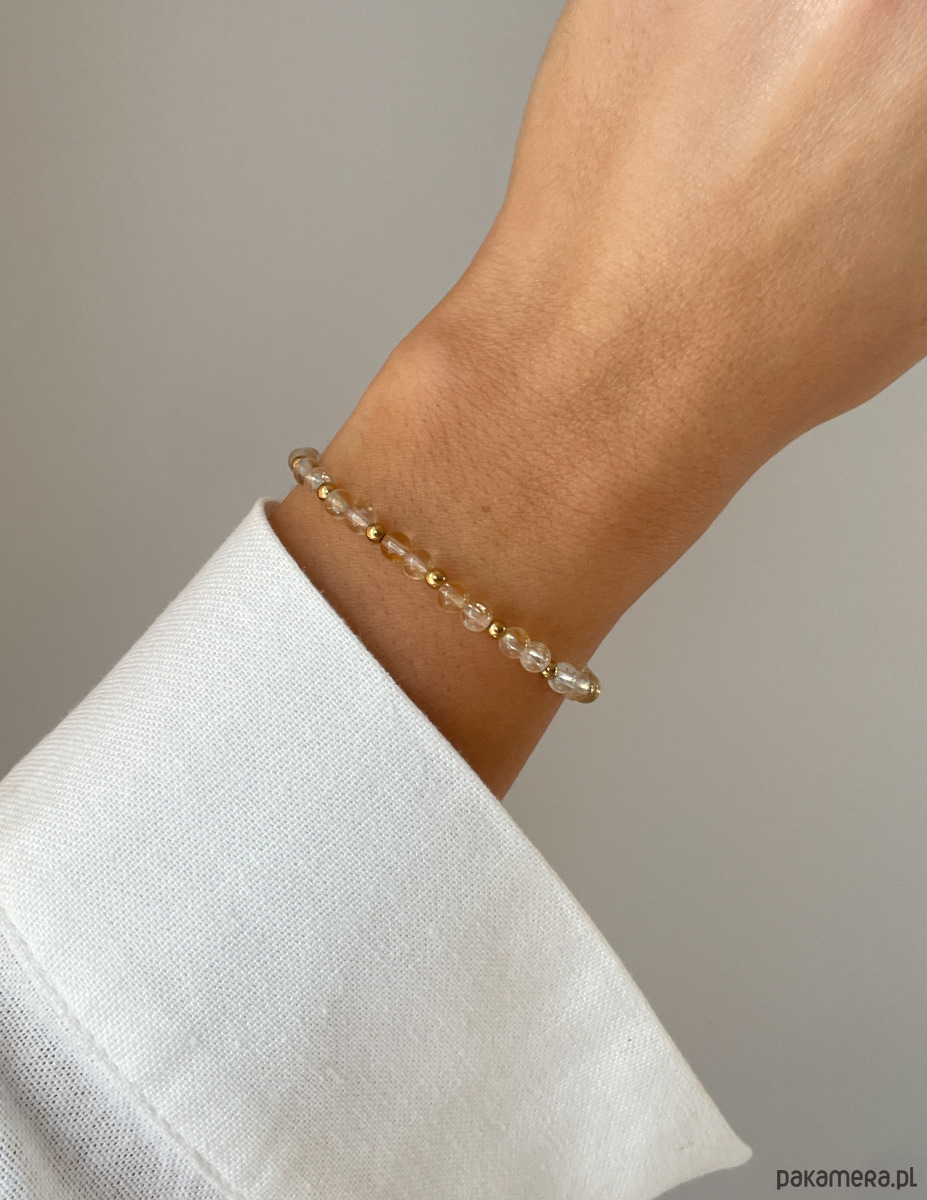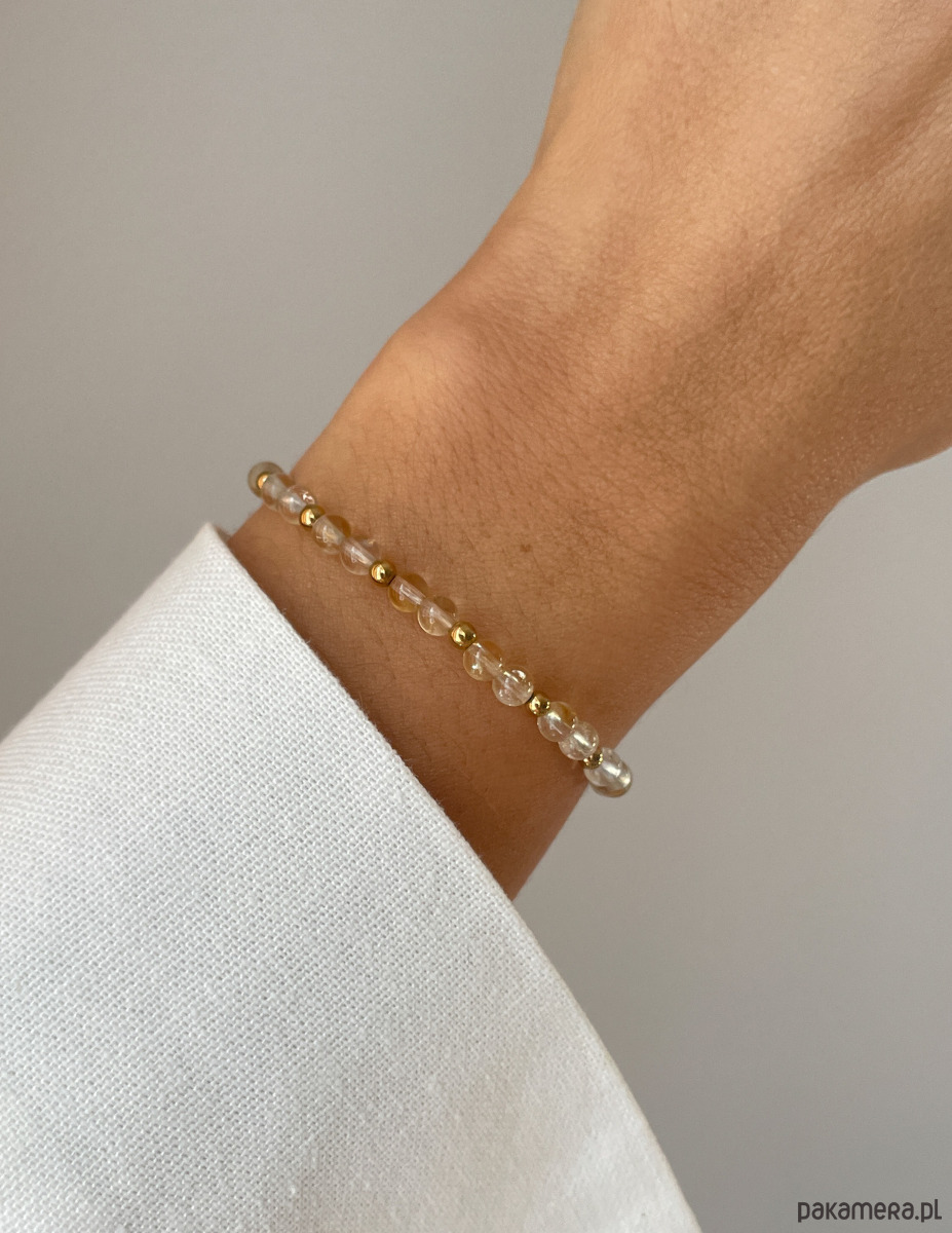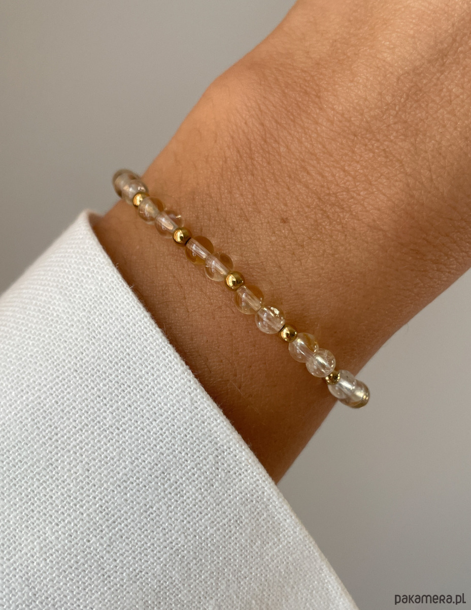 Cechy bransoletki:Kamień: cytryn, hematyt (kolor złoty)Wielkość cytryn - kulki gładkie: ok. 4 mm Wielkość kamienia hematyt: ok. 2,5-3 mm Kolor: żółty, złoty Materiał: wytrzymała elastyczna żyłka jubilerska