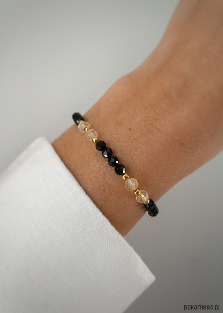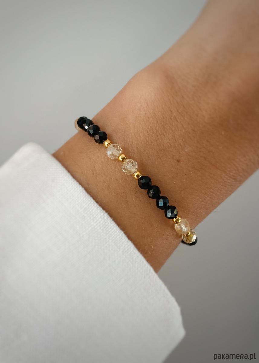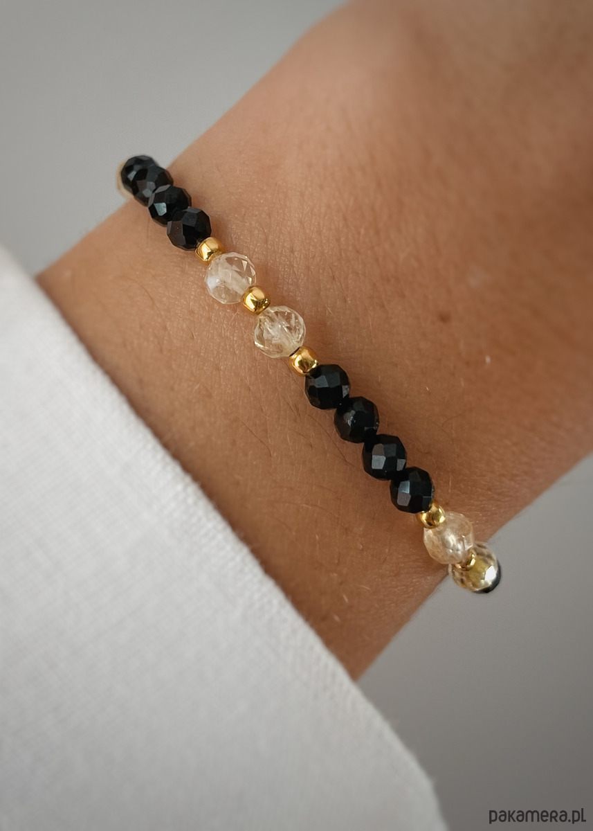 Bransoletka na żyłce elastycznejCechy produktu:Kamień: czarny turmalin, cytryn Wielkość kamieni czarny turmalin, cytryn: 4 mmWielkość kamieni hematyt: 2,5 mmKolor: czarny, jasnożółty, przeźroczysty Trzy długości bransoletki do wyboru (podane długości to obwody nadgarstka, bransoletka będzie miała około 1 cm więcej):- 15 cm - 16 cm- 17 cmWłaściwość kamieni:Czarny turmalin chroni przed działaniem negatywnej energii. Dodaje pewności siebie, poprawia koncentrację oraz pamięć. Porządkuje myśli, pozwala na nabranie nowej perspektywy. Jest wsparciem przy wkraczaniu w nowy etap życia. Cytryn jest kamieniem, który przyciąga sukces, szczęście i dobrobyt. Chroni przed negatywną energią, wspiera kreatywność oraz wzmacnia pewność siebie.