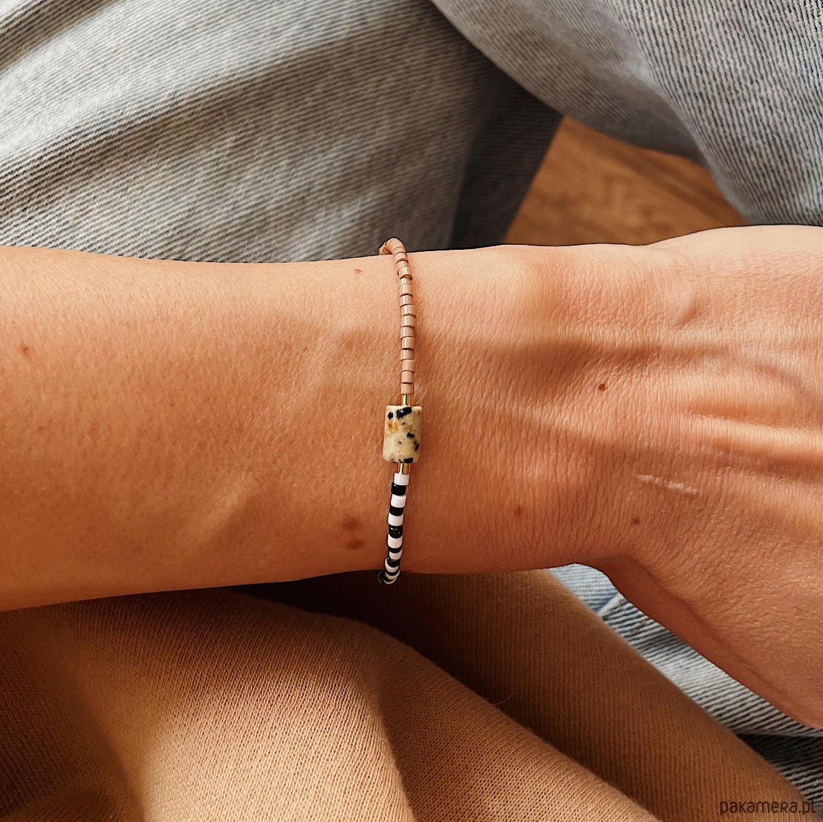 Bransoletka wykonana własnoręcznie ze szklanych koralików, jaspisu dalmatyńskiego i elastycznej żyłki jubilerskiej.