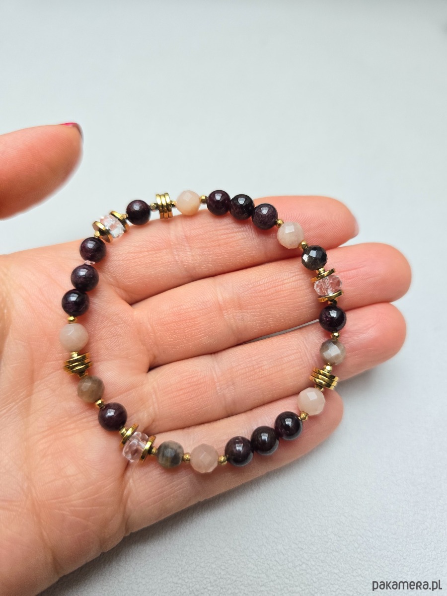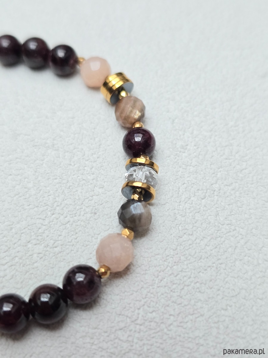 Bransoletka elastyczna z kamieni naturalnych tj:. granat, kamień słoneczny, kryształ górski, złocony hematyt
