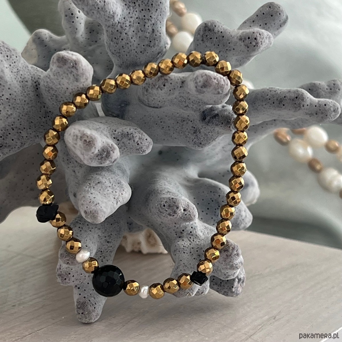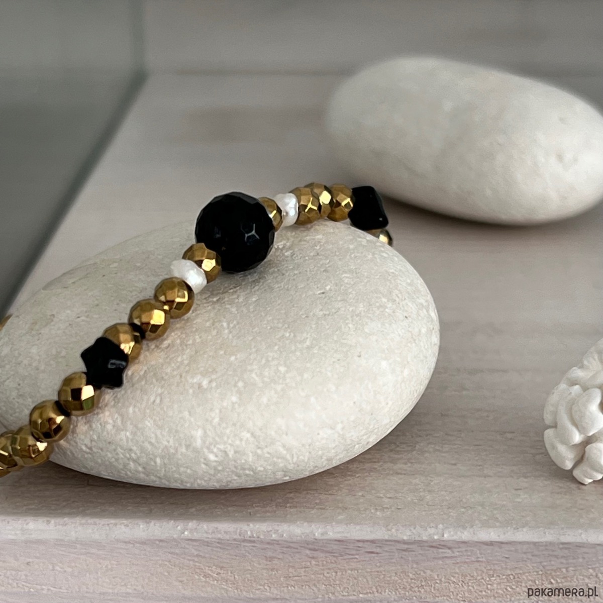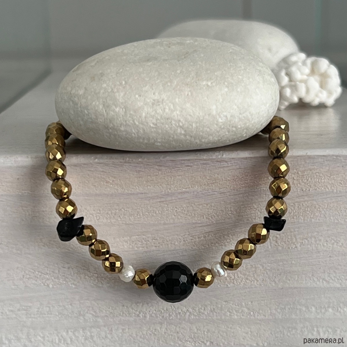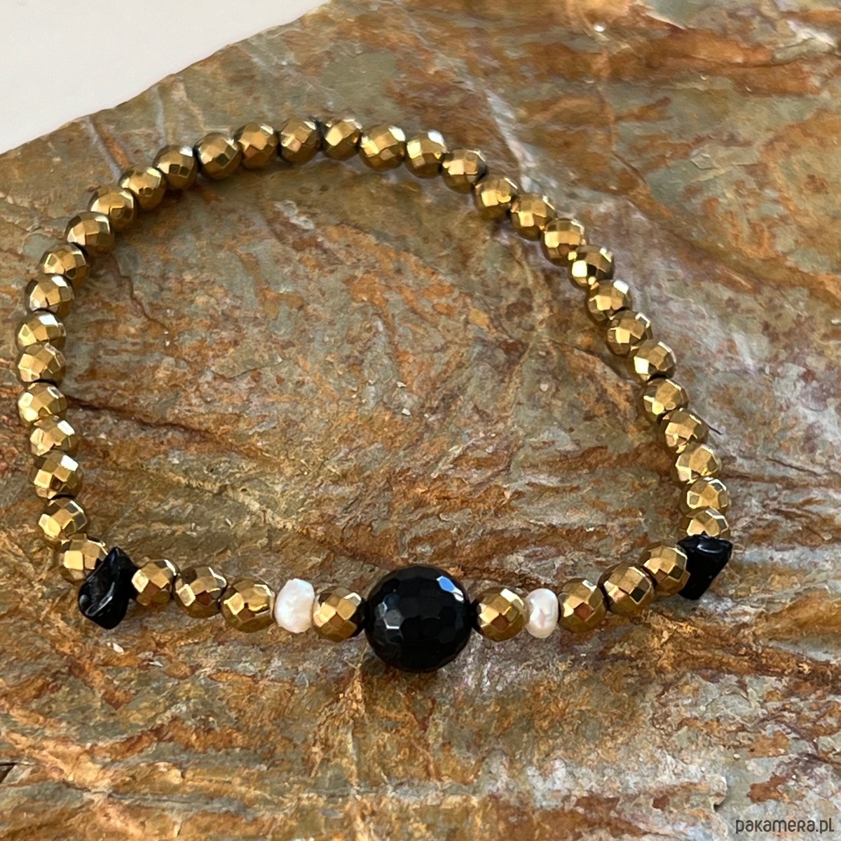 Ta efektowna bransoletka łączy w sobie blask złotego szlifowanego hematytu z głęboką czernią agatu-onyksu i subtelną bielą pereł.