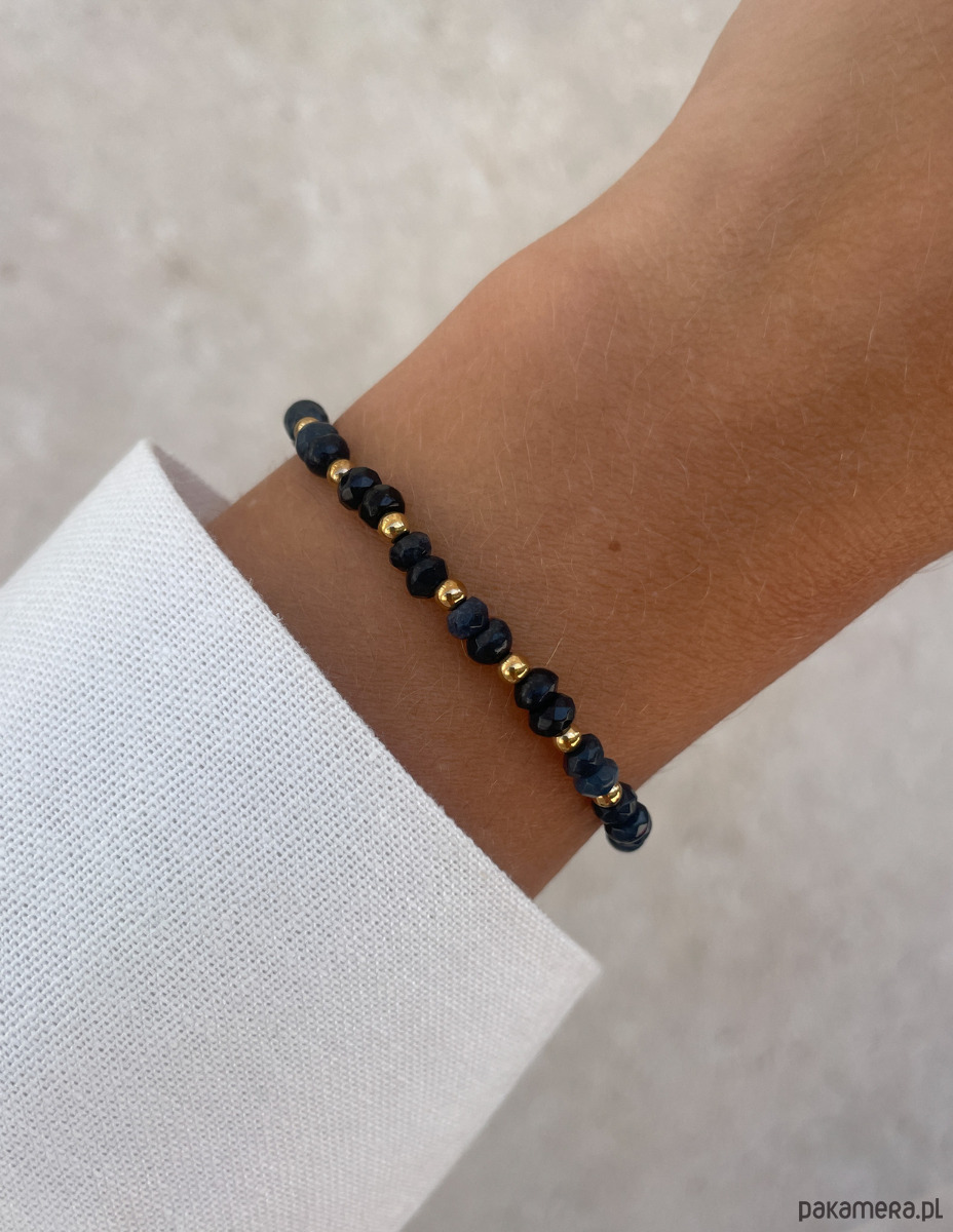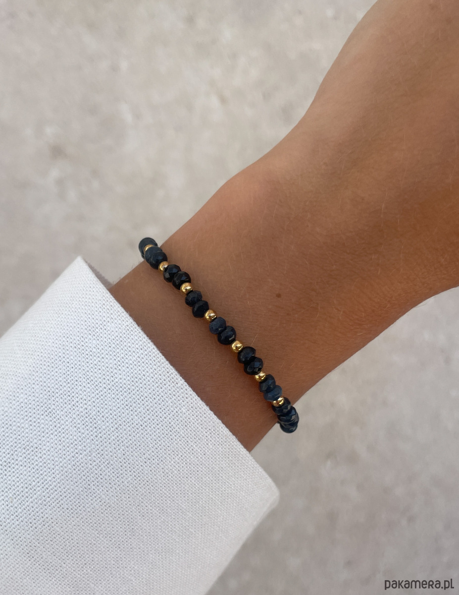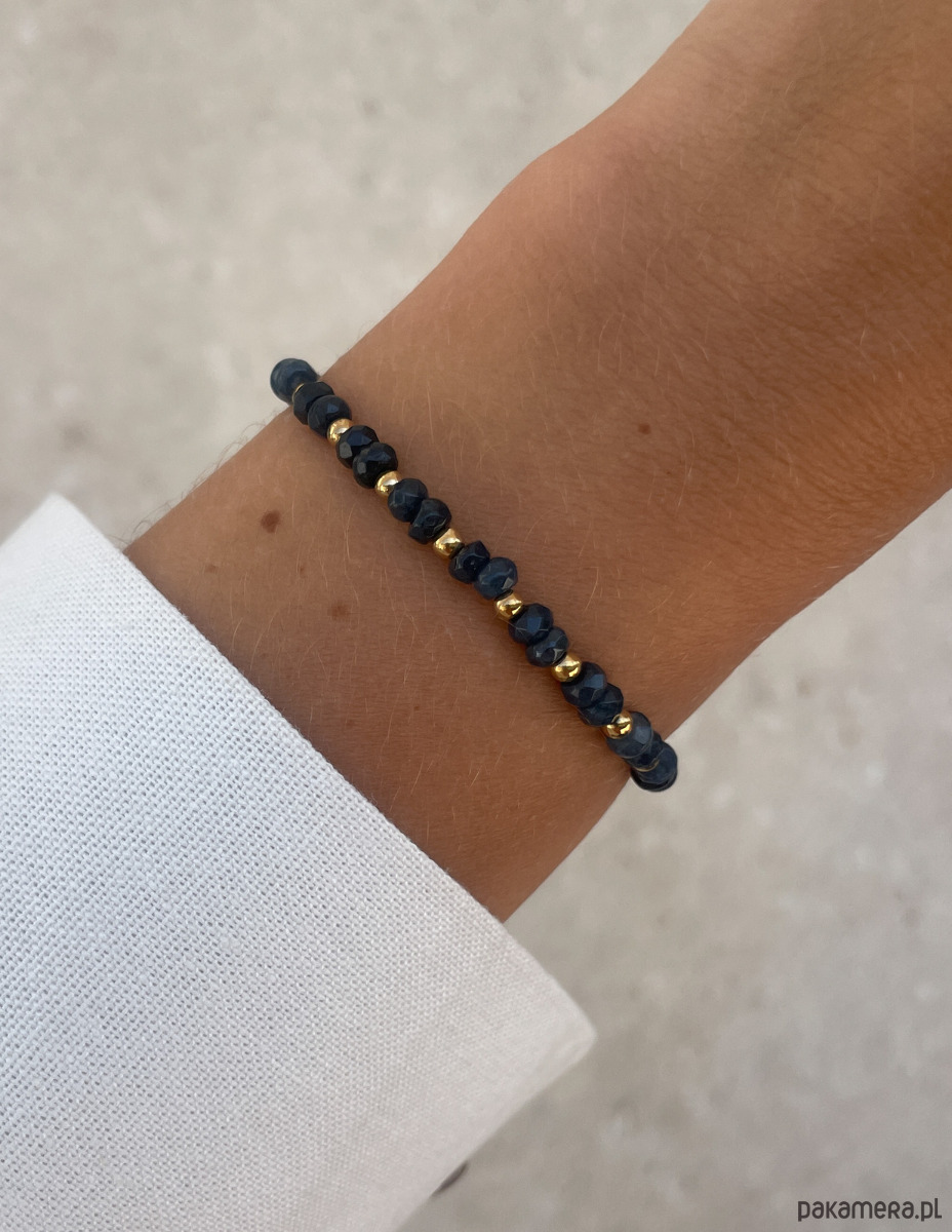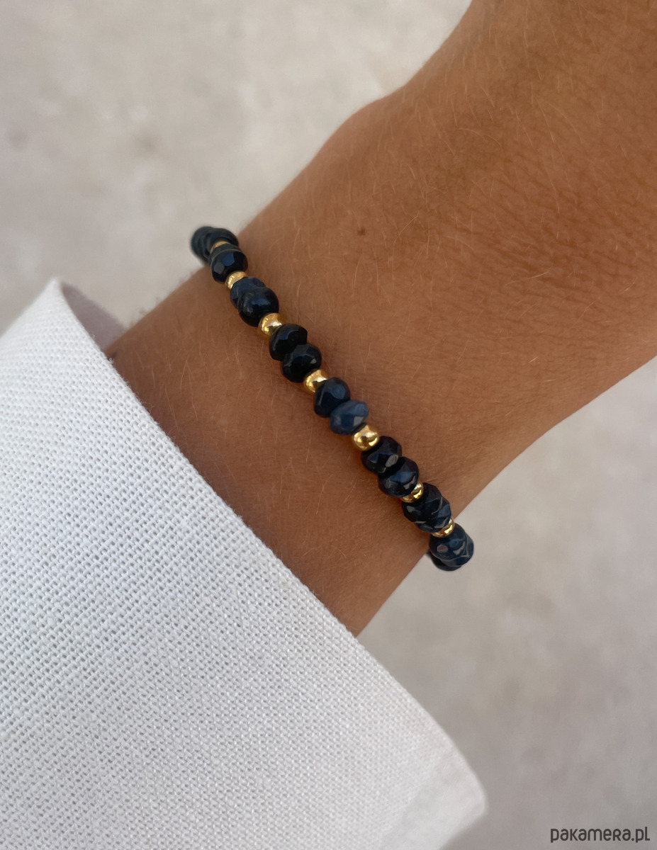 Cechy bransoletki:Kamień: jadeit (kolor - granatowy), hematyt (kolor złoty)Wielkość kamieni jadeitu: kształt oponka 3 x 4 mm Wielkość kamienia hematyt: ok. 2,5 mm Kolor: złoty, granatowyMateriał: wytrzymała elastyczna żyłka jubilerska