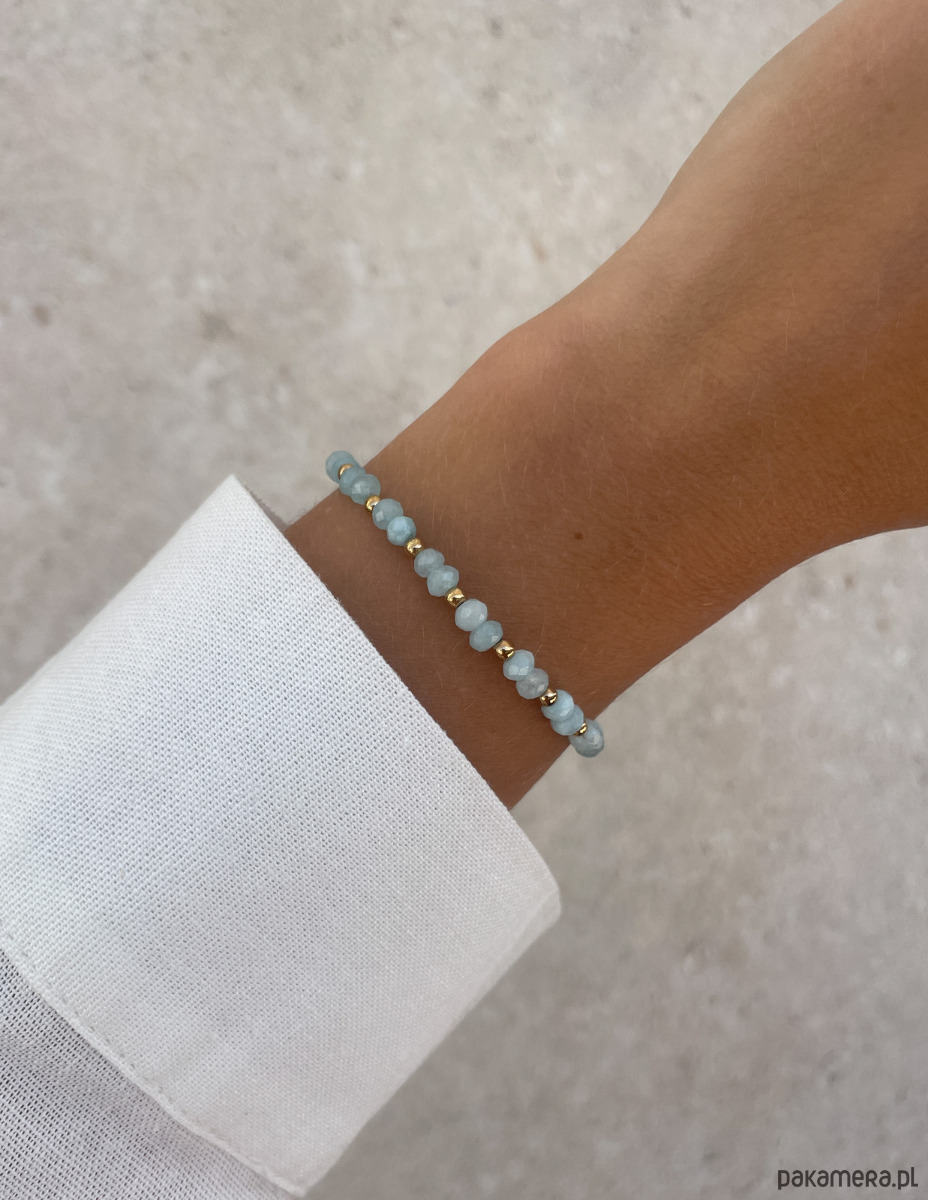 Wykonana na wytrzymałej, elastycznej żyłce jubilerskiej, bransoletka dopasowuje się do kształtu nadgarstka, zapewniając wygodę noszenia przez cały dzień. Połączenie pastelowego jasnoniebieskiego i połyskującego złota tworzy uniwersalny i elegancki dodatek, który pasuje zarówno do casualowych, jak i bardziej formalnych stylizacji.