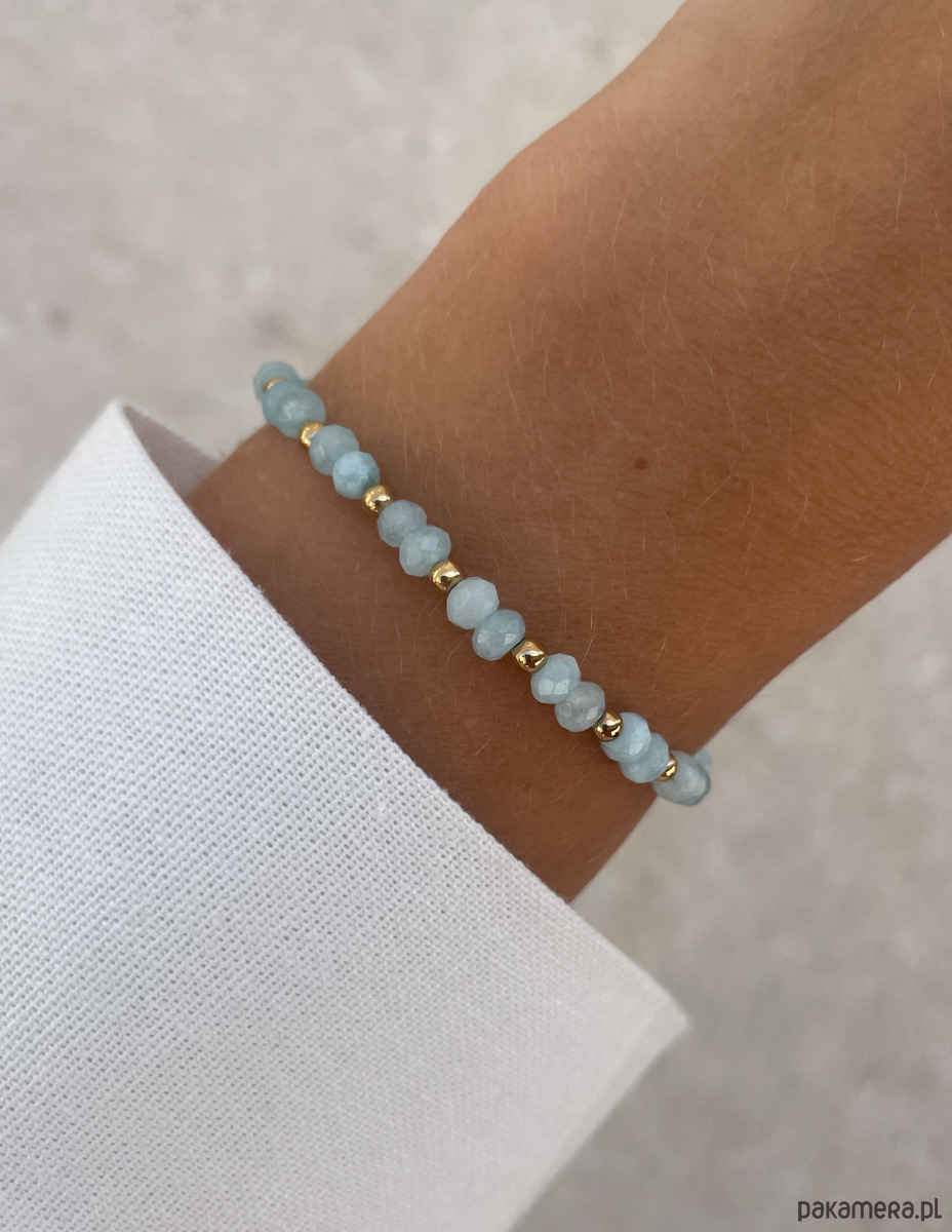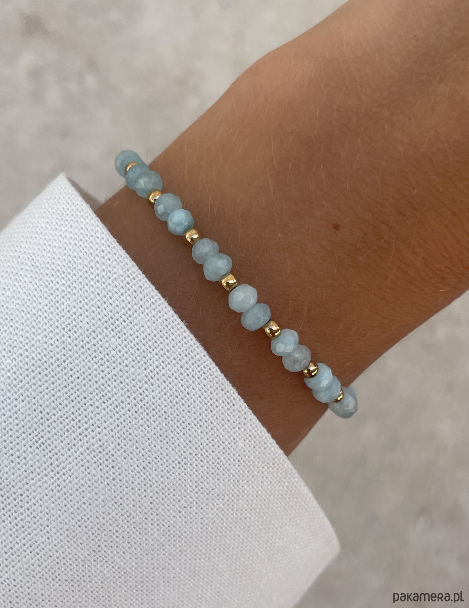 Cechy bransoletki:Kamień: jadeit (kolor - jasnoniebieski), hematyt (kolor złoty)Wielkość kamieni jadeitu: kształt oponka 3 x 4 mm Wielkość kamienia hematyt: ok. 2,5 mm Kolor: złoty, jasnoniebieskiMateriał: wytrzymała elastyczna żyłka jubilerska
