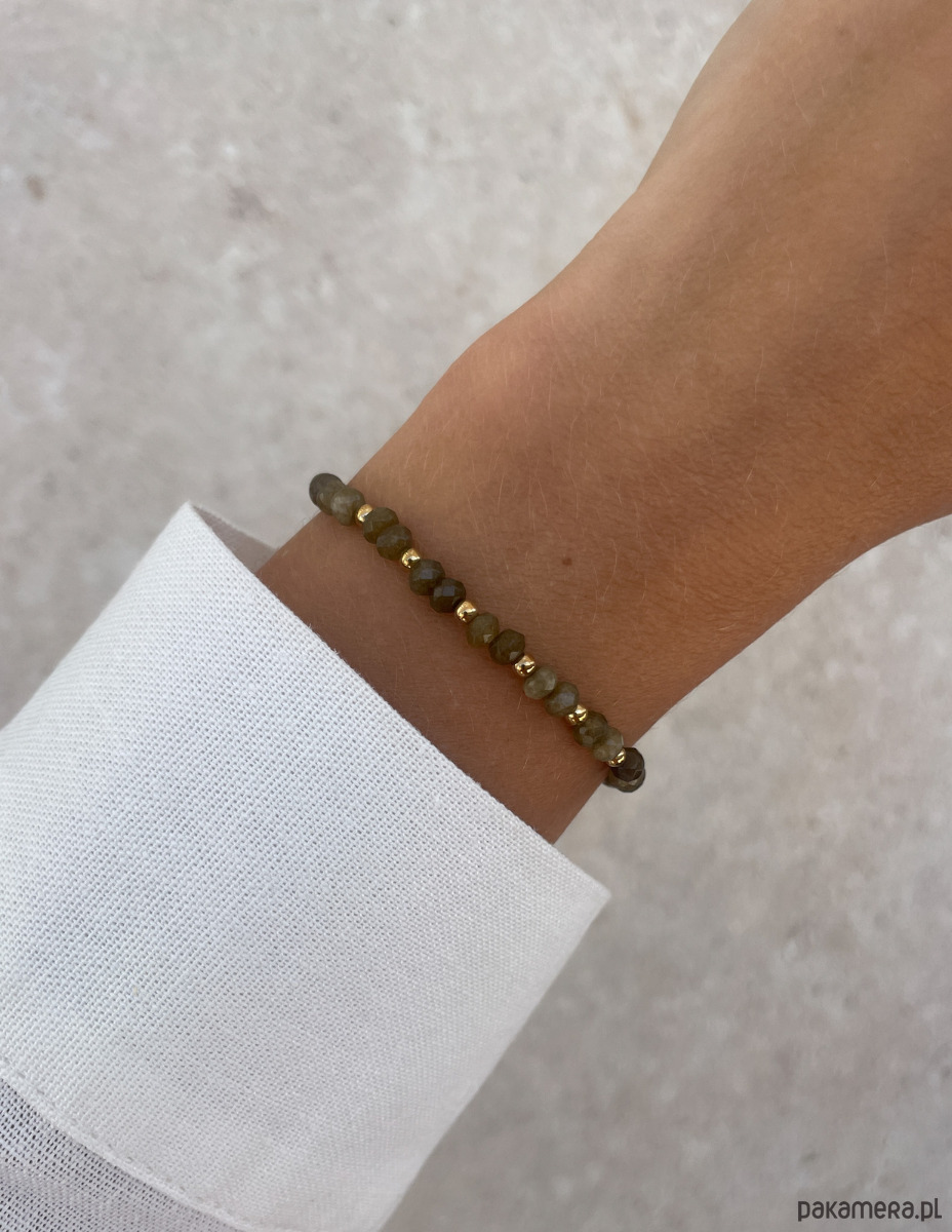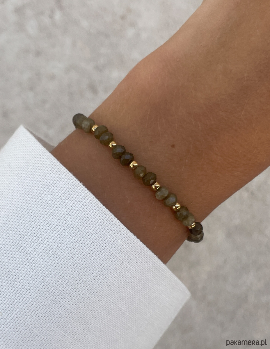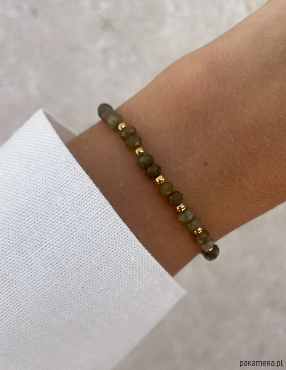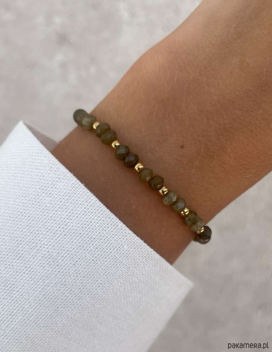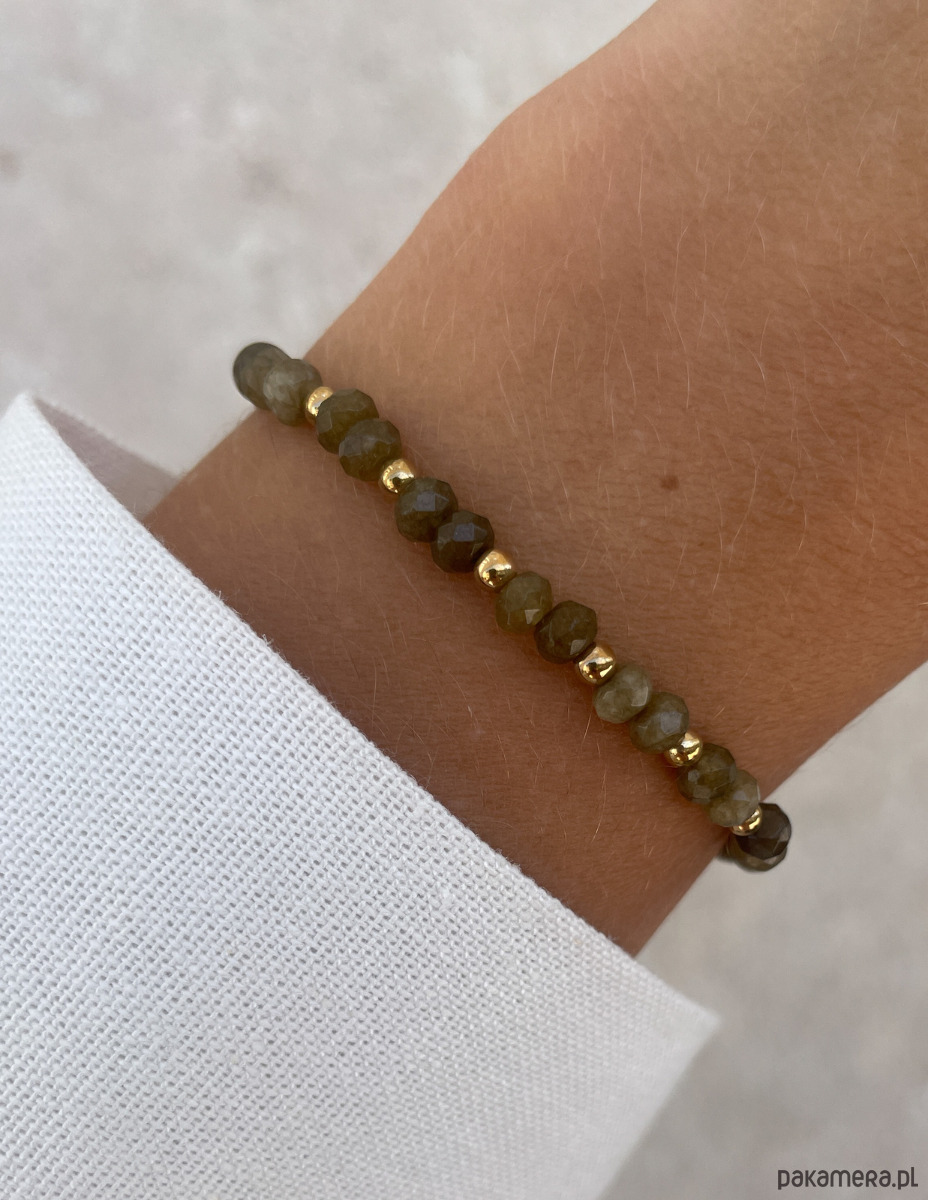 Cechy bransoletki:Kamień: jadeit (kolor - oliwkowy), hematyt (kolor złoty)Wielkość kamieni jadeitu: kształt oponka 3 x 4 mm Wielkość kamienia hematyt: ok. 2,5 mm Kolor: złoty, oliwkowyMateriał: wytrzymała elastyczna żyłka jubilerska