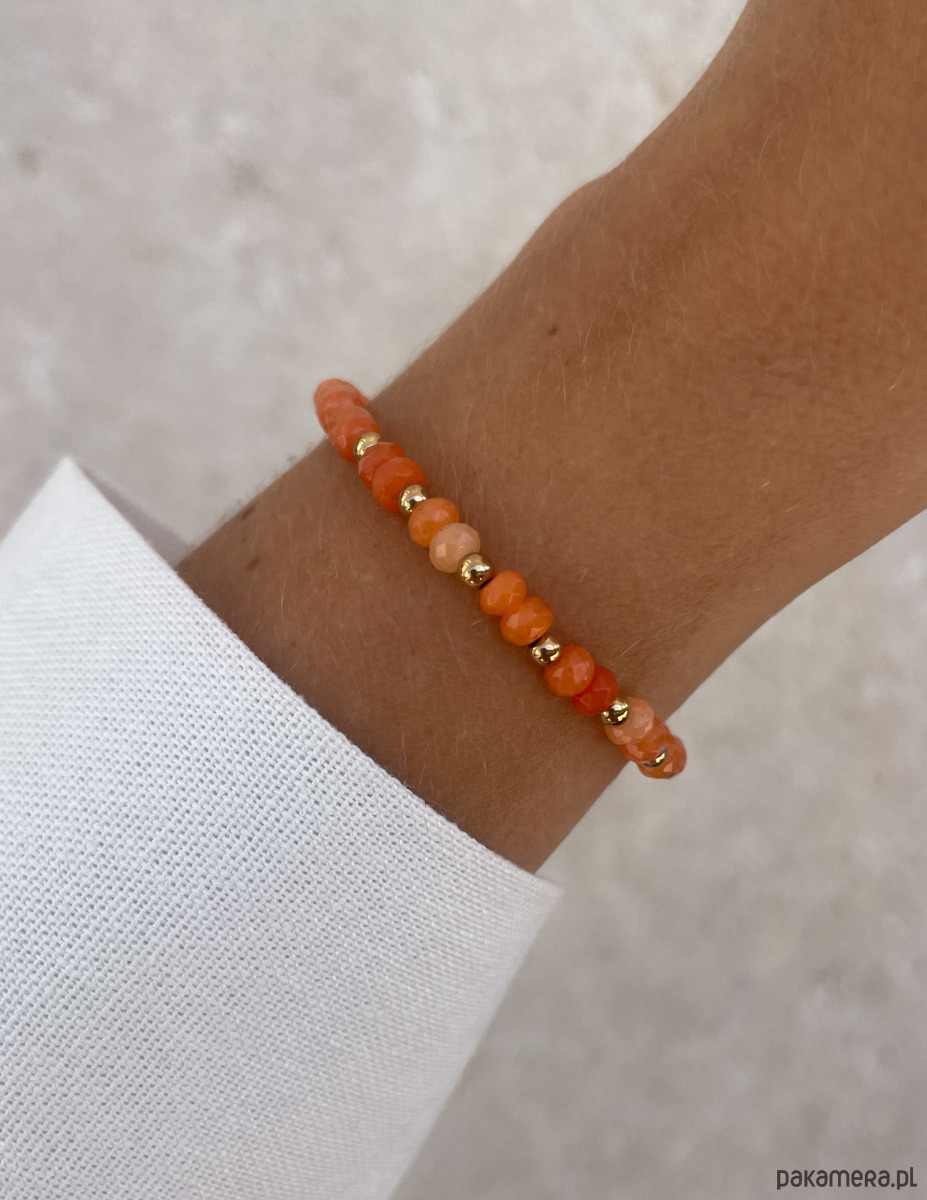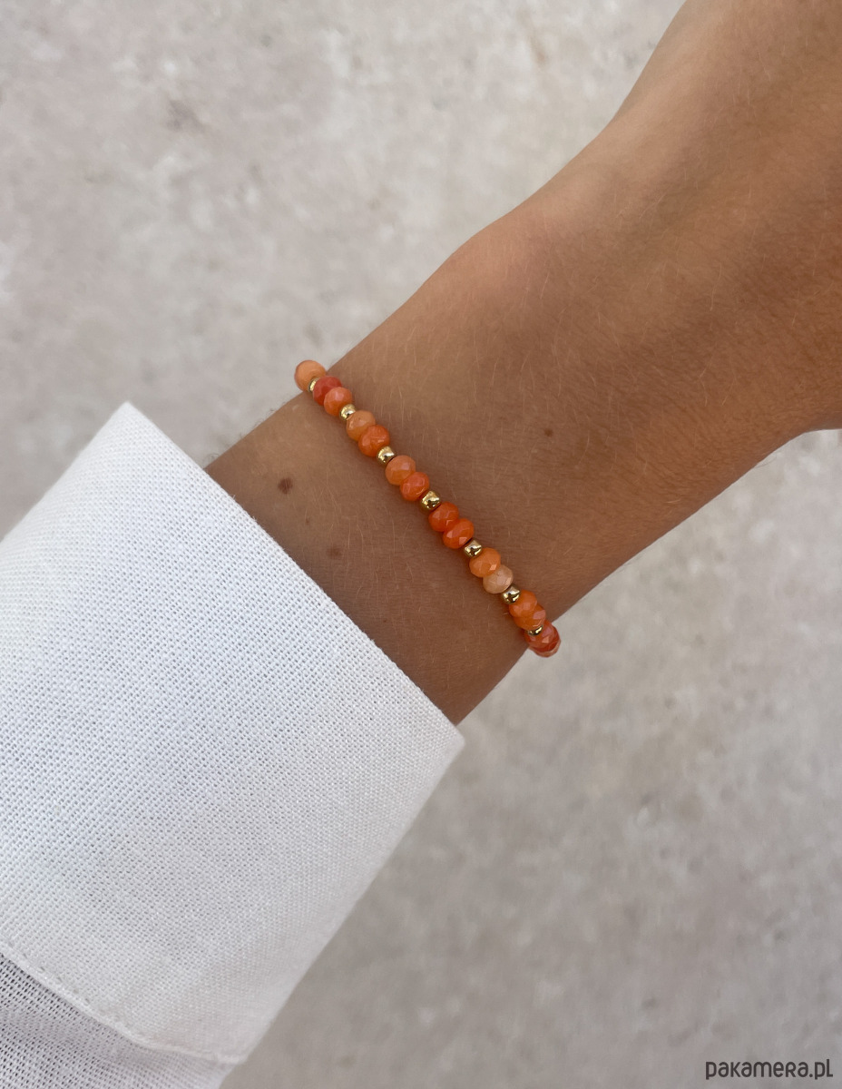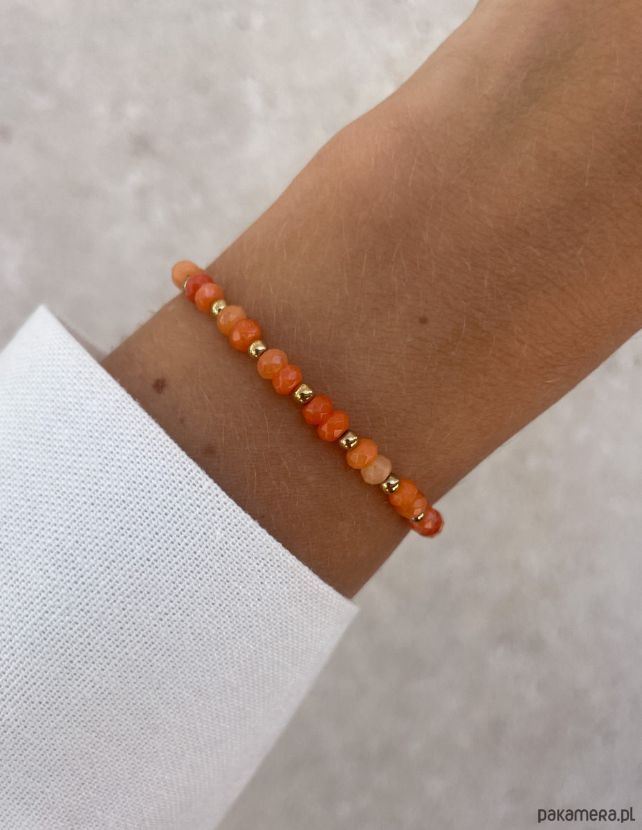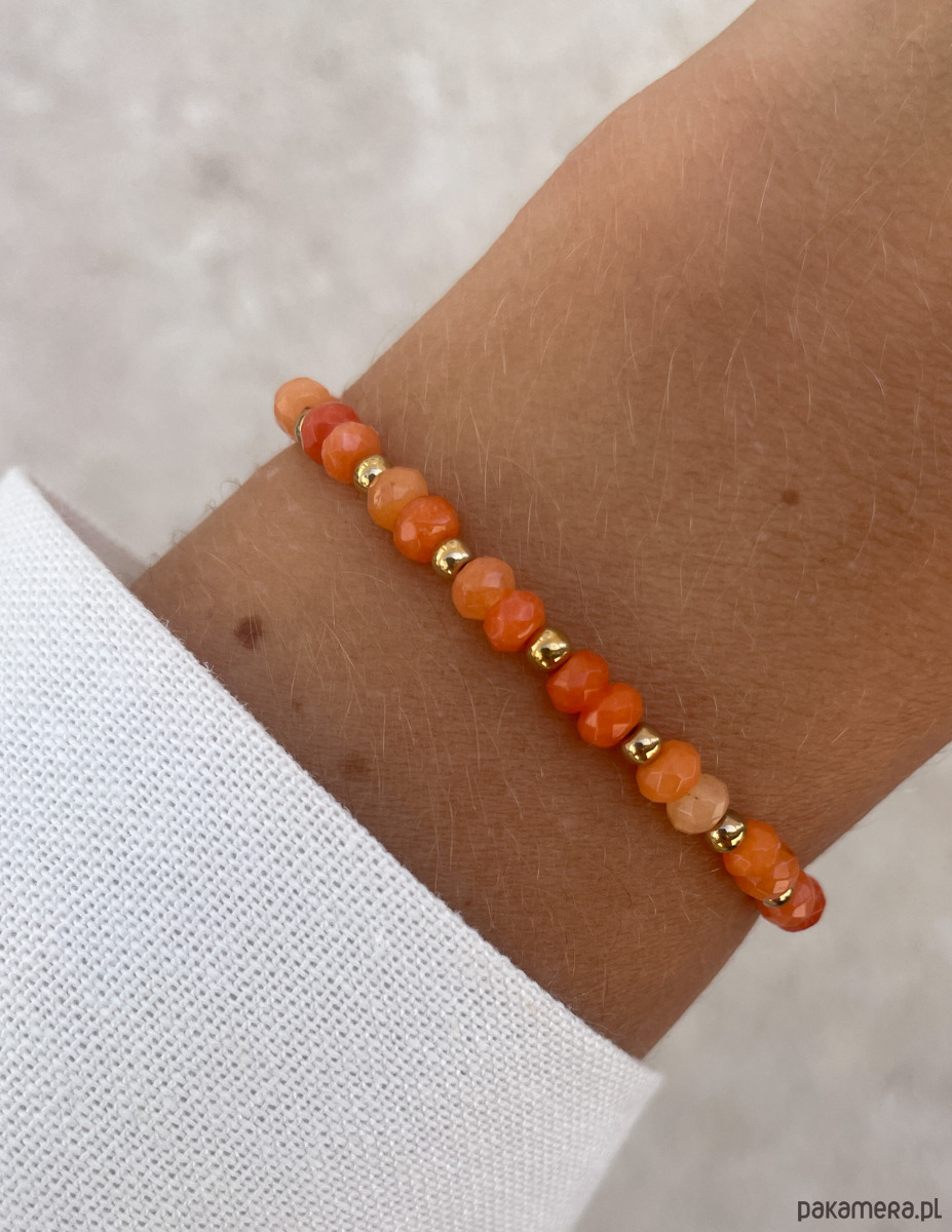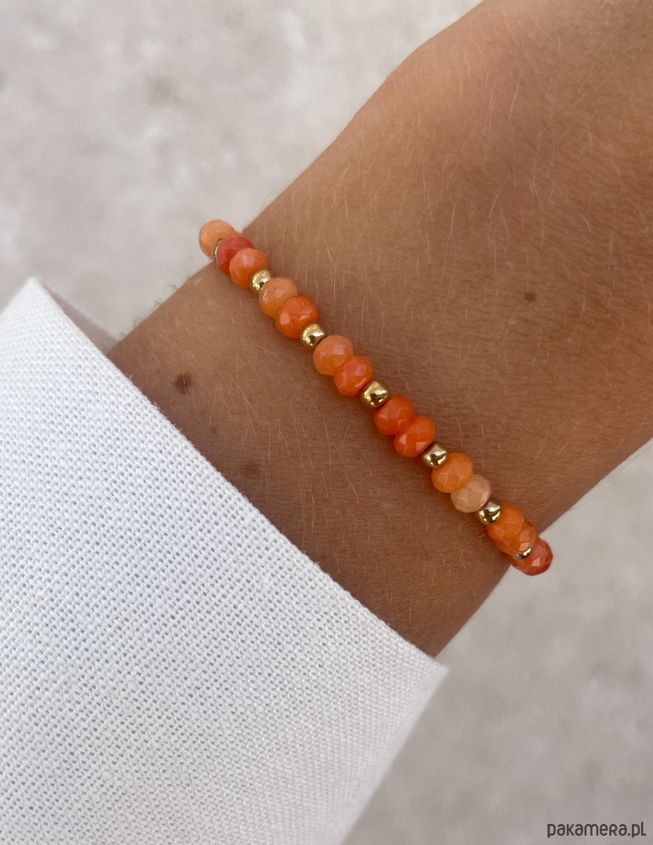 Cechy bransoletki:Kamień: jadeit (kolor - pomarańczowy), hematyt (kolor złoty)Wielkość kamieni jadeitu: kształt oponka 3 x 4 mm Wielkość kamienia hematyt: ok. 2,5 mm Kolor: złoty, pomarańczowyMateriał: wytrzymała elastyczna żyłka jubilerska