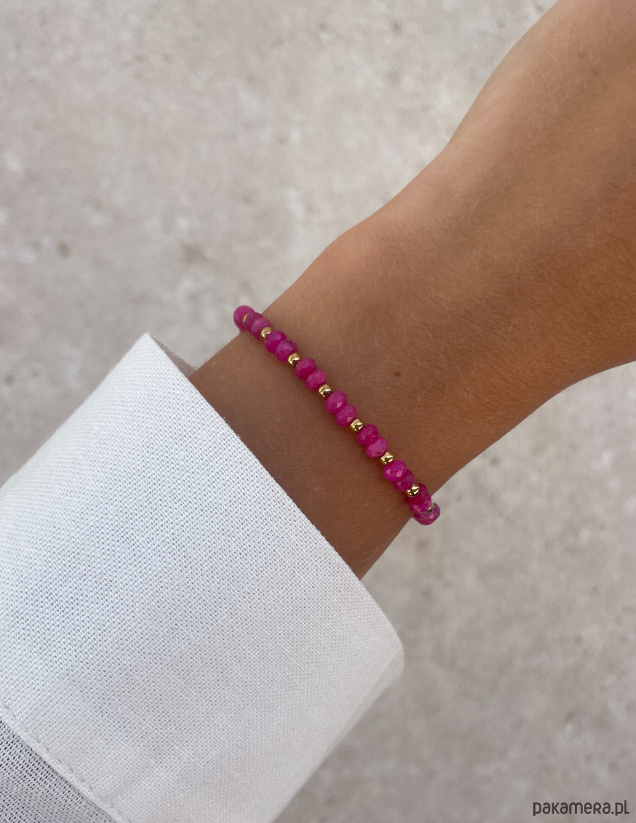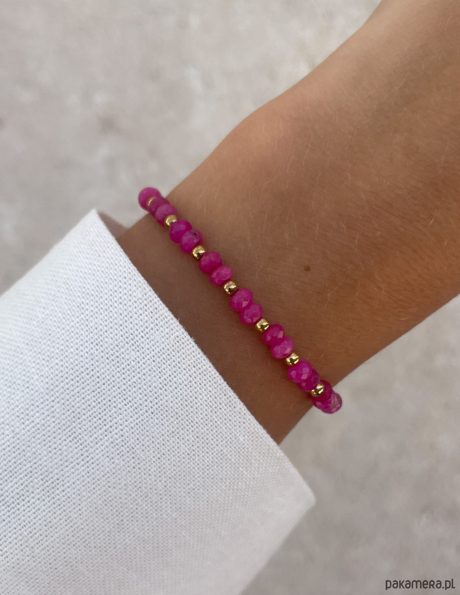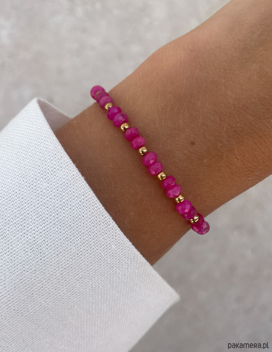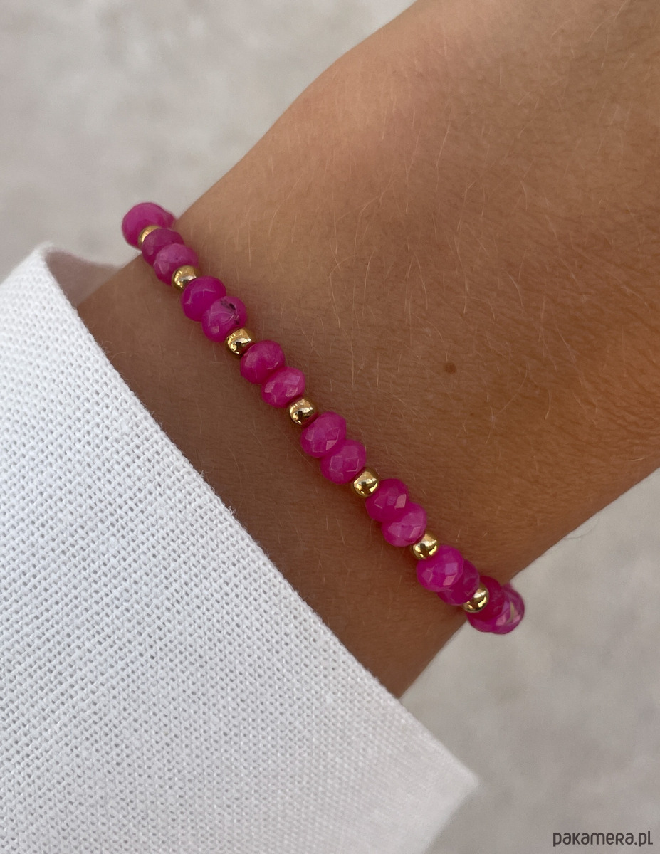 Cechy bransoletki:Kamień: jadeit (kolor - różowy), hematyt (kolor złoty)Wielkość kamieni jadeitu: kształt oponka 3 x 4 mm Wielkość kamienia hematyt: ok. 2,5 mm Kolor: złoty, różowyMateriał: wytrzymała elastyczna żyłka jubilerska