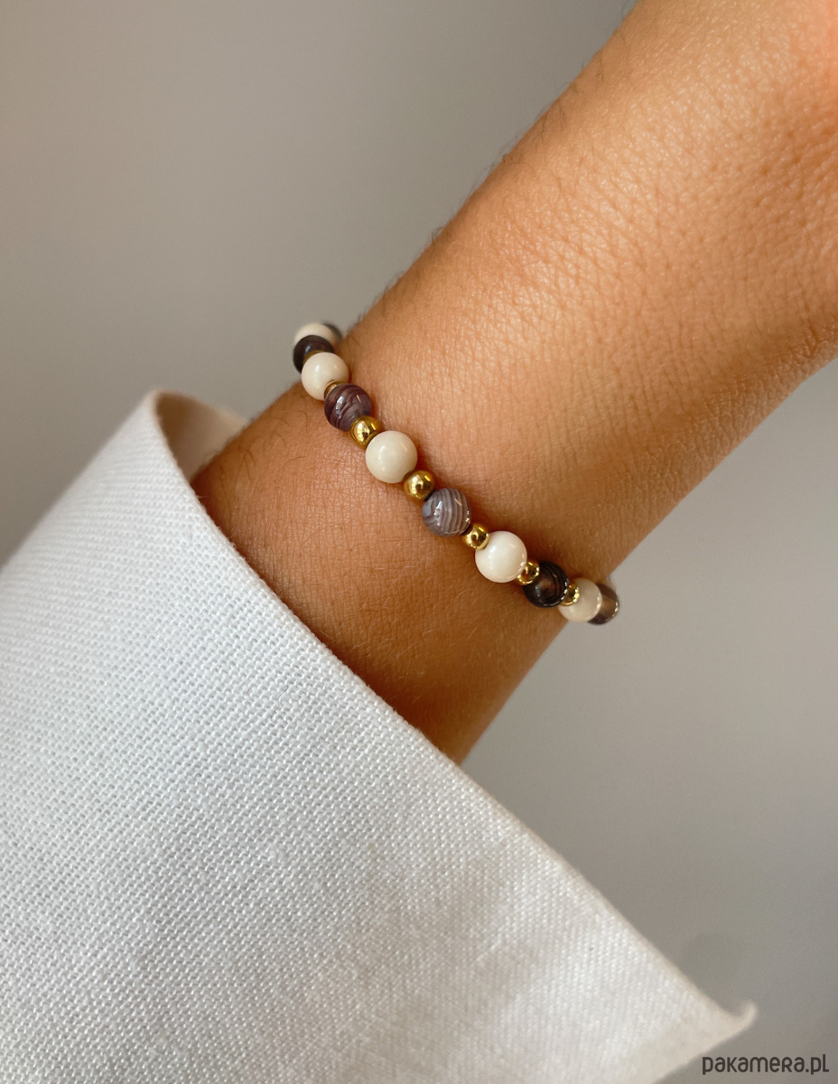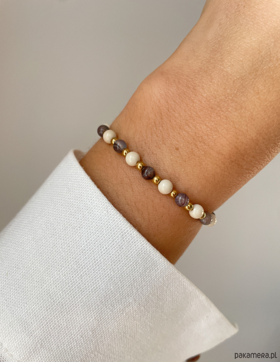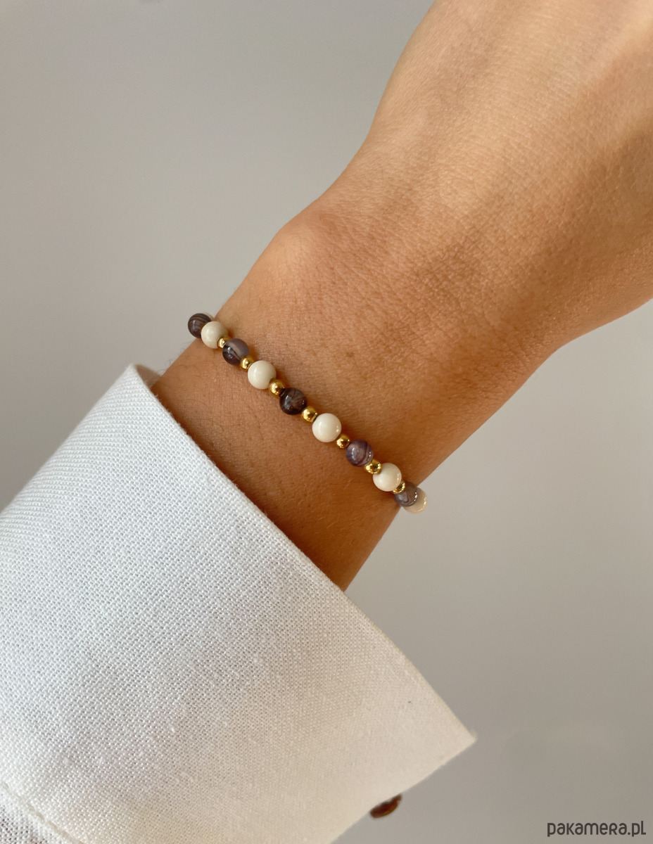 Bransoletka została wykonana na wytrzymałej, elastycznej żyłce jubilerskiej, co gwarantuje wygodę oraz idealne dopasowanie do nadgarstka. Kompozycja składa się z kamieni o wielkości ok. 4 mm: wielobarwnego Agatu Botswana o pięknych, warstwowych pasmach oraz gładkiego Beżowego Jaspisu. Całość rozświetlają drobne, złote akcenty Hematytu (ok. 2,5-3 mm), nadając biżuterii szlachetnego blasku.