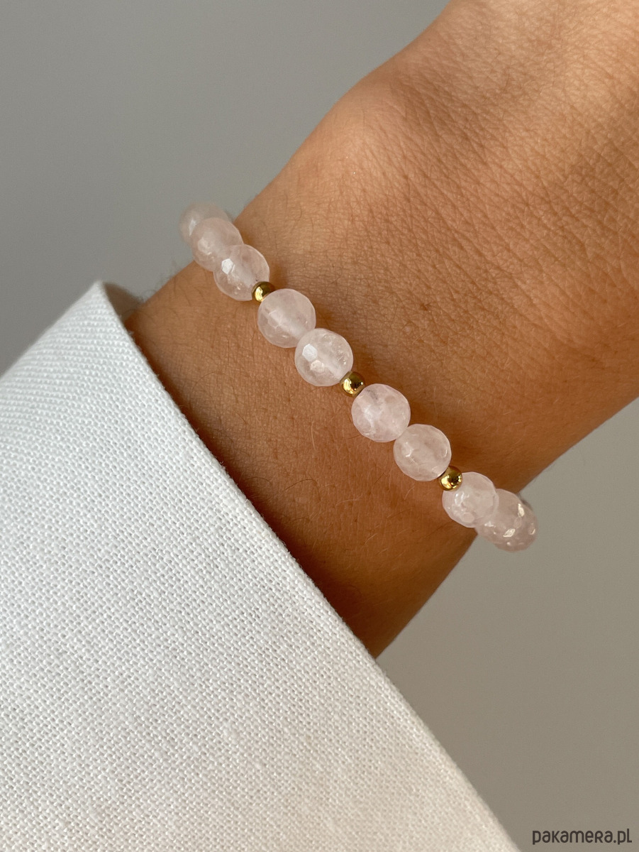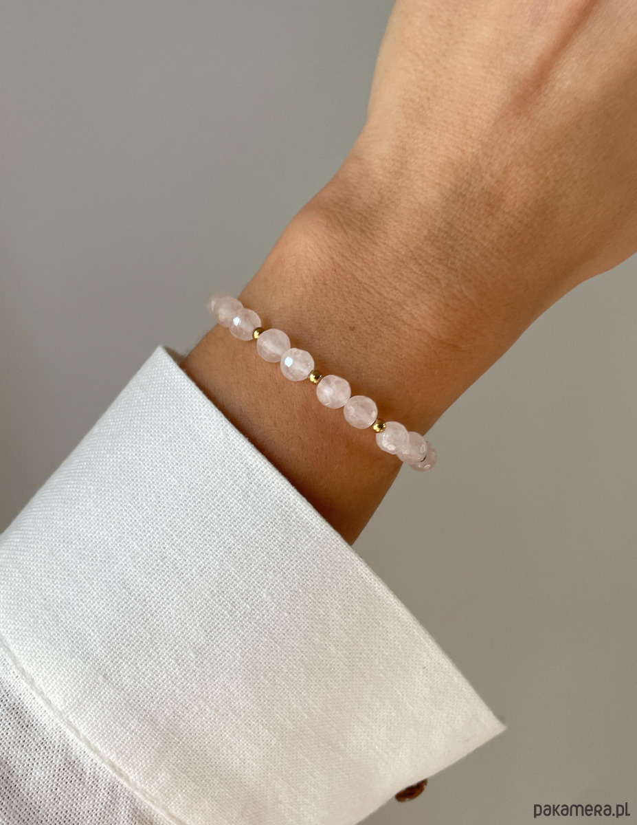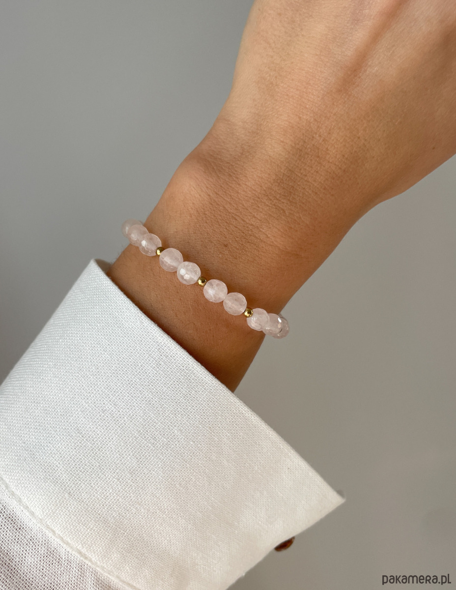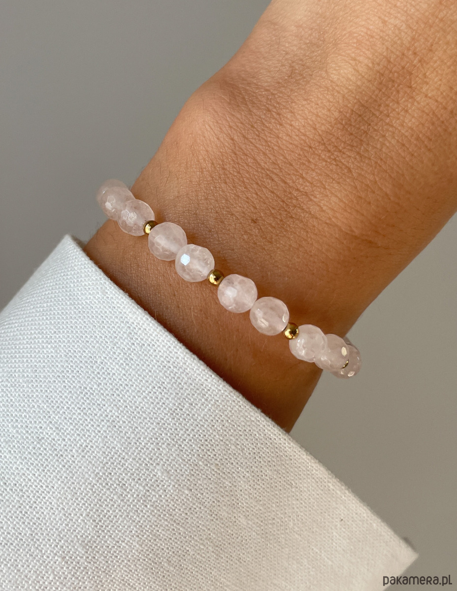 Cechy bransoletki:Kamień: kwarc różowy, hematyt (kolor złoty)Wielkość kamienia kwarc różowy - kulki fasetowane: ok. 6 mm Wielkość kamienia hematyt: ok. 2,5-3 mm Kolor: jasno-różowy, złoty Materiał: wytrzymała elastyczna żyłka jubilerska
