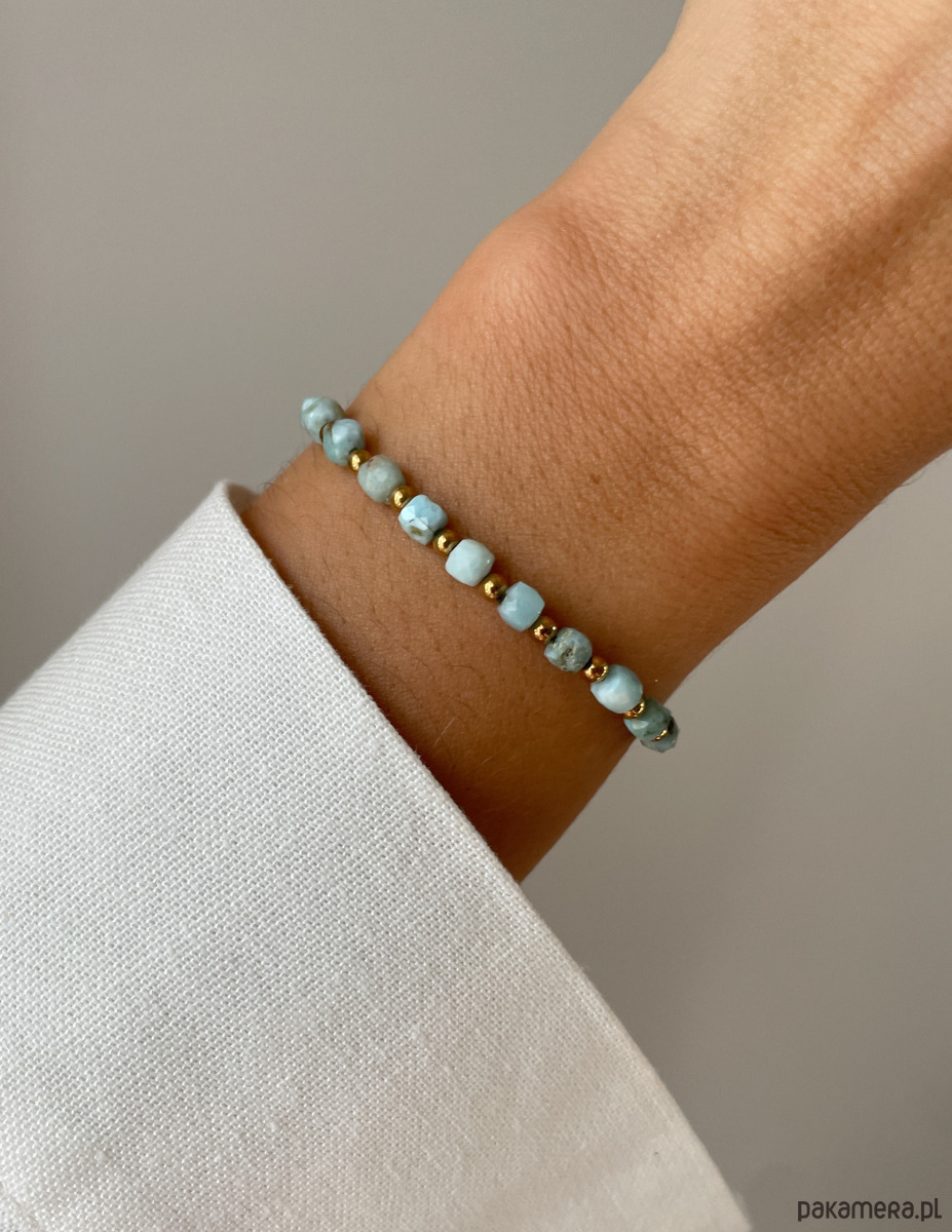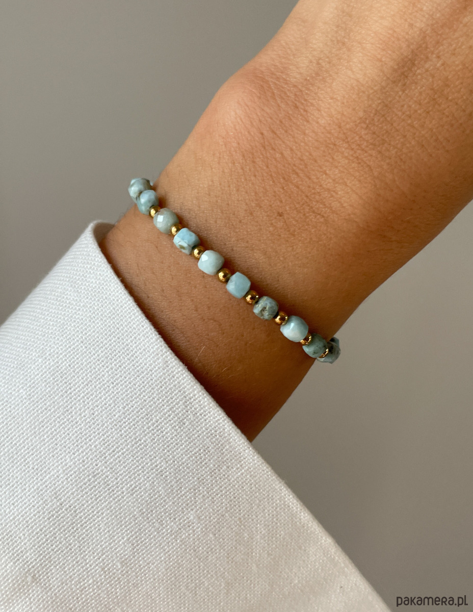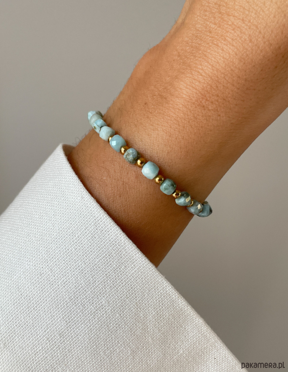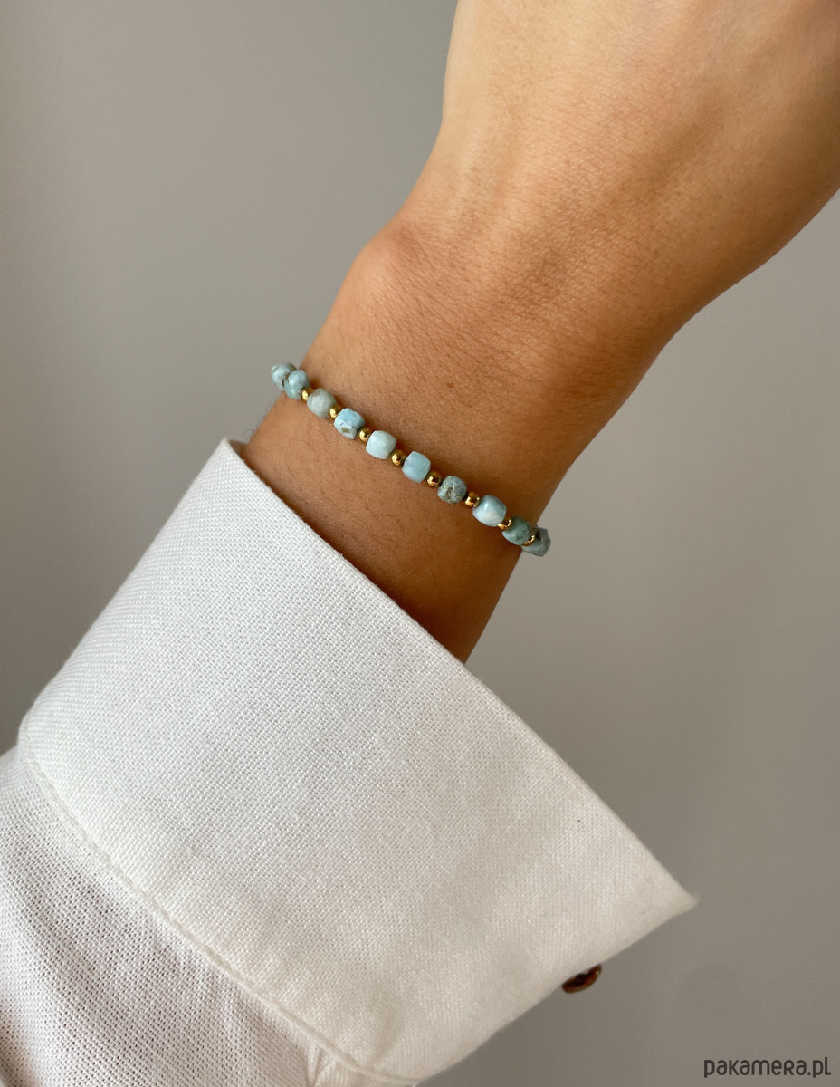 Cechy bransoletki:Kamień: larimar, hematyt (kolor złoty)Wielkość larimar - kostka: ok. 4 mm Wielkość kamienia hematyt: ok. 2,5-3 mm Kolor: błękitny, złoty Materiał: wytrzymała elastyczna żyłka jubilerska