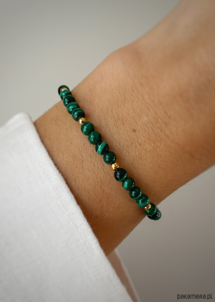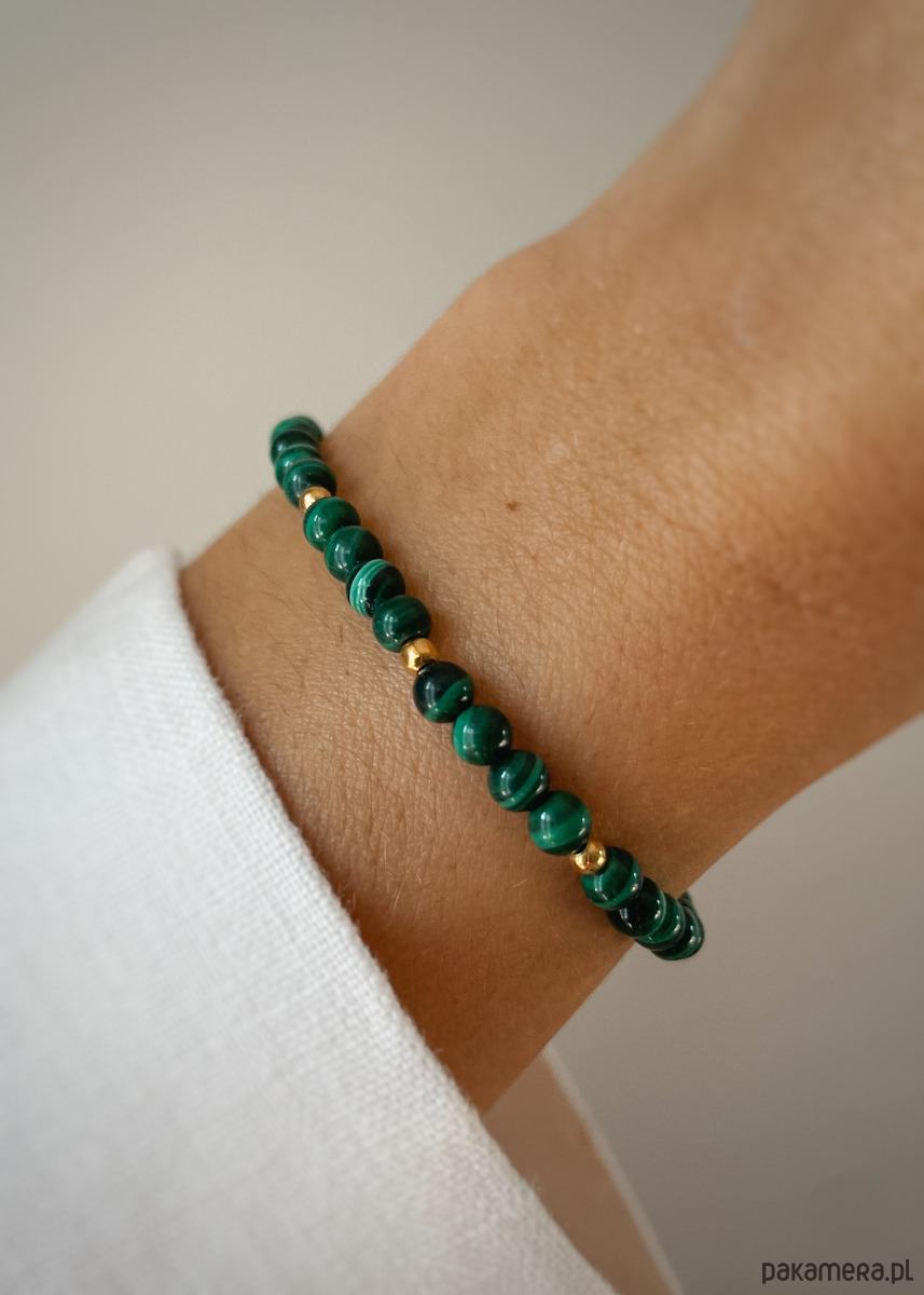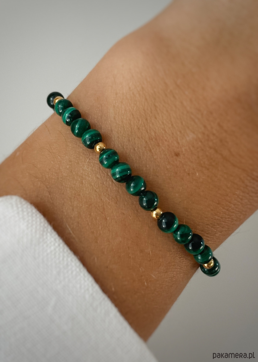 Materiał: wytrzymała elastyczna żyłka jubilerskaZachwyć się intensywną zielenią i hipnotyzującymi wzorami naturalnego malachitu! Ta bransoletka to kwintesencja elegancji i siły natury. Gładka, wypolerowana powierzchnia kamieni pięknie odbija światło. To wyrazisty dodatek, który przyciąga wzrok i dodaje charakteru każdej stylizacji. Ten niezwykły kamień, znany ze swoich głębokich, wirujących odcieni zieleni i unikalnych wzorów, od wieków ceniony jest za swoje właściwości. Malachit uważany jest za potężny kamień ochronny, wspierający zmiany, uzdrawianie emocjonalne i przyciąganie obfitości. Noszenie tej bransoletki może pomóc wzmocnić Twoją wewnętrzną siłę i otworzyć serce na nowe możliwości.