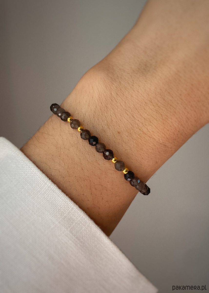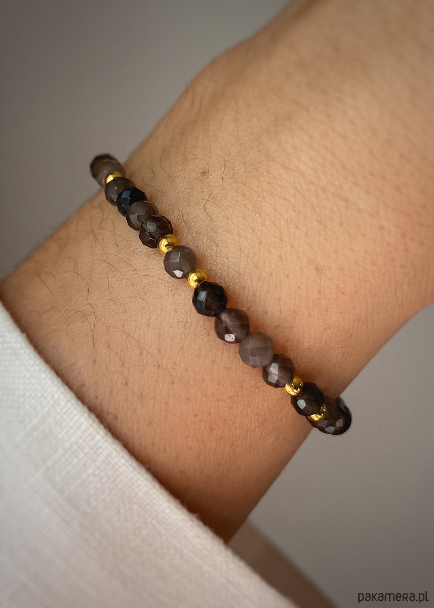 Cechy bransoletki:Kamień: obsydianWielkość kamieni: 4 mm Wielkość kuleczek hematytu: 3 mm Kolor: brązowy, złotyMateriał: wytrzymała elastyczna żyłka jubilerskaMinimalistyczna bransoletka z naturalnego obsydianu na elastycznej gumce – klasyczna elegancja i ochrona odkryj ponadczasowy urok i potężną energię obsydianu w tej klasycznej, minimalistycznej bransoletce. Idealna dla osób ceniących prostotę, elegancję i moc naturalnych kamieni. Doskonale wygląda noszona samodzielnie jako subtelny, elegancki akcent. Świetnie komponuje się z innymi bransoletkami tworząc modne zestawy. Pasuje zarówno do codziennych stylizacji (jeansy, t-shirt), strojów biurowych, jak i bardziej formalnych czy wieczorowych kreacji.Trzy długości bransoletki do wyboru (podane długości to obwody nadgarstka, bransoletka będzie miała około 1 cm więcej):- 15 cm - 16 cm- 17 cmWłaściwość kamieni:Obsydian to kamień ochronny, który chroni przed negatywną energią. Dodaje odwagi, łagodzi niestabilność emocjonalną oraz pomaga zapewnić spokój ducha.Dbaj o biżuterię. Unikaj kontaktu z wodą, detergentami i kosmetykami.Idealna na prezent