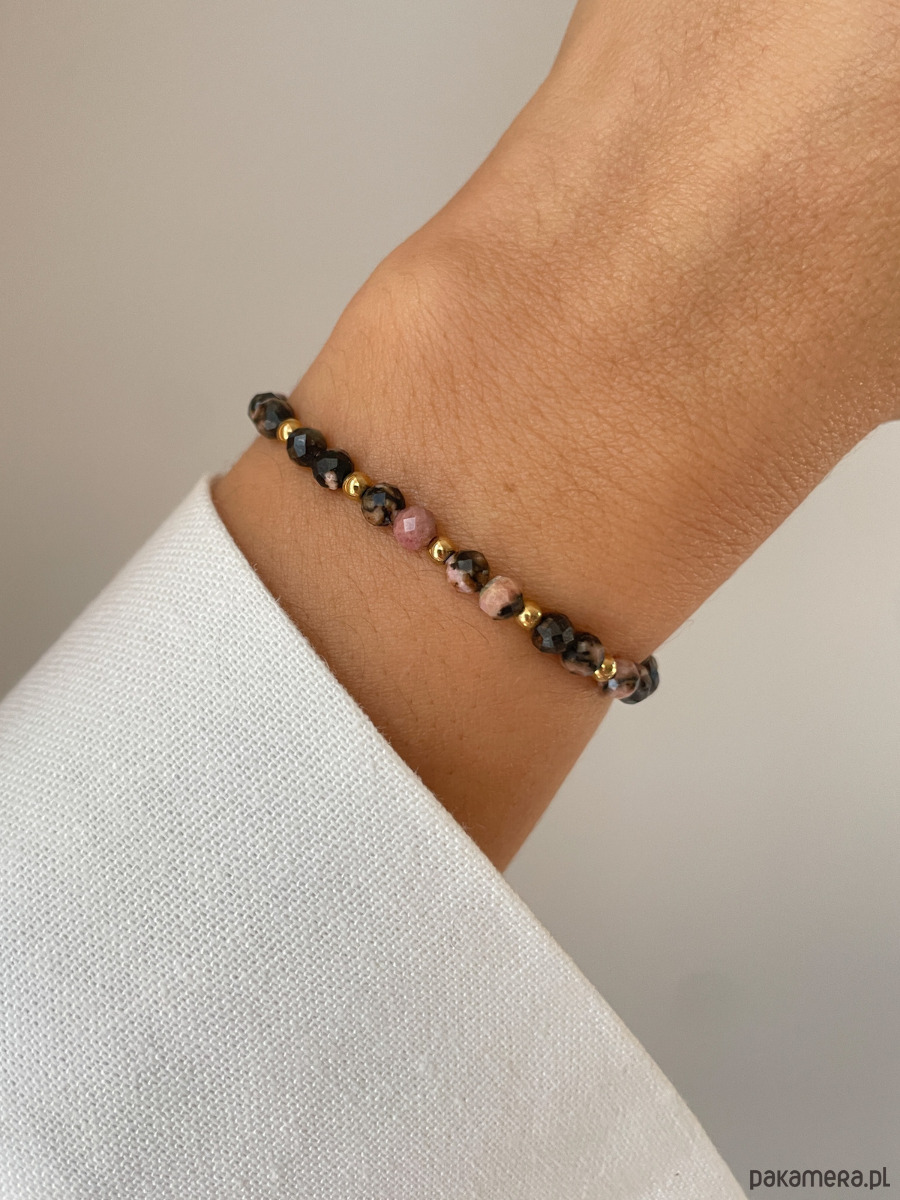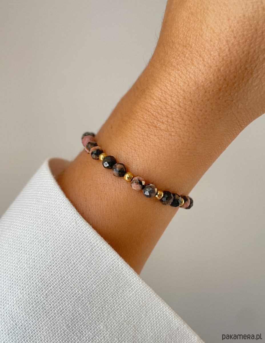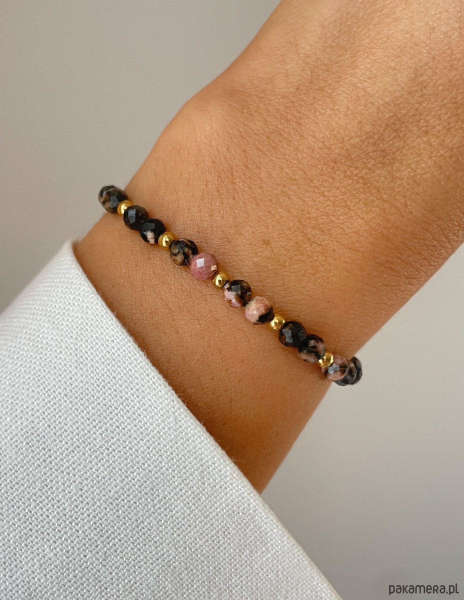 Cechy bransoletki:Kamień: rodonit, hematyt (kolor złoty)Wielkość kamienia rodonit, kulka fasetowana: ok. 4 mm Wielkość kamienia hematyt: ok. 2,5-3 mm Kolor: różowy z wtrąceniami, złoty Materiał: wytrzymała elastyczna żyłka jubilerska