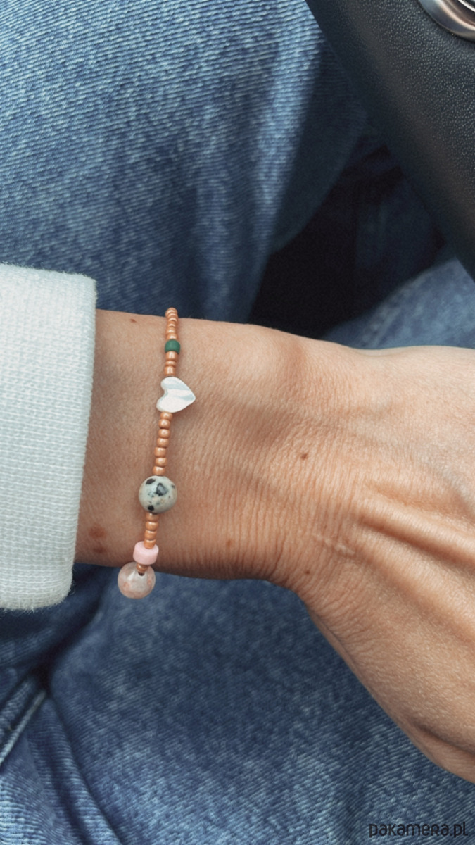 Bransoletka wykonana własnoręcznie ze szklanych koralików, jaspisu dalmatyńskiego, masy perłowej i elastycznej żyłki jubilerskiej.