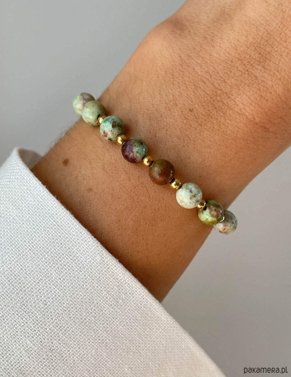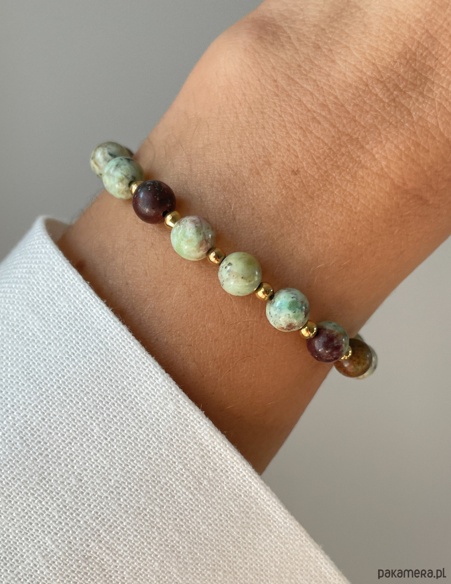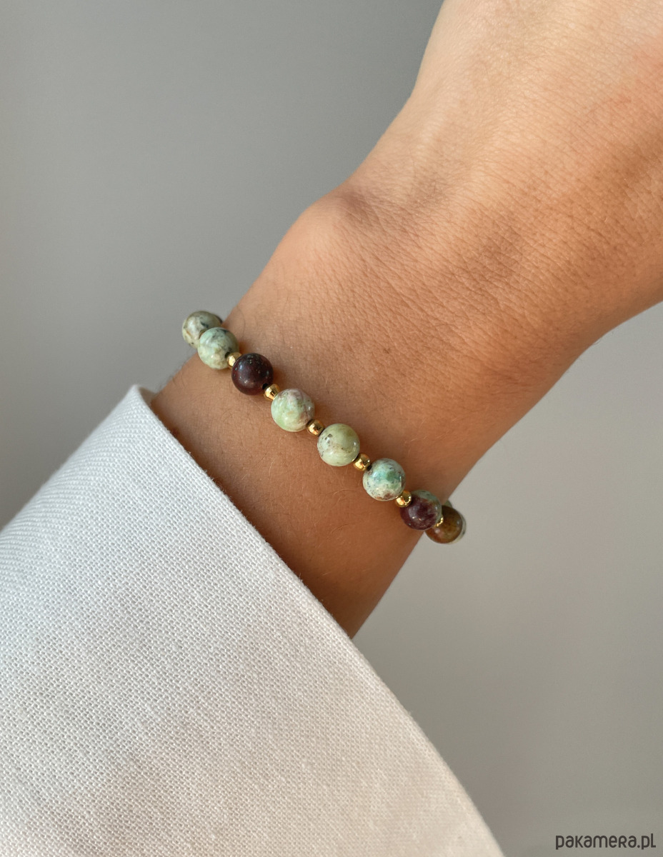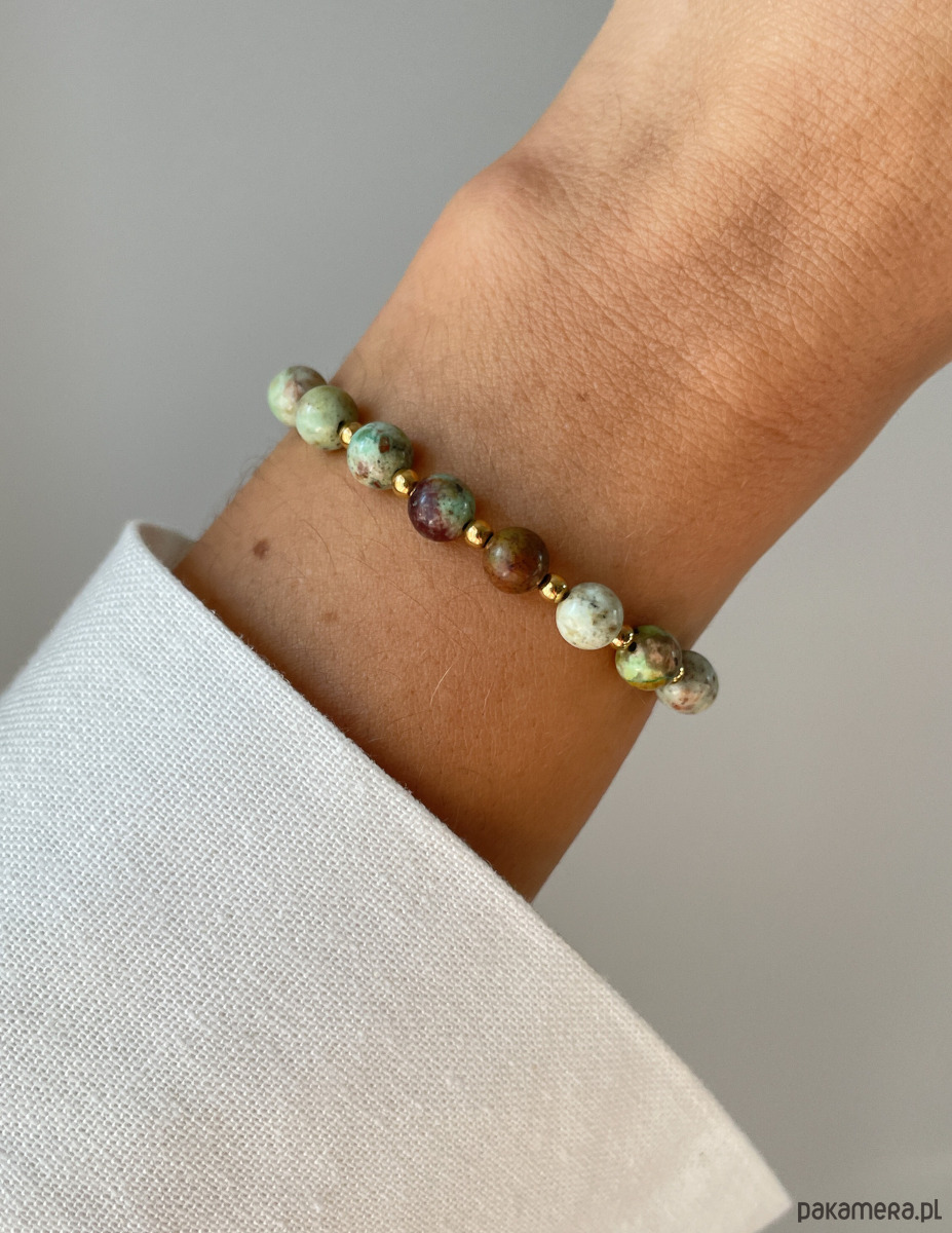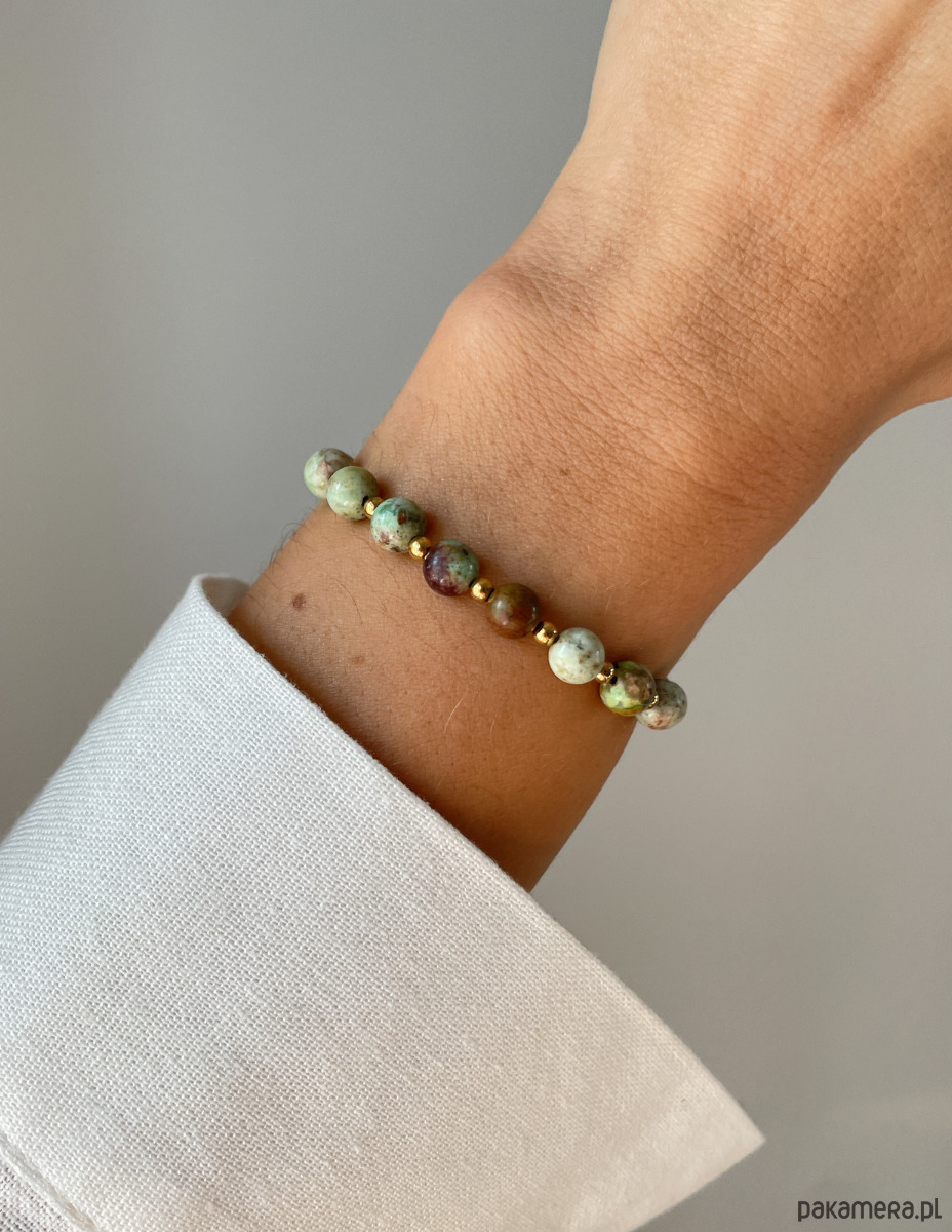 Cechy bransoletki:Kamień: turkus afrykański, hematyt (kolor złoty)Wielkość turkus afrykański - kulka gładka: ok. 6 mm Wielkość kamienia hematyt: ok. 2,5-3 mm Kolor: zielony z wtrąceniami, złoty Materiał: wytrzymała elastyczna żyłka jubilerska