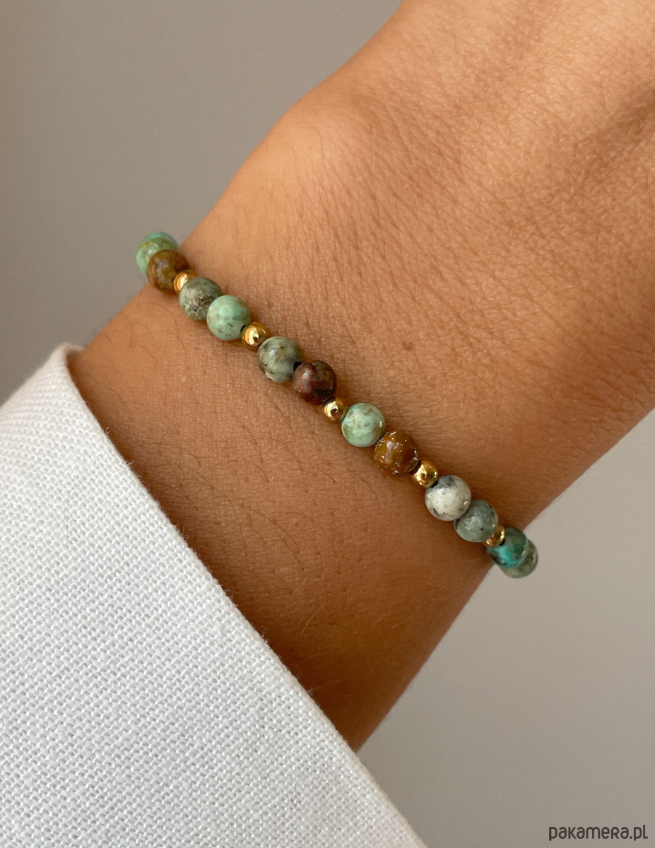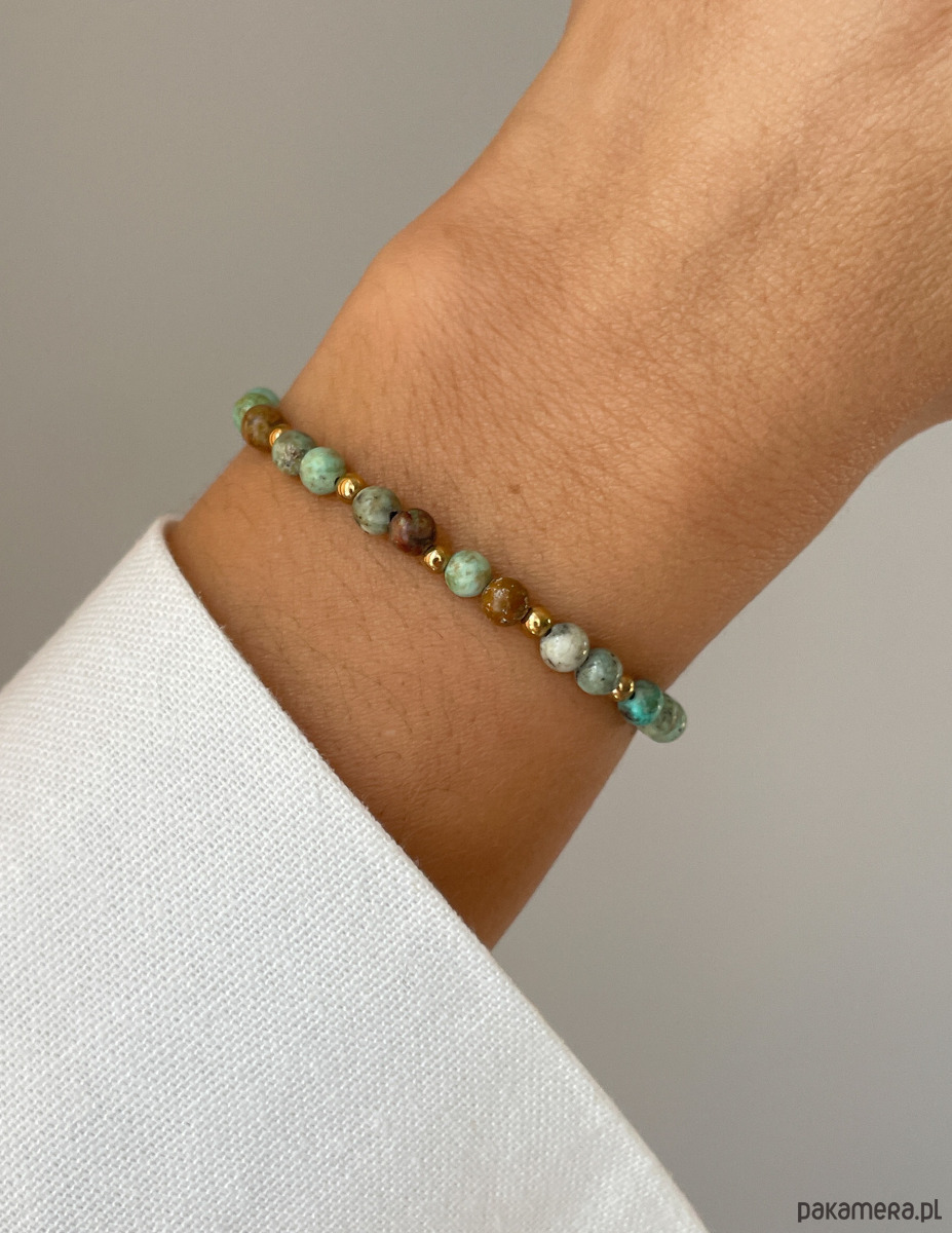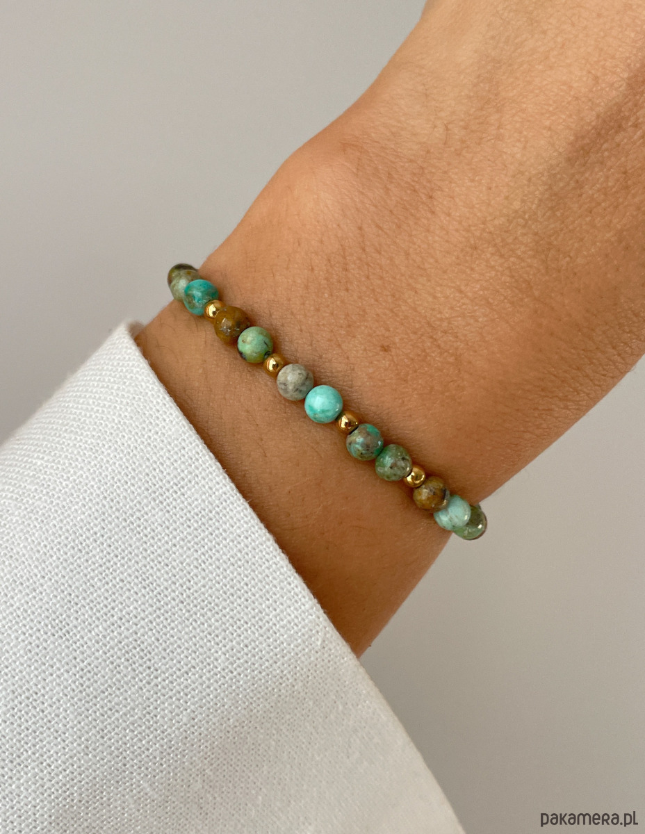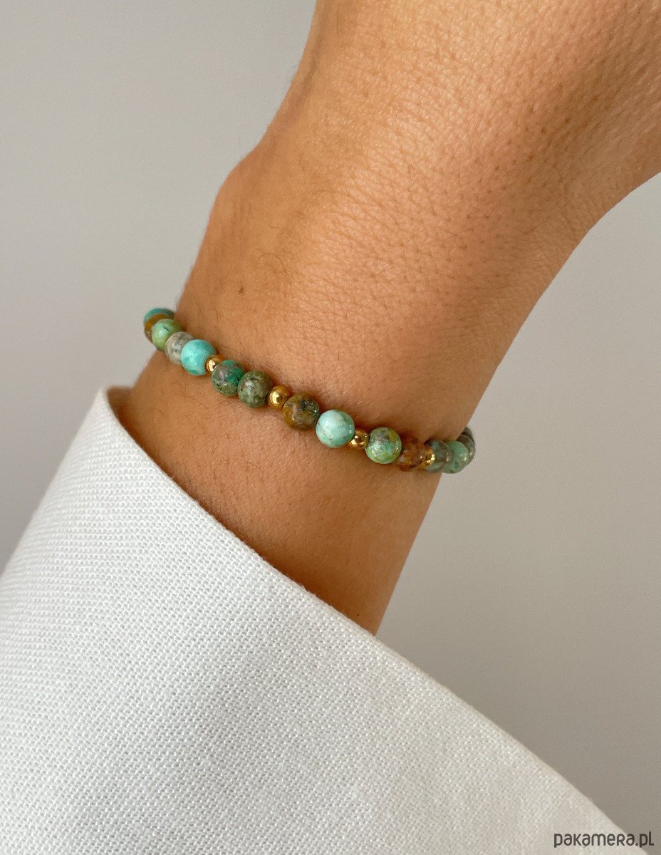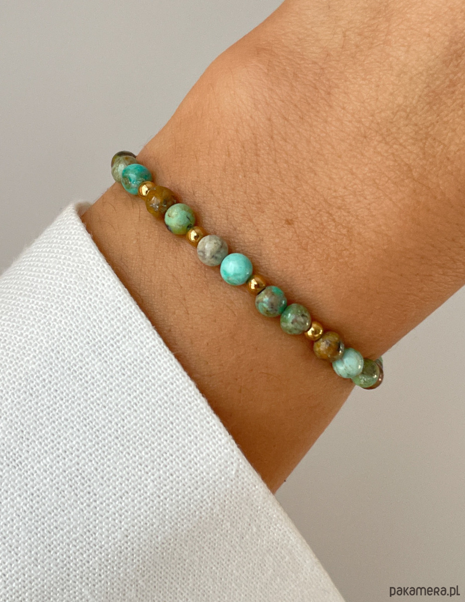 Cechy bransoletki:Kamień: turkus afrykański, hematyt (kolor złoty)Wielkość turkus afrykański - kulki gładkie: ok. 4 mm Wielkość kamienia hematyt: ok. 2,5-3 mm Kolor: zielony z wtrąceniami, złoty Materiał: wytrzymała elastyczna żyłka jubilerska