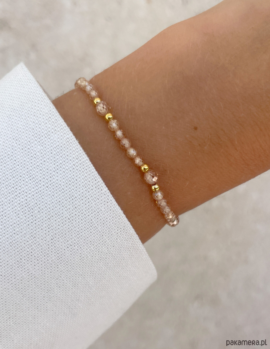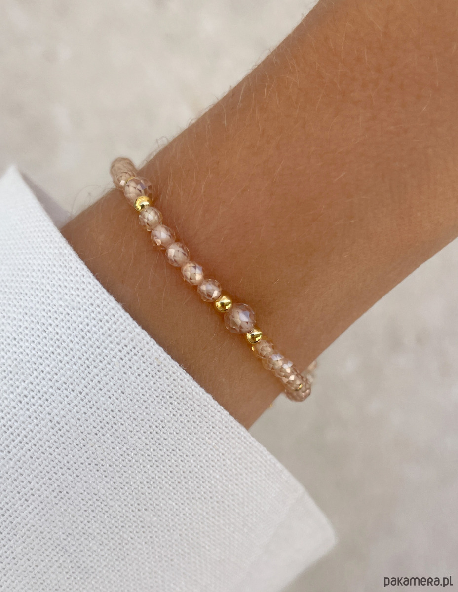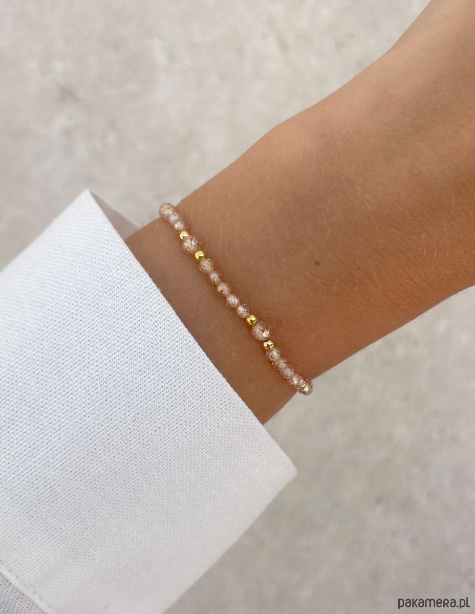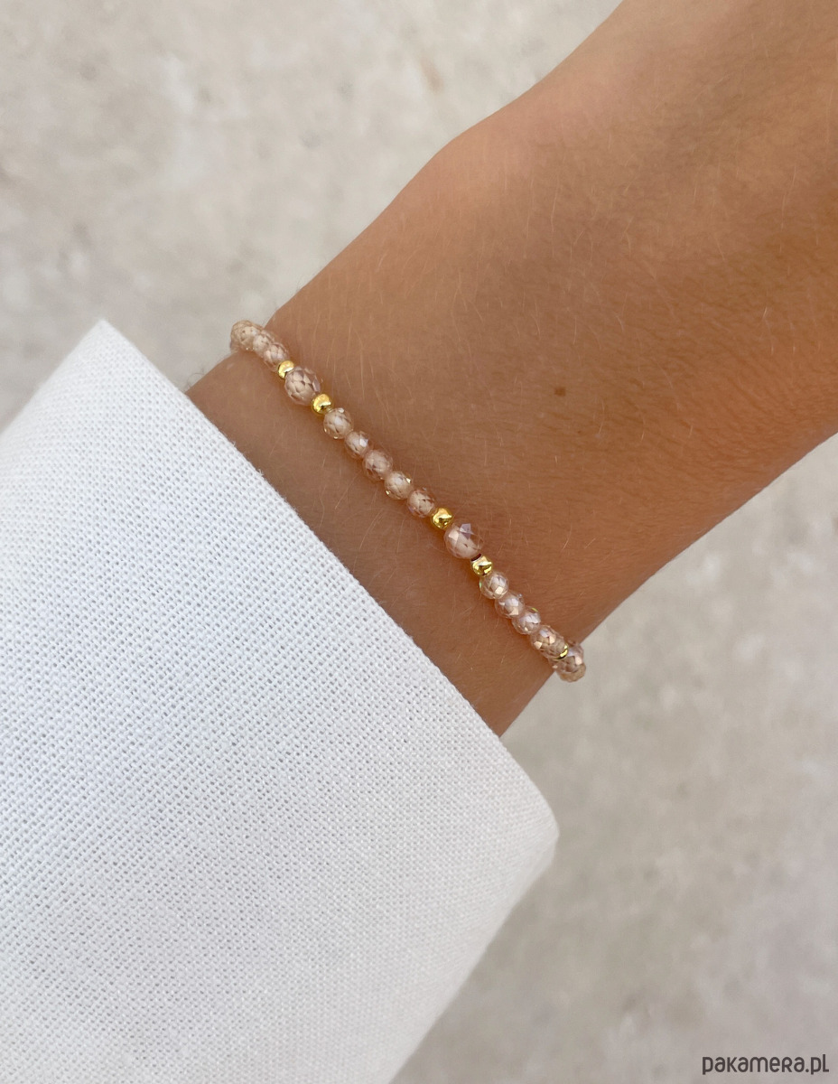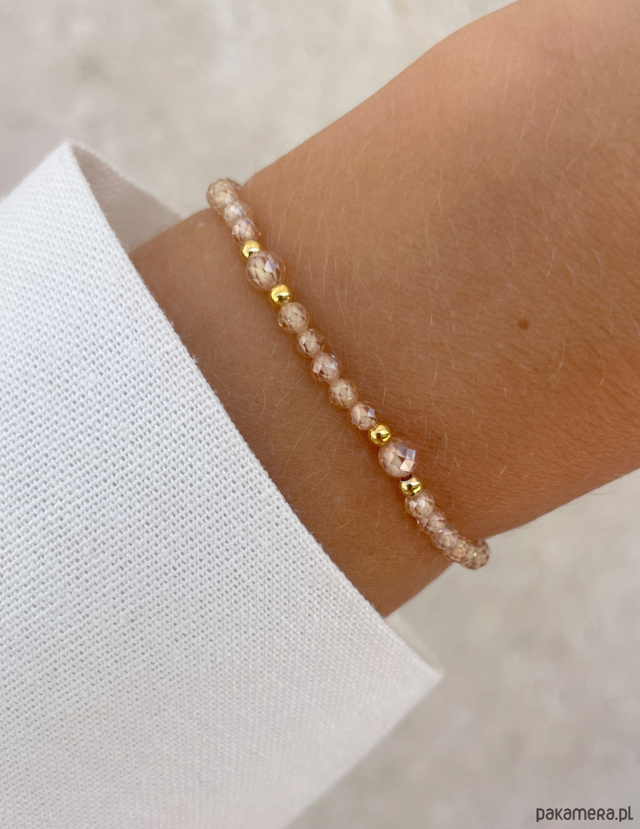 Bransoletka została wykonana z fasetowanych kuleczek cyrkonii szampańskiej o średnicy około 4 mm i 3 mm. Ich powierzchnia zachwyca niepowtarzalnymi, szampańskimi odcieniami, co sprawia, że każdy kamień jest jedyny w swoim rodzaju. Wzór dopełniają lśniące, złote kuleczki z hematytu o średnicy około 3 mm, które nadają całości wyrafinowanego i nowoczesnego charakteru. Dzięki wykorzystaniu wytrzymałej, elastycznej żyłki jubilerskiej, bransoletka jest nie tylko piękna, ale także niezwykle komfortowa w noszeniu.