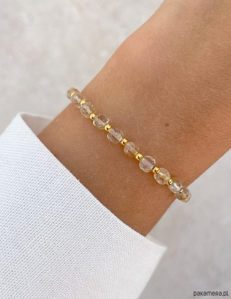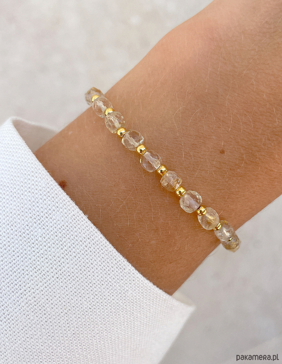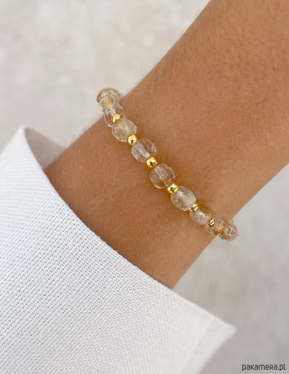 Cechy bransoletki:Kamień: cytrynWielkość kamieni cytryn: kształt kamienia: kostka fasetowana ok. 4 mm Kolor: złoty, żółty, przezroczystyMateriał: wytrzymała elastyczna żyłka jubilerska