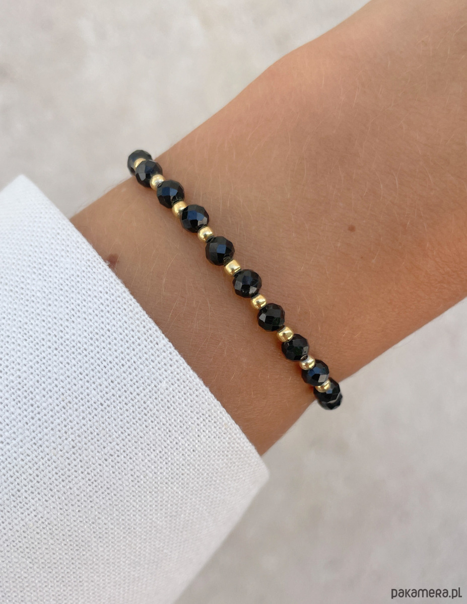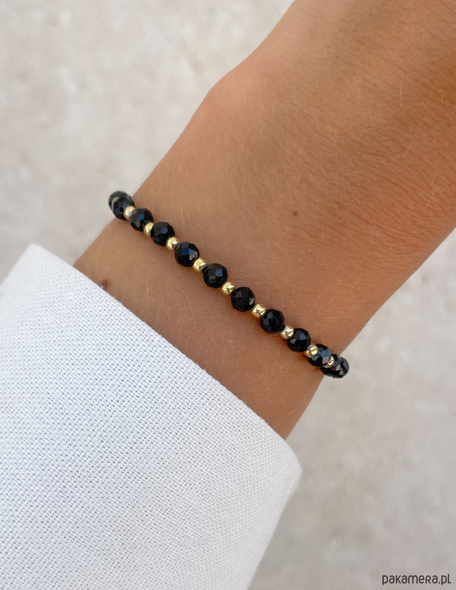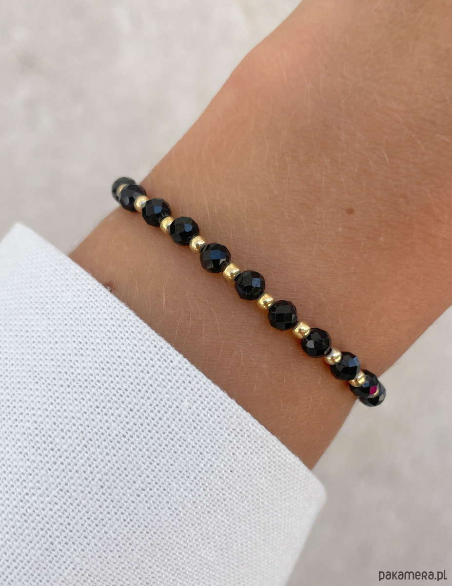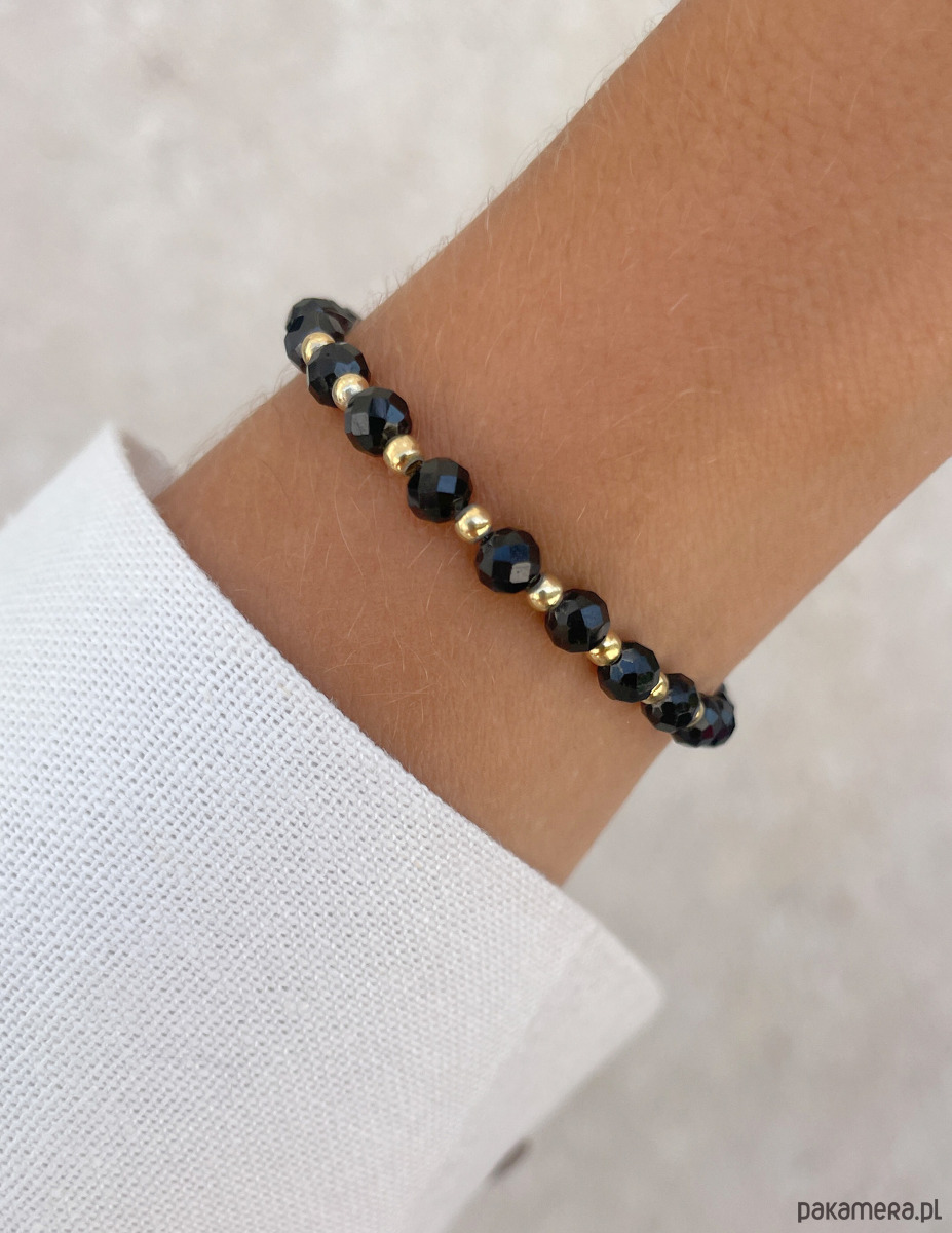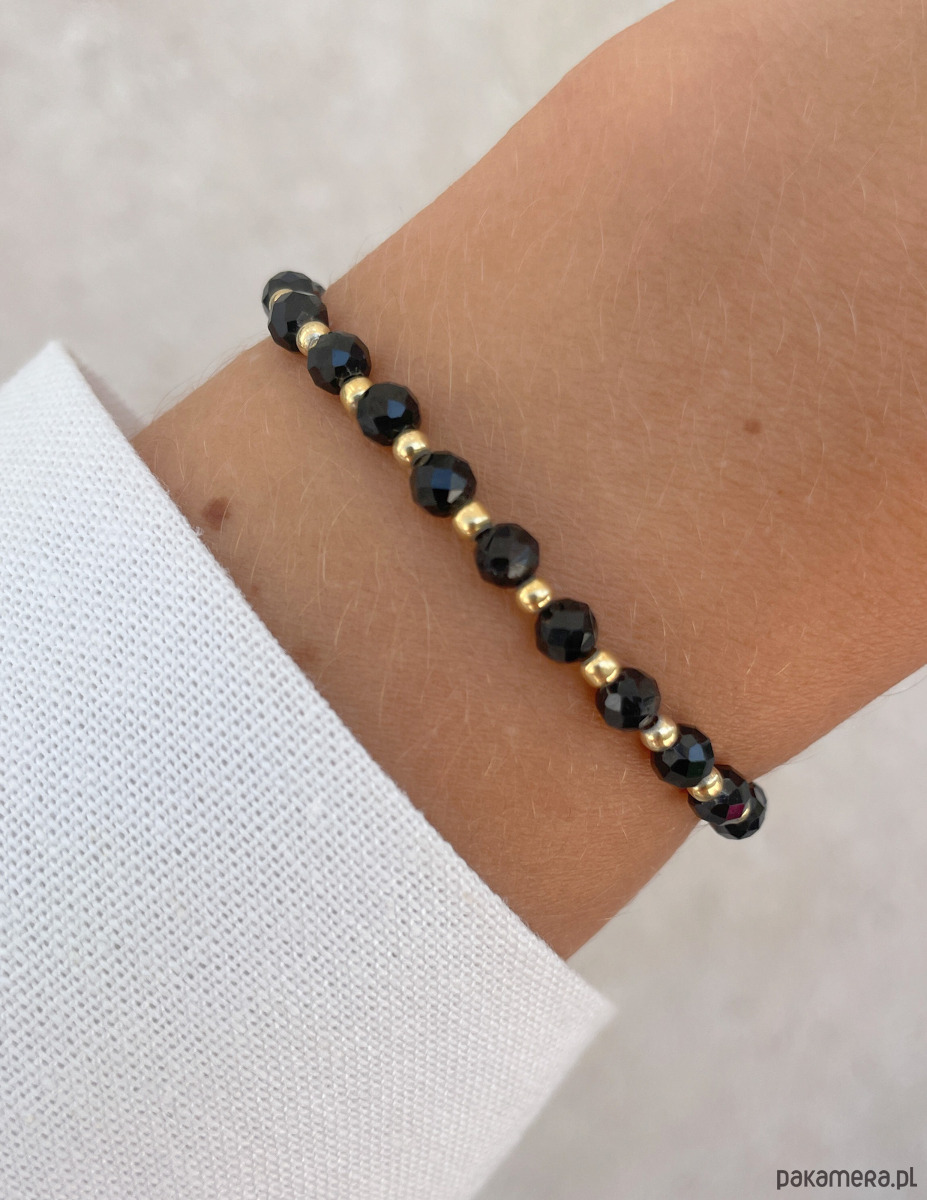Bransoletka została wykonana z fasetowanych kuleczek czarnego turmalinu o średnicy około 4 mm. Ich powierzchnia zachwyca intensywną, głęboką czernią, co sprawia, że każdy kamień jest jedyny w swoim rodzaju. Wzór dopełniają lśniące, złote kuleczki z hematytu o średnicy około 3 mm, które nadają całości wyrafinowanego i nowoczesnego charakteru. Dzięki wykorzystaniu wytrzymałej, elastycznej żyłki jubilerskiej, bransoletka jest nie tylko piękna, ale także niezwykle komfortowa w noszeniu.