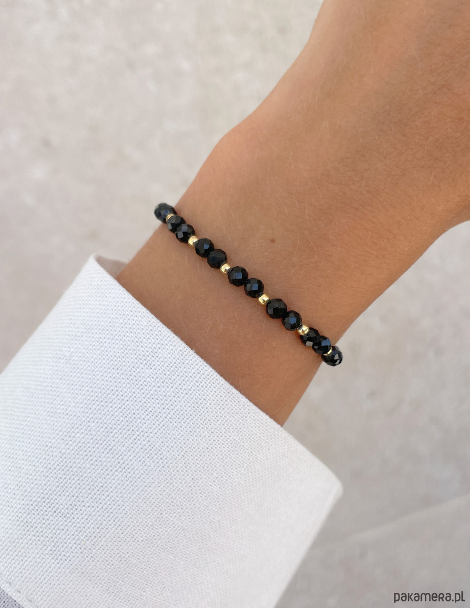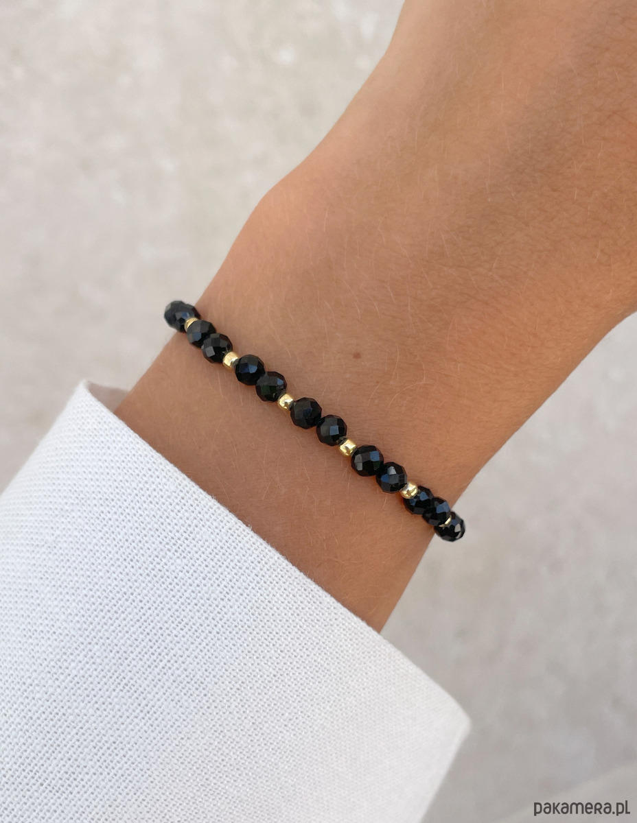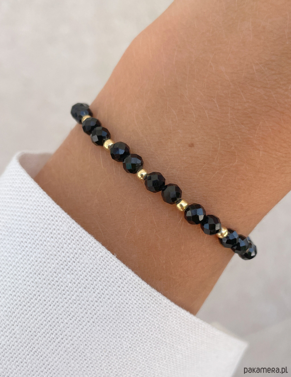 Bransoletka została wykonana z fasetowanych kuleczek czarnego turmalinu o średnicy około 4 mm. Ich powierzchnia zachwyca intensywną, głęboką czernią, co sprawia, że każdy kamień jest jedyny w swoim rodzaju. Wzór dopełniają lśniące, złote kuleczki z hematytu o średnicy około 3 mm, które nadają całości wyrafinowanego i nowoczesnego charakteru. Dzięki wykorzystaniu wytrzymałej, elastycznej żyłki jubilerskiej, bransoletka jest nie tylko piękna, ale także niezwykle komfortowa w noszeniu.