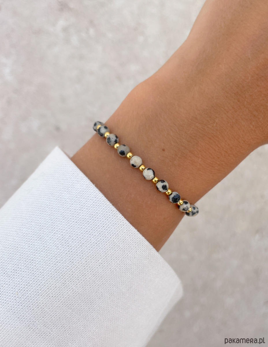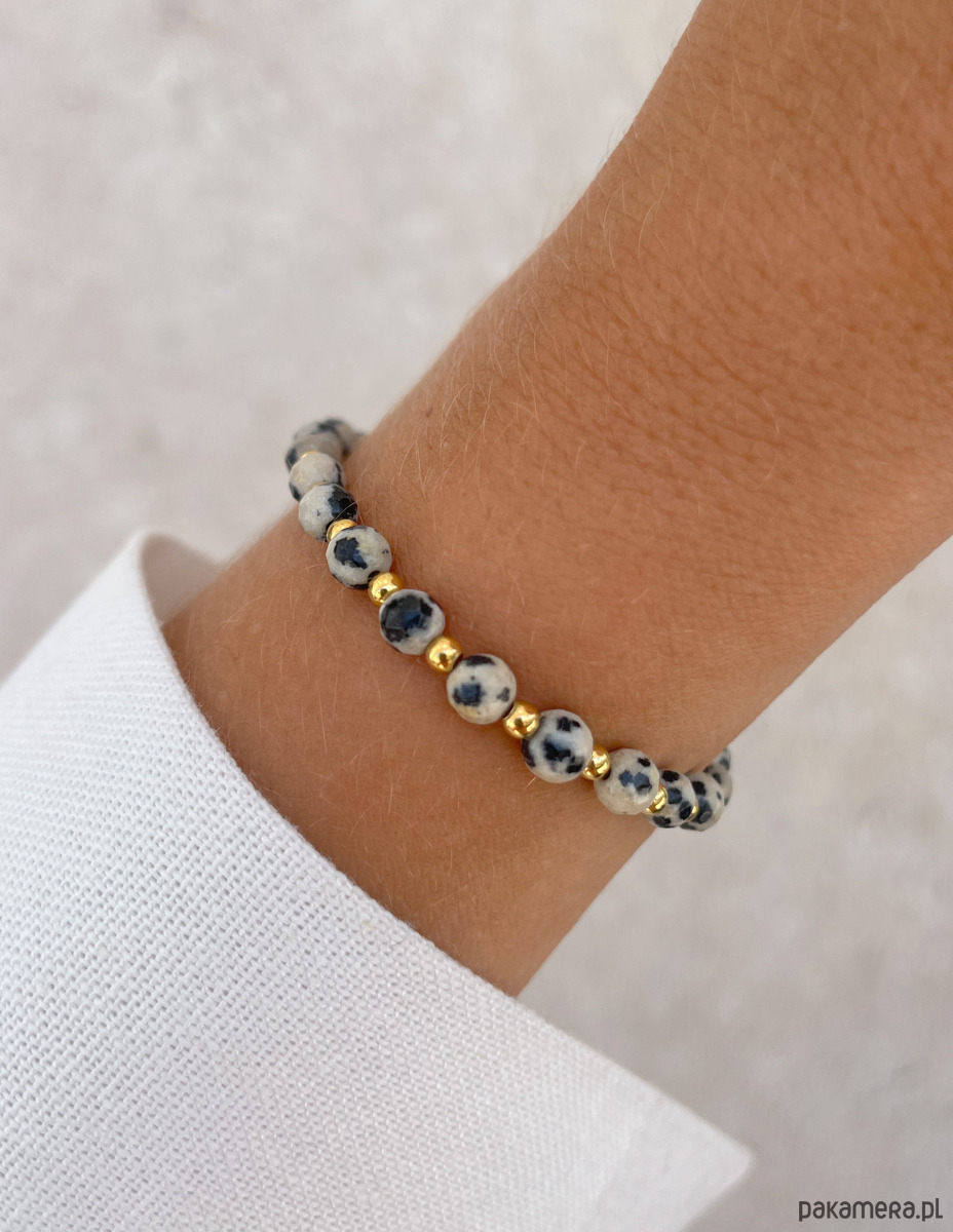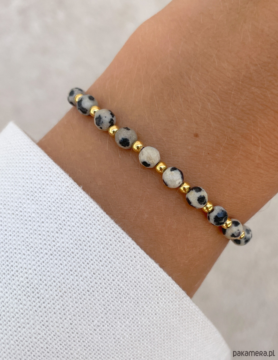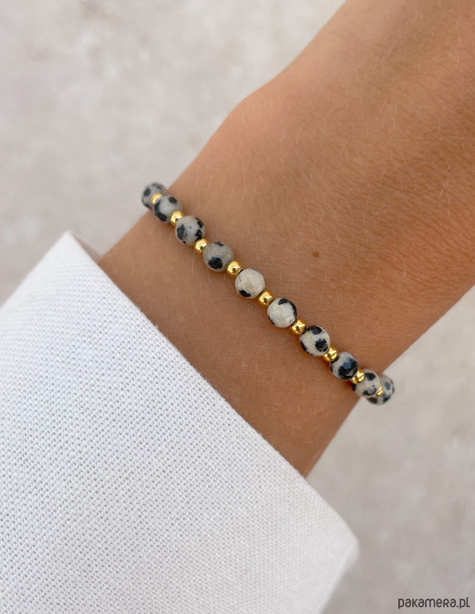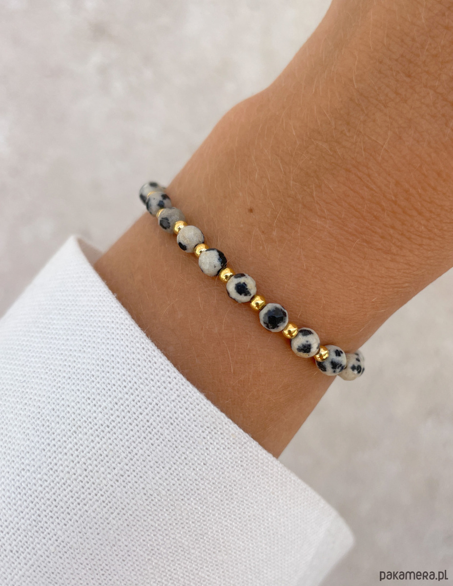 Bransoletka została wykonana z fasetowanych kuleczek jaspisu dalmatyńskiego o średnicy około 4 mm. Ich intrygująca, biało-czarna kolorystyka, przypominająca sierść dalmatyńczyka, sprawia, że każdy kamień jest niepowtarzalny. Wzór dopełniają lśniące, złote kuleczki z hematytu o średnicy około 2,5 mm, które nadają całości wyrafinowanego i nowoczesnego charakteru. Dzięki wykorzystaniu wytrzymałej, elastycznej żyłki jubilerskiej, bransoletka jest nie tylko piękna, ale także niezwykle komfortowa w noszeniu.