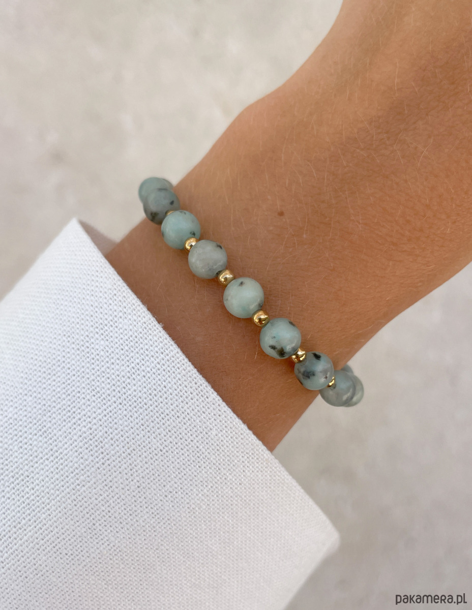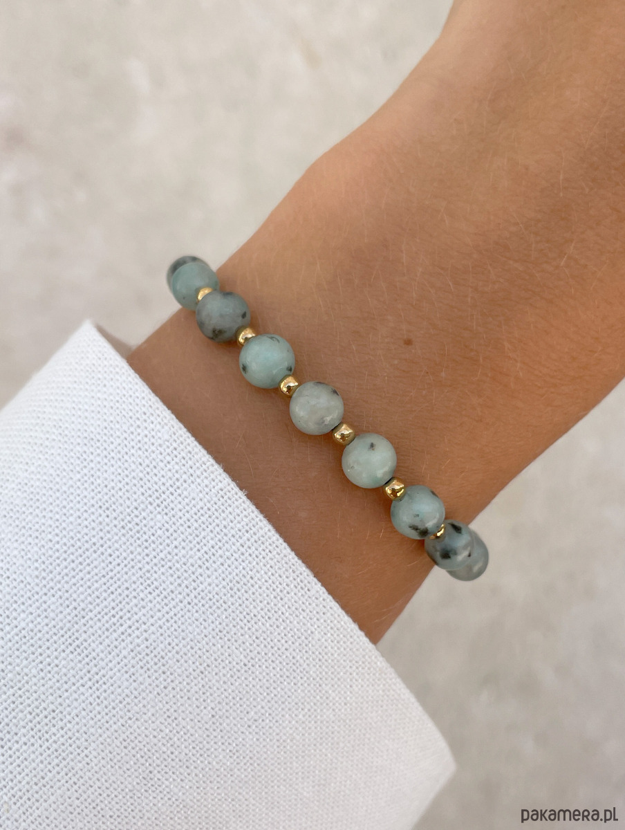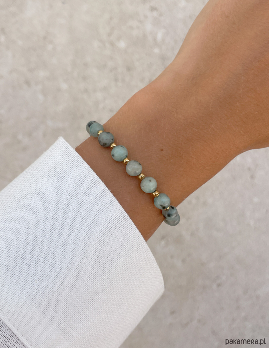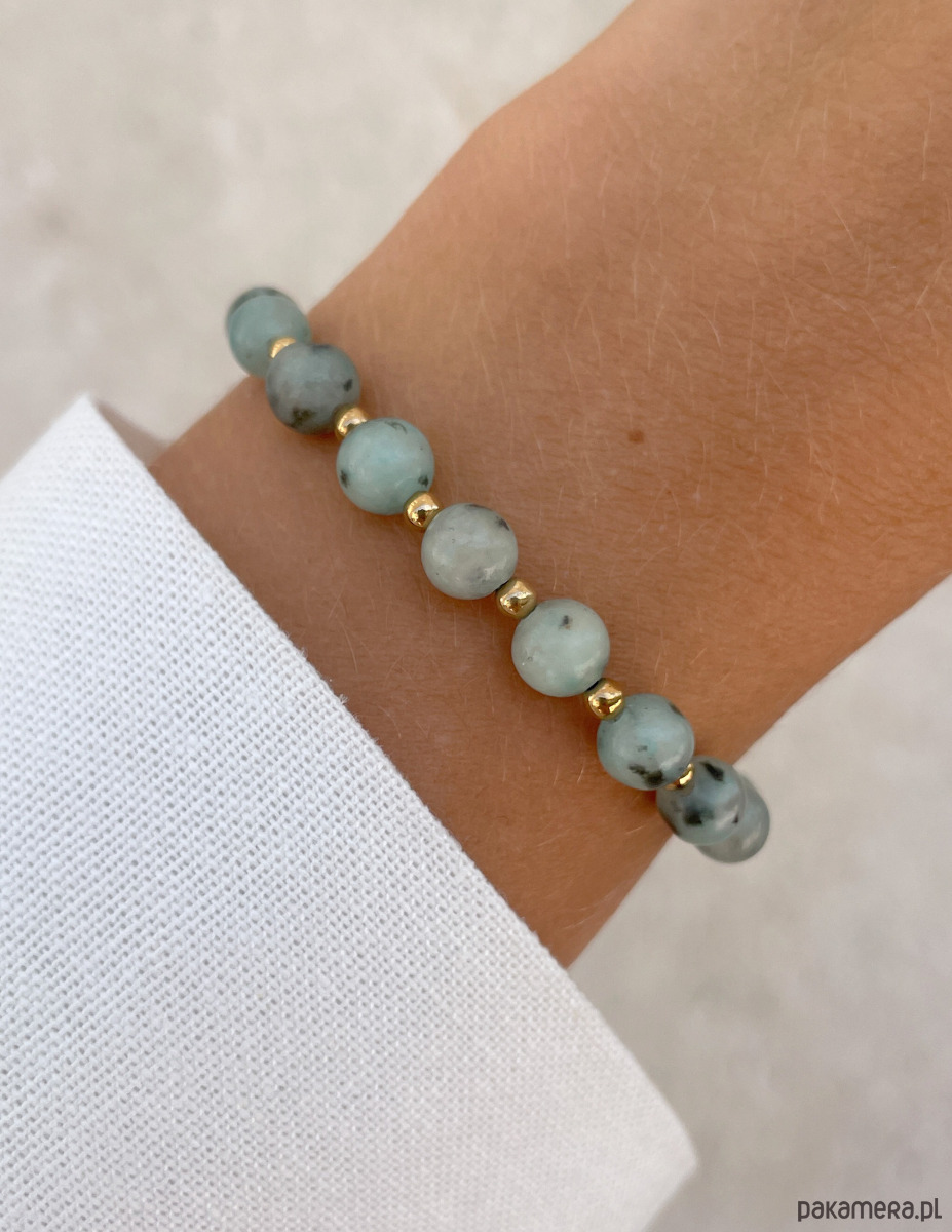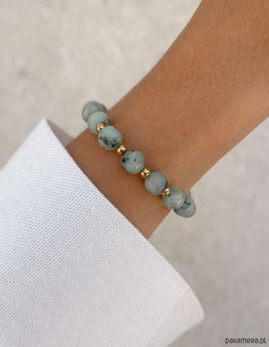 Bransoletka została wykonana z gładkich kuleczek jaspisu kiwi o średnicy około 6 mm. Ich powierzchnia zachwyca niepowtarzalnymi, jasnoniebieskozielonymi odcieniami z czarnymi wtrąceniami, co sprawia, że każdy kamień jest jedyny w swoim rodzaju. Wzór dopełniają lśniące, złote kuleczki z hematytu o średnicy około 3 mm, które nadają całości wyrafinowanego i nowoczesnego charakteru. Dzięki wykorzystaniu wytrzymałej, elastycznej żyłki jubilerskiej, bransoletka jest nie tylko piękna, ale także niezwykle komfortowa w noszeniu.
