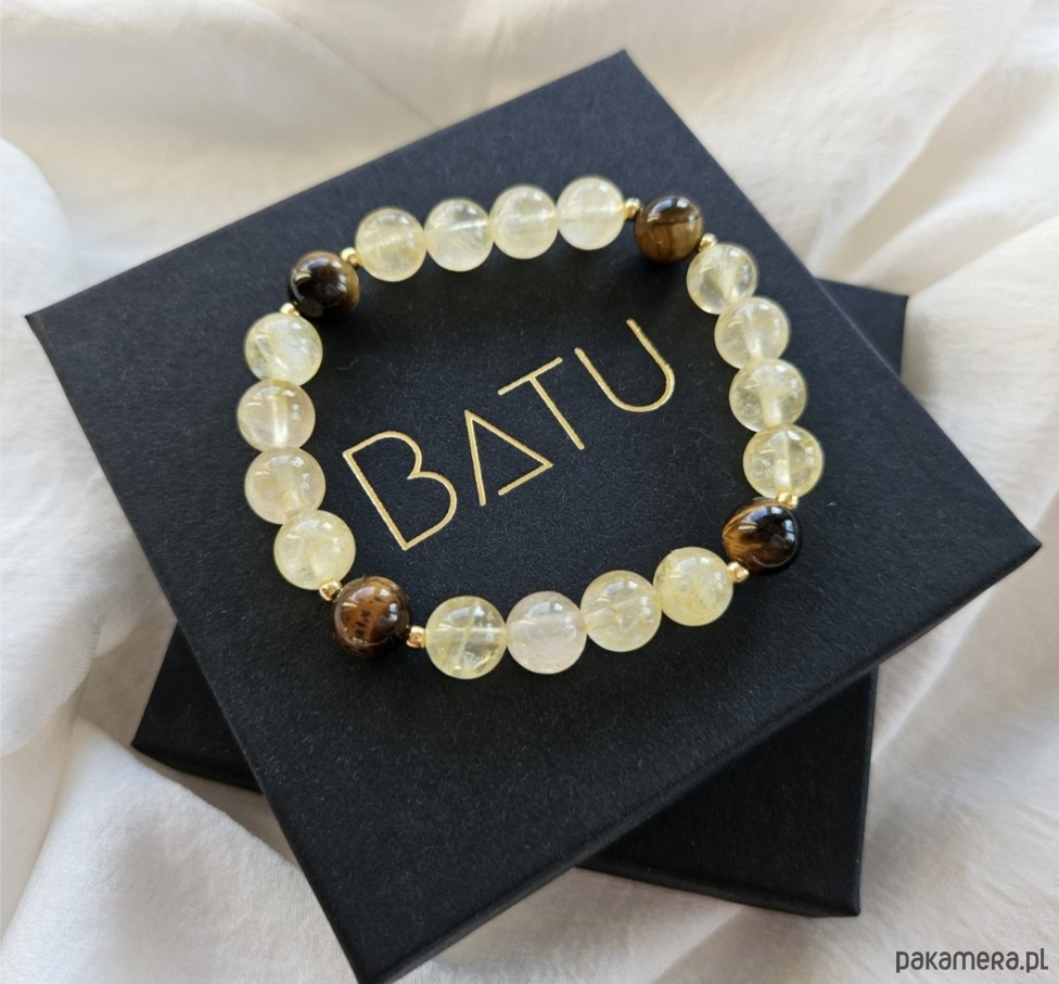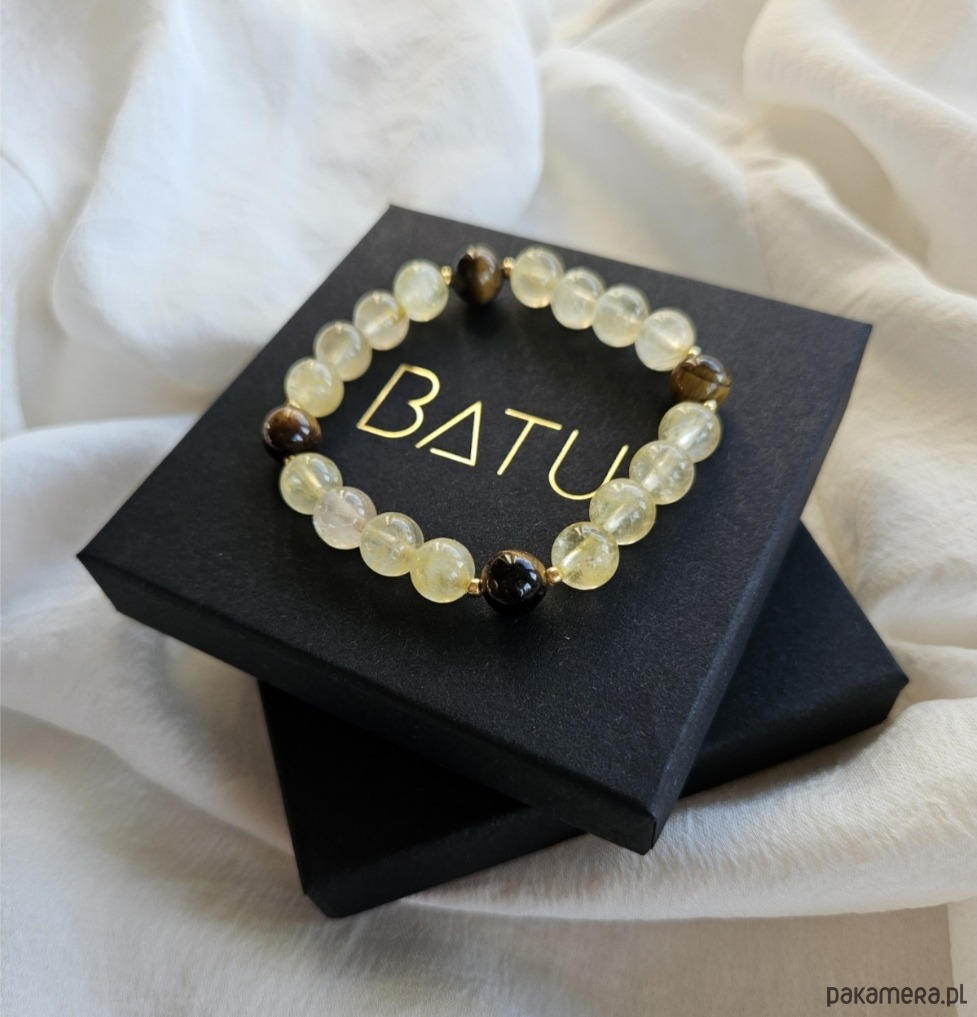 Elegancka, ręcznie wykonana męska bransoletka z kamieni naturalnych, łącząca w sobie energię słońca i siłę ziemi. Model „Siła Światła” to harmonijne połączenie złocisto-żółtego cytryn oraz głębokiego brązu bawole oko, ozdobione eleganckimi dodatkami z pozłacanego srebra. Całość została nawleczona na wysokiej jakości elastyczną gumkę, co zapewnia komfort noszenia i idealne dopasowanie do nadgarstka.